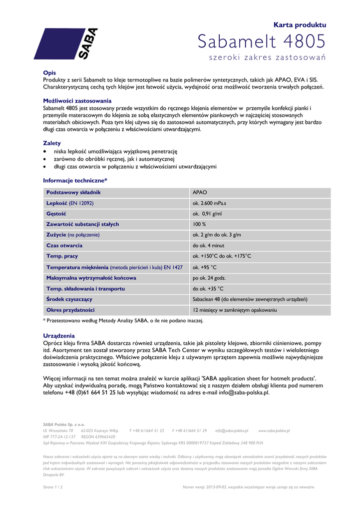Karta produktu Sabamelt 4805 szeroki zakres zastosowań Opis Produkty z serii Sabamelt to kleje termotopliwe na bazie polimerów syntetycznych, takich jak APAO, EVA i SIS. Charakterystyczną cechą tych klejów jest łatwość użycia, wydajność oraz możliwość tworzenia trwałych połączeń. Możliwości zastosowania Sabamelt 4805 jest stosowany przede wszystkim do ręcznego klejenia elementów w przemyśle konfekcji pianki i przemyśle materacowym do klejenia ze sobą elastycznych elementów piankowych w najczęściej stosowanych materiałach obiciowych. Poza tym klej używa się do zastosowań automatycznych, przy których wymagany jest bardzo długi czas otwarcia w połączeniu z właściwościami utwardzającymi. Zalety • niska lepkość umożliwiająca wyjątkową penetrację • zarówno do obróbki ręcznej, jak i automatycznej • długi czas otwarcia w połączeniu z właściwościami utwardzającymi Informacje techniczne* Podstawowy składnik APAO Lepkość (EN 12092) ok. 2.600 mPa.s Gęstość ok. 0,91 g/ml Zawartość substancji stałych 100 % Zużycie (na połączenie) ok. 2 g/m do ok. 3 g/m Czas otwarcia do ok. 4 minut Temp. pracy ok. +150°C do ok. +175°C Temperatura mięknienia (metoda pierścień i kula) EN 1427 ok. +95 °C Maksymalna wytrzymałość końcowa po ok. 24 godz. Temp. składowania i transportu do ok. +35 °C Środek czyszczący Sabaclean 48 (do elementów zewnętrznych urządzeń) Okres przydatności 12 miesięcy w zamkniętym opakowaniu * Przetestowano według Metody Analizy SABA, o ile nie podano inaczej. Urządzenia Oprócz kleju firma SABA dostarcza również urządzenia, takie jak pistolety klejowe, zbiorniki ciśnieniowe, pompy itd. Asortyment ten został stworzony przez SABA Tech Center w wyniku szczegółowych testów i wieloletniego doświadczenia praktycznego. Właściwe połączenie kleju z używanym sprzętem zapewnia możliwie najwydajniejsze zastosowanie i wysoką jakość końcową. Więcej informacji na ten temat można znaleźć w karcie aplikacji 'SABA application sheet for hotmelt products'. Aby uzyskać indywidualną poradę, mogą Państwo kontaktować się z naszym działem obsługi klienta pod numerem telefonu +48 (0)61 664 51 25 lub wysyłając wiadomość na adres e-mail [email protected]. SABA Polska Sp. z o.o. Ul. Wrzesińska 70 62-025 Kostrzyn Wlkp. T +48 61/664 51 25 F +48 61/664 51 29 [email protected] www.saba-polska.pl NIP 777-24-12-137 REGON 639665420 Sąd Rejonowy w Poznaniu Wydział XXI Gospodarczy Krajowego Rejestru Sądowego KRS 0000019737 Kapitał Zakładowy 248 900 PLN Nasze zalecenia i wskazówki użycia oparte są na obecnym stanie wiedzy i techniki. Odbiorcy i użytkownicy mają obowiązek samodzielnie ocenić przydatność naszych produktów pod kątem indywidualnych zastosowań i wymagań. Nie ponosimy jakiejkolwiek odpowiedzialności w przypadku stosowania naszych produktów niezgodnie z naszymi zaleceniami i/lub wskazówkami użycia. W zakresie powyższych zaleceń i wskazówek użycia oraz dostawy naszych produktów zastosowanie mają ponadto Ogólne Warunki firmy SABA Dinxperlo BV. Strona 1 / 2 Numer wersji: 2013-09-03, wszystkie wcześniejsze wersje uznaje się za nieważne Karta produktu Sabamelt 4805 szeroki zakres zastosowań Sposób zastosowania Nakładać klej o odpowiedniej temperaturze topnienia. Nakładać klej jednostronnie, połączyć w czasie otwarcia (pracy) kleju i docisnąć. Czas docisku ma wpływ na umożliwienie szybkiej dalszej obróbki części klejonych. Dłuższy czas docisku daje od razu większą wytrzymałość po docisku. • przy nakładaniu na krawędzie zalecany Ø dyszy wynosi 1,5 mm. • odległość między dyszą a klejonym podłożem przy automatycznym nakładaniu na krawędzie wynosi ok. 3 cm • dociskaj tak długo, jak tylko jest to możliwe w procesie, w każdym razie minimalnie przez 30 sekund w przypadku połączeń na które działają napięcia Bezpieczeństwo Firma SABA przywiązuje dużą wagę do bezpiecznego użycia swoich produktów oraz odpowiedzialnego postępowania z nimi. Więcej informacji na temat bezpieczeństwa można znaleźć w odpowiedniej karcie informacji o bezpieczeństwie firmy SABA. Ważne! Produkty na bazie polimerów APAO, EVA i SIS nie są odporne na plastyfikatory. Na potrzeby klejenia podłoży, które zawierają plastyfikator, np. sztucznej skóry, firma SABA oferuje specjalne produkty. Prosimy o kontakt w celu uzyskania dalszych informacji. Na czas otwarcia (pracy)mają duży wpływ zarówno metoda aplikacji, jak i czynniki zewnętrzne. Przy metodach aplikacji z użyciem powietrza (m.in. natrysk spiralny, metoda natryskowa) oraz metodach, gdy klej nanoszony jest bardzo cienką warstwą (m.in. systemem rolek)czas otwarcia ulega (znacznemu) skróceniu. Również czynniki zewnętrzne, takie jak przeciąg (otwarte drzwi) oraz podłoża bardzo zimne lub mocno przewodzące ciepło, mogą skrócić czas otwarcia. By utrzymać Państwa urządzenia w optymalnym stanie, zalecamy pilnowanie, by temperatura kleju nie przekroczyła zalecanej temperatury pracy kleju. Przy bardzo wysokich temperaturach kleje termotopliwe szybciej się starzeją, co pociąga za sobą konieczność częstszego czyszczenia. W przypadku konieczności oczyszczenia Państwa urządzeń, zalecamy naszą procedurę czyszczenia: „SABA Hotmelt Cleaning Procedure”. W celu uzyskania optymalnych rezultatów wszystkie klejone powierzchnie muszą być wyczyszczone, osuszone i odtłuszczone, a ich temperatura powinna odpowiadać wymaganej temperaturze pracy produktu. W przypadku wilgotności względnej powyżej 70% istnieje zwiększone ryzyko skraplania się pary, co może negatywnie wpływać na końcową jakość połączenia. Kontakt Nasz dział obsługi klienta chętnie odpowie na wszystkie Państwa pytania. Prosimy dzwonić pod numer +48 (0) 61 664 51 25 lub pisać na adres e-mail [email protected]. SABA Polska Sp. z o.o. Ul. Wrzesińska 70 62-025 Kostrzyn Wlkp. T +48 61/