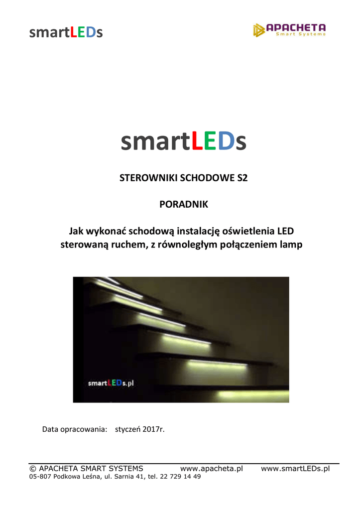 smartLEDs smartLEDs STEROWNIKI SCHODOWE S2 PORADNIK Jak wykonać schodową instalację oświetlenia LED sterowaną ruchem, z równoległym połączeniem lamp Data opracowania: styczeń 2017r. © APACHETA SMART SYSTEMS www.apacheta.pl 05-807 Podkowa Leśna, ul. Sarnia 41, tel. 22 729 14 49 www.smartLEDs.pl Poradnik instalacja schodowa z równoległym połączeniem lamp v1.0 smartLEDs 1 Podświetlane schody LED - nowoczesna i bezpieczna instalacja w domu Podświetlane schody LED, sterowane za pomocą inteligentnych sterowników schodowych oświetlenia LED, to niezwykle dekoracyjne, a przy tym bardzo praktyczne rozwiązanie, bez którego nie może się obyć nowoczesna instalacja elektryczna w domu. Szczególnie dekoracyjne jest podświetlenie stopni schodowych taśmą ledową oraz płynne włączanie i wyłączanie oświetlenia schodów. 2 Podświetlane schody LED - przygotowanie W tym opracowaniu doradzam, jak zaplanować, wykonać i uruchomić typową instalację elektryczną inteligentnego oświetlenia LED schodów, z równoczesnym płynnym zapalaniem i gaszeniem oświetlenia schodów (jeżeli interesuje cię instalacja, w której poszczególne lampy są zapalane płynnie i po kolei (czyli z efektem „fali świetlnej”) potrzebujesz innego poradnika, również dostępnego na stronie smartLEDs.pl). Aby ułatwić ci zrozumienie opisanej instalacji, narysowałem szczegółowy schemat montażowy pełnej instalacji schodowej z równoległym połączeniem lamp (do ściągnięcia z zakładki "DO POBRANIA" na stronie firmowego sklepu internetowego http://smartLEDs.pl). Oczywiście, możliwych rozwiązań instalacyjnych może być dużo więcej. Jeżeli nie masz schodów z półpiętrem, nie potrzebujesz instalować czujnika na półpiętrze. Jeśli wybrałeś sterownik typu Premium, nie potrzebujesz automatu zmierzchowego, blokowanie działania sterownika w dzień załatwi wbudowany wyłącznik zmierzchowy z dołączoną do sterownika sondą światła. Wyłącznik (automat) zmierzchowy możesz zastąpić zegarem astronomicznym. Żadne z tych urządzeń nie będzie ci potrzebne, jeżeli na schodach nawet w dzień jest ciemno i instalacja oświetlenia schodów ma działać całą dobę. Jeśli żaden opisany tu wariant instalacji nie pasuje do twoich potrzeb, napisz do nas albo zadzwoń: wyjaśnimy, doradzimy, podpowiemy co i jak zrobić. Kontakt do nas znajdziesz na stronie smartLEDs.pl. Opisywane tu podświetlane schody LED to instalacja elektryczna oświetlenia schodowego całkowicie bezpieczna, ponieważ jest zasilana bezpiecznym napięciem 12V. Będziesz potrzebował elektryka z uprawnieniami tylko do podłączenia zasilania 230V do zasilacza oraz, ewentualnie, automatu zmierzchowego. Pamiętaj, aby bezwzględnie stosować zasadę, że wszelkie prace kablowe i montażowe str. 2/19 © APACHETA Smart Systems smartLEDs Poradnik instalacja schodowa z równoległym połączeniem lamp v1.0 można wykonywać tylko przy wyłączonym napięciu zasilania (rozłącz bezpiecznik i upewnij się za pomocą próbnika napięcia, że napięcie jest wyłączone). Co należy zrobić, aby cieszyć się w domu instalacją elektryczną z podświetlanymi schodami? Czy wykonanie takiej instalacji nie jest zbyt skomplikowane? Przeczytaj ten poradnik, a przekonasz się, że jeśli masz podstawową wiedzę techniczną, z tym poradnikiem bez problemu dasz sobie radę. 3 Podświetlane schody LED - Czego potrzebujesz do wykonania instalacji? Podświetlane schody LED to instalacja elektryczna, do wykonania której potrzebne są następujące elementy: inteligentny sterownik schodowy smartLEDs 2 czujniki schodowe CRSW1 (a jeżeli masz schody z wyjściem na półpiętrze, to 3 takie czujniki) wyłącznik zmierzchowy WZM-01 (nie jest potrzebny, jeśli wybrałeś model Premium sterownika schodowego) lub zegar astronomiczny REV-303 (nie potrzebujesz tych urządzeń, jeśli oświetlenie schodów ma być aktywne całą dobę) taśmy LED (lub oprawy schodowe LED) zasilacz LED z zabezpieczeniem przeciwzwarciowym przewody do połączenia elementów instalacji złączki i taśma izolacyjna narzędzia (wkrętaki, kombinerki, szczypce boczne, nóż, nożyczki, próbnik napięcia sieci) Możesz także potrzebować łączników instalacyjnych, jeżeli chcesz mieć możliwość zapalania światła na schodach na dowolnie długi czas. W przypadku kłopotów z wykonaną instalacją (zwarcia, przerwy, pomyłki w połączeniach) przyda ci się również miernik uniwersalny (woltomierz, omomierz). © APACHETA Smart Systems str. 3/19 Poradnik instalacja schodowa z równoległym połączeniem lamp v1.0 smartLEDs 3.1 Jak dobrać odpowiedni sterownik schodowy? Sterownik schodowy LED to cyfrowe, inteligentne urządzenie, które płynnie zapala lampy LED i po ustalonym czasie płynnie je gasi. To mikroprocesorowe serce całej instalacji oświetlenia schodowego, dlatego też istotny jest właściwy wybór sterownika. Cieszące się dużym powodzeniem na rynku, funkcjonalnie i technicznie zaawansowane, polskie sterowniki schodowe smartLEDs (SP23-P, SP23-S, S19-P, S19-S, S2-P i S2-S) to rodzina sterowników schodowych, która w połączeniu z precyzyjnymi czujnikami ruchu smartLEDs CRSW1, stanowi doskonałą bazę do wykonania instalacji podświetlanych schodów LED. Zastosowany algorytm działania sterownika zapewnia prawidłowe funkcjonowanie niezależnie od liczby osób i kierunku ich poruszania się po schodach. Produkowane są 3 typy sterowników schodowych smartLEDs (SP23, S19 i S2), każdy w 2 wersjach: Premium (modele SP23-P, S19-P i S2-P) oraz Standard (modele SP23-S, S19-S i S2-S). Do opisanej w tym poradniku instalacji możemy zastosować sterowniki S2, które są przeznaczone właśnie do uproszczonych instalacji z równoległym połączeniem lamp (wszystkie lampy są zapalane i gaszone równocześnie). Pozostałe sterowniki przeznaczone są do instalacji z osobnym sterowaniem lampami LED typu „fala świetlna” (choć one także (w we