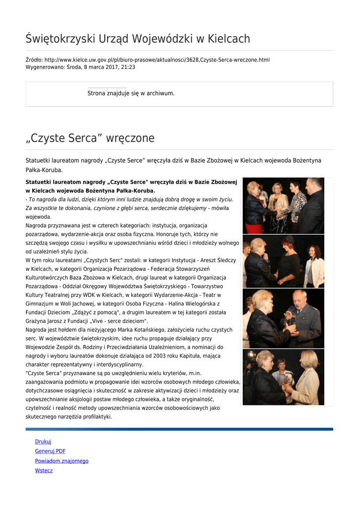 Świętokrzyski Urząd Wojewódzki w Kielcach Źródło: http://www.kielce.uw.gov.pl/pl/biuro-prasowe/aktualnosci/3628,Czyste-Serca-wreczone.html Wygenerowano: Środa, 8 marca 2017, 21:23 Strona znajduje się w archiwum. „Czyste Serca” wręczone Statuetki laureatom nagrody „Czyste Serce” wręczyła dziś w Bazie Zbożowej w Kielcach wojewoda Bożentyna Pałka-Koruba. Statuetki laureatom nagrody „Czyste Serce" wręczyła dziś w Bazie Zbożowej w Kielcach wojewoda Bożentyna Pałka-Koruba. - To nagroda dla ludzi, dzięki którym inni ludzie znajdują dobrą drogę w swoim życiu. Za wszystkie te dokonania, czynione z głębi serca, serdecznie dziękujemy - mówiła wojewoda. Nagroda przyznawana jest w czterech kategoriach: instytucja, organizacja pozarządowa, wydarzenie-akcja oraz osoba fizyczna. Honoruje tych, którzy nie szczędzą swojego czasu i wysiłku w upowszechnianiu wśród dzieci i młodzieży wolnego od uzależnień stylu życia. W tym roku laureatami „Czystych Serc" zostali: w kategorii Instytucja - Areszt Śledczy w Kielcach, w kategorii Organizacja Pozarządowa - Federacja Stowarzyszeń Kulturotwórczych Baza Zbożowa w Kielcach, drugi laureat w kategorii Organizacja Pozarządowa - Oddział Okręgowy Województwa Świętokrzyskiego - Towarzystwo Kultury Teatralnej przy WDK w Kielcach, w kategorii Wydarzenie-Akcja - Teatr w Gimnazjum w Woli Jachowej, w kategorii Osoba Fizyczna - Halina Wielogórska z Fundacji Dzieciom „Zdążyć z pomocą", a drugim laureatem w tej kategorii została Grażyna Jarosz z Fundacji „Vive - serce dzieciom". Nagroda jest hołdem dla nieżyjącego Marka Kotańskiego, założyciela ruchu czystych serc. W województwie świętokrzyskim, idee ruchu propaguje działający przy Wojewodzie Zespół ds. Rodziny i Przeciwdziałania Uzależnieniom, a nominacji do nagrody i wyboru laureatów dokonuje działająca od 2003 roku Kapituła, mająca charakter reprezentatywny i interdyscyplinarny. "Czyste Serca" przyznawane są po uwzględnieniu wielu kryteriów, m.in. zaangażowania podmiotu w propagowanie idei wzorców osobowych młodego człowieka, dotychczasowe osiągnięcia i skuteczność w zakresie aktywizacji dzieci i młodzieży oraz upowszechnianie aksjologii postaw młodego człowieka, a także oryginalność, czytelność i realność metody upowszechniania wzorców osobowościowych jako skutecznego narzędzia profilaktyki. Drukuj Generuj PDF Powiadom znajomego Wstecz