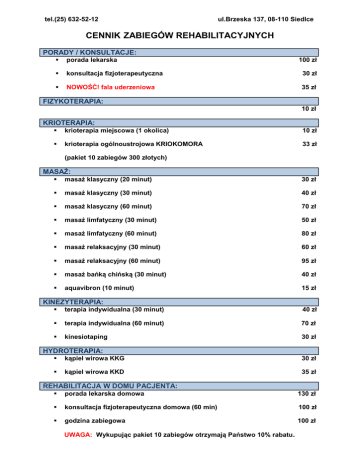 tel.(25) 632-52-12 ul.Brzeska 137, 08-110 Siedlce CENNIK ZABIEGÓW REHABILITACYJNYCH PORADY / KONSULTACJE: porada lekarska 100 zł konsultacja fizjoterapeutyczna 30 zł NOWOŚĆ! fala uderzeniowa 35 zł FIZYKOTERAPIA: 10 zł KRIOTERAPIA: krioterapia miejscowa (1 okolica) 10 zł krioterapia ogólnoustrojowa KRIOKOMORA 33 zł (pakiet 10 zabiegów 300 złotych) MASAŻ: masaż klasyczny (20 minut) 30 zł masaż klasyczny (30 minut) 40 zł masaż klasyczny (60 minut) 70 zł masaż limfatyczny (30 minut) 50 zł masaż limfatyczny (60 minut) 80 zł masaż relaksacyjny (30 minut) 60 zł masaż relaksacyjny (60 minut) 95 zł masaż bańką chińską (30 minut) 40 zł aquavibron (10 minut) 15 zł KINEZYTERAPIA: terapia indywidualna (30 minut) 40 zł terapia indywidualna (60 minut) 70 zł kinesiotaping 30 zł HYDROTERAPIA: kąpiel wirowa KKG 30 zł kąpiel wirowa KKD 35 zł REHABILITACJA W DOMU PACJENTA: porada lekarska domowa 130 zł konsultacja fizjoterapeutyczna domowa (60 min) 100 zł godzina zabiegowa 100 zł UWAGA: Wykupując pakiet 10 zabiegów otrzymają Państwo 10% rabatu.