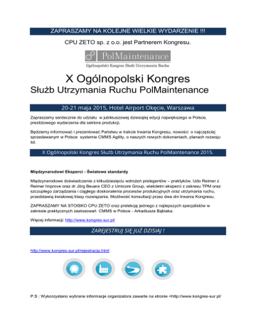 ZAPRASZAMY NA KOLEJNE WIELKIE WYDARZENIE !!! CPU ZETO sp. z o.o. jest Partnerem Kongresu. X Ogólnopolski Kongres Służb Utrzymania Ruchu PolMaintenance 20-21 maja 2015, Hotel Airport Okęcie, Warszawa Zapraszamy serdecznie do udziału w jubileuszowej dziesiątej edycji największego w Polsce, prestiżowego wydarzenia dla sektora produkcji. Będziemy informować i prezentować Państwu w trakcie trwania Kongresu, nowości o najczęściej sprzedawanym w Polsce systemie CMMS Agility, o naszych nowych dokonaniach, planach rozwoju itd. X Ogólnopolski Kongres Służb Utrzymania Ruchu PolMaintenance 2015. Międzynarodowi Eksperci - Światowe standardy Międzynarodowe doświadczenie z kilkudziesięciu wdrożeń prelegentów – praktyków. Udo Reimer z Reimer Improve oraz dr Jörg Beuers CEO z Umicore Group, wieloletni eksperci z zakresu TPM oraz szczupłego zarządzania i ciągłego doskonalenia procesów produkcyjnych oraz utrzymania ruchu, przedstawią światowej klasy rozwiązania. Możliwość konsultacji przez dwa dni trwania Kongresu. ZAPRASZAMY NA STOISKO CPU ZETO oraz prelekcję jednego z najlepszych specjalistów w zakresie praktycznych zastosowań CMMS w Polsce - Arkadiusza Bąbiaka. Więcej informacji: http://www.kongres-sur.pl/ ZAREJESTRUJ SIĘ JUŻ DZISIAJ ! http://www.kongres-sur.pl/rejestracja.html P.S : Wykorzystano wybrane informacje organizatora zawarte na stronie <http://www.kongres-sur.pl/