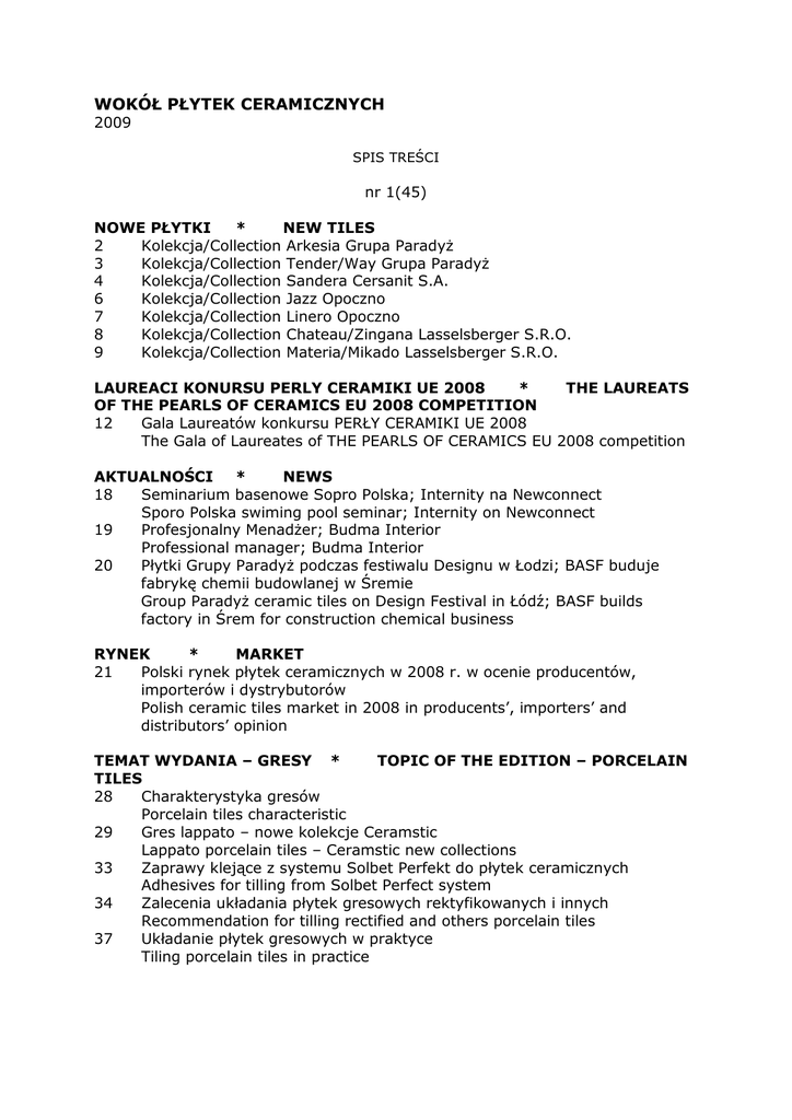 WOKÓŁ PŁYTEK CERAMICZNYCH 2009 SPIS TREŚCI nr 1(45) NOWE PŁYTKI * NEW TILES 2 Kolekcja/Collection Arkesia Grupa ParadyŜ 3 Kolekcja/Collection Tender/Way Grupa ParadyŜ 4 Kolekcja/Collection Sandera Cersanit S.A. 6 Kolekcja/Collection Jazz Opoczno 7 Kolekcja/Collection Linero Opoczno 8 Kolekcja/Collection Chateau/Zingana Lasselsberger S.R.O. 9 Kolekcja/Collection Materia/Mikado Lasselsberger S.R.O. LAUREACI KONURSU PERLY CERAMIKI UE 2008 * THE LAUREATS OF THE PEARLS OF CERAMICS EU 2008 COMPETITION 12 Gala Laureatów konkursu PERŁY CERAMIKI UE 2008 The Gala of Laureates of THE PEARLS OF CERAMICS EU 2008 competition AKTUALNOŚCI * NEWS 18 Seminarium basenowe Sopro Polska; Internity na Newconnect Sporo Polska swiming pool seminar; Internity on Newconnect 19 Profesjonalny MenadŜer; Budma Interior Professional manager; Budma Interior 20 Płytki Grupy ParadyŜ podczas festiwalu Designu w Łodzi; BASF buduje fabrykę chemii budowlanej w Śremie Group ParadyŜ ceramic tiles on Design Festival in Łódź; BASF builds factory in Śrem for construction chemical business RYNEK * MARKET 21 Polski rynek płytek ceramicznych w 2008 r. w ocenie producentów, importerów i dystrybutorów Polish ceramic tiles market in 2008 in producents’, importers’ and distributors’ opinion TEMAT WYDANIA – GRESY * TOPIC OF THE EDITION – PORCELAIN TILES 28 Charakterystyka gresów Porcelain tiles characteristic 29 Gres lappato – nowe kolekcje Ceramstic Lappato porcelain tiles – Ceramstic new collections 33 Zaprawy klejące z systemu Solbet Perfekt do płytek ceramicznych Adhesives for tilling from Solbet Perfect system 34 Zalecenia układania płytek gresowych rektyfikowanych i innych Recommendation for tilling rectified and others porcelain tiles 37 Układanie płytek gresowych w praktyce Tiling porcelain tiles in practice NORMALIZACJA * NORMALISATION 39 Kolejne zmiany w normalizacji materiałów do układania okładzin ceramicznych Consecutive changes in normalisation for materials to install ceramic coverings 42 Jak powinny być oznakowane opakowania płytek ceramicznych How should be marked ceramic tiles packets 46 Klasy reakcji na ogień klejów do płytek ceramicznych Reaction to fire classification of adhesives PORADY * ADVICES 48 Podkłady podłogowe zgodne z normą PN-EN 13813 Floor foundations in accordance with the standard PN-EN 13813 49 Płytki kalibrowane Calibrated dimensions ceramic tiles 52 Projekt wytycznych dotyczących śliskości posadzek w pomieszczeniach o róŜnym przeznaczeniu Draft of the directions concerned with slippness of floors in interiors of different purpose 54 Płytki i światło Tiles and light REALIZACJE * PROJECTS COMPLETED 55 Wanna w sypialni Bathtub in bedroom 56 Modernizacja w.c. w domu jednorodzinnym Water-closet modernisation in family house TARGI * FAIRS 57 Niewielka oferta płytek ceramicznych na targach Budma 2009 Ceramic tiles small offer on Budma 2009 fair 59 DOBRE ADRESY * GOOD ADRESSES 60 PRENUMERATA * SUBSCRIPTION nr 2(46) NOWE PŁYTKI * NEW TILES 2 Kolekcja/Collection Carioca/Alan Grupa ParadyŜ 3 Kolekcja/Collection Delicate/Touch Grupa ParadyŜ 4 Kolekcja/Collection Valentina Opoczno 6 Kolekcja/Collection Kando Cersanit S.A. 8 Kolekcja/Collection Natura di Terra Grupa Tubądzin 10 Kolekcja/Collection Joy, Brika, Delice Struktura Domino 11 Kolekcja/Collection Marbel, Rubra, Egzotika, Idylla Struktura Domino PERŁY CERAMIKI UE 2009 NOMINACJE * PEARLS OF CERAMICS EU 2009 NOMINATIONS 14 Wyniki w I edycji konkursu Results at the I stage of the PEARLS OF CERAMICS EU 2009 competition 16 Prezentacja kolekcji nominowanych w I edycji konkursu PERŁY CERAMIKI UE 2009 Presentation of the tile collections nominated at the I stage of the PEARLS OF CERAMICS EU 2009 competition AKTUALNOŚCI * NEWS 21 „The House of villeroy & Boch” w salonie Cermagu we Wrocławiu; Nowa Prezes Cerradu “The House of Villeroy&Boch” in Cermag showroom in Wrocław; New chairman in Cerrad 22 Glazuta Królewska rozwija sieć Salonów Łazienek; Nowe salony Wemy Glazura królewska develops Salon Łazienek showroom net; New Wema showrooms 23 Nowości Sopro; gen-Bud będzie zarządzał salonami Domeko Sopro new products; Gen-Bud will manage Domeko showrooms 24 Salon firmy Cermag ceramika&łazienka w Lublinie; Nowy Dyrektor w firmie Villeroy & Boch Polska Sp. z o.o. Cermag ceramika&łazienka showroom in Lublin; New Manager Director in Villeroy & Boch Polska Sp. z o.o. RYNEK * MARKET 25 Chcemy być najlepsi w tym co robimy – wywiad z Marcinem Barańskim wiceprezesem firmy Tubądzin Management Group We would like to be the best in our activity – interview with Marcin Barański, vicepresident of Tubadzin Management Group 28 Zamierzamy tworzyć silna sieć luksusowych butików z płytkami ceramicznymi i wyposaŜeniem łazienek – wywiad z Piotrem Grupińskim prezesem zarządu Internity S.A. We would like to build strong luxury showrooms with ceramic tiles and bathroom equipment – interview with Piotr Grupiński – President of Internity S.A. 30 Eksport hiszpańskich płytek ceramicznych w 2008 r. Spanish ceramics tiles export in 2008 TEMAT WYDANIA – HYDROIZOLACJE * TOPIC OF THE EDITION – HYDROISOLATIONS 33 Hydroizolacje podpłytkowe Alpol Alpol hydroisolations under ceramics coverings 34 PodłoŜa pod okładziny ceramiczne Bases under ceramic coverings 37 Elastyczne hydroizolacje DRIZORO DRIZORO elastic hydroisolations 39 Duet wysokoelastyczny do kamienia Highelastic duet for stone 40 Dobór uszczelnień w łazienkach wg wytycznych niemieckich Bathroom seal selection according to german directives NORMALIZACJA * NORMALISATION 42 Posiedzenie CEN/TC 67/WG 3 w Mediolanie CEN/TC 67/WG meeting in Milan PORADY * ADVICES 44 Jak uniknąć reklamacji płytek ceramicznych – wskazówki producenta How avoid ceramic tiles complaints – producer’s advices 46 Jak wybrać płytki do garaŜów? How to choose ceramic tiles for garage? 47 Płytki ceramiczne antybakteryjne Antibacterial cer