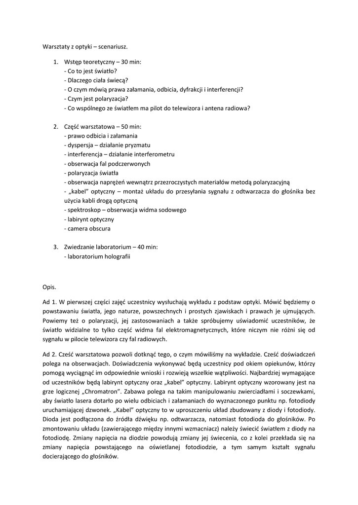 Warsztaty z optyki – scenariusz. 1. Wstęp teoretyczny – 30 min: - Co to jest światło? - Dlaczego ciała świecą? - O czym mówią prawa załamania, odbicia, dyfrakcji i interferencji? - Czym jest polaryzacja? - Co wspólnego ze światłem ma pilot do telewizora i antena radiowa? 2. Częśd warsztatowa – 50 min: - prawo odbicia i załamania - dyspersja – działanie pryzmatu - interferencja – działanie interferometru - obserwacja fal podczerwonych - polaryzacja światła - obserwacja naprężeo wewnątrz przezroczystych materiałów metodą polaryzacyjną - „kabel” optyczny – montaż układu do przesyłania sygnału z odtwarzacza do głośnika bez użycia kabli drogą optyczną - spektroskop – obserwacja widma sodowego - labirynt optyczny - camera obscura 3. Zwiedzanie laboratorium – 40 min: - laboratorium holografii Opis. Ad 1. W pierwszej części zajęd uczestnicy wysłuchają wykładu z podstaw optyki. Mówid będziemy o powstawaniu światła, jego naturze, powszechnych i prostych zjawiskach i prawach je ujmujących. Powiemy też o polaryzacji, jej zastosowaniach a także spróbujemy uświadomid uczestników, że światło widzialne to tylko częśd widma fal elektromagnetycznych, które niczym nie różni się od sygnału w pilocie telewizora czy fal radiowych. Ad 2. Cześd warsztatowa pozwoli dotknąd tego, o czym mówiliśmy na wykładzie. Cześd doświadczeo polega na obserwacjach. Doświadczenia wykonywad będą uczestnicy pod okiem opiekunów, którzy pomogą wyciągnąd im odpowiednie wnioski i rozwieją wszelkie wątpliwości. Najbardziej wymagające od uczestników będą labirynt optyczny oraz „kabel” optyczny. Labirynt optyczny wzorowany jest na grze logicznej „Chromatron”. Zabawa polega na takim manipulowaniu zwierciadłami i soczewkami, aby światło lasera dotarło po wielu odbiciach i załamaniach do wyznaczonego punktu np. fotodiody uruchamiającej dzwonek. „Kabel” optyczny to w uproszczeniu układ zbudowany z diody i fotodiody. Dioda jest podłączona do źródła dźwięku np. odtwarzacza, natomiast fotodioda do głośników. Po zmontowaniu układu (zawierającego między innymi wzmacniacz) należy świecid światłem z diody na fotodiodę. Zmiany napięcia na diodzie powodują zmiany jej świecenia, co z kolei przekłada się na zmiany napięcia powstającego na oświetlanej fotodiodzie, a tym samym kształt sygnału docierającego do głośników. Obserwacje naprężeo wewnątrz przezroczystych materiałów polegają na odpowiednim spolaryzowaniu układu polaryzator – materiał – polaryzator(analizator) tak, aby wewnętrzne nierówności w materiale powodowały wewnętrzną polaryzację światła co będzie skutkowało powstawaniem wielobarwnych kształtów na analizatorze. Ad. 3. Uczestników warsztatów zaprosimy do laboratorium holografii, gdzie pokażemy im, w jaki sposób powstają hologramy i jaką rolę mogą odegrad w przyszłości.