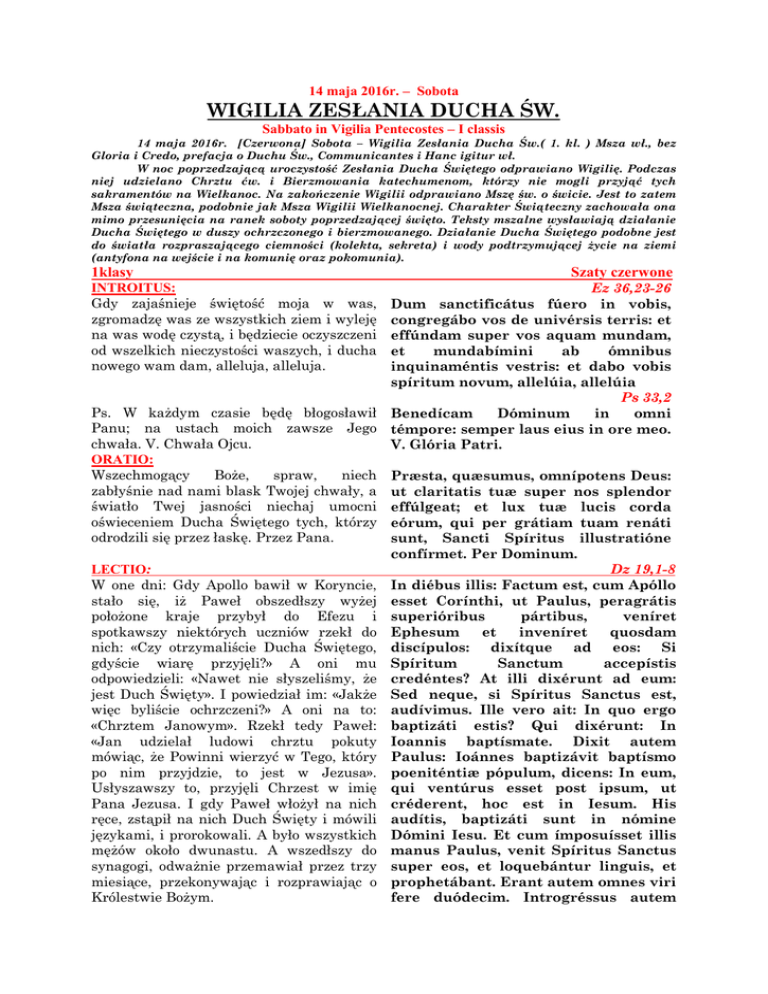 14 maja 2016r. – Sobota WIGILIA ZESŁANIA DUCHA ŚW. Sabbato in Vigilia Pentecostes – I classis 14 maja 2016r. [Czerwona] Sobota – Wigilia Zesłania Ducha Św.( 1. kl. ) Msza wł., bez Gloria i Credo, prefacja o Duchu Św., Communicantes i Hanc igitur wł. W noc poprzedzającą uroczystość Zesłania Ducha Świętego odprawiano Wigilię. Podczas niej udzielano Chrztu ćw. i Bierzmowania katechumenom, którzy nie mogli przyjąć tych sakramentów na Wielkanoc. Na zakończenie Wigilii odprawiano Mszę św. o świcie. Jest to zatem Msza świąteczna, podobnie jak Msza Wigilii Wielkanocnej. Charakter Świąteczny zachowała ona mimo przesunięcia na ranek soboty poprzedzającej święto. Teksty mszalne wysławiają działanie Ducha Świętego w duszy ochrzczonego i bierzmowanego. Działanie Ducha Świętego podobne jest do światła rozpraszającego ciemności (kolekta, sekreta) i wody podtrzymującej życie na ziemi (antyfona na wejście i na komunię oraz pokomunia). 1klasy Szaty czerwone Ez 36,23-26 Dum sanctificátus fúero in vobis, congregábo vos de univérsis terris: et effúndam super vos aquam mundam, et mundabímini ab ómnibus inquinaméntis vestris: et dabo vobis spíritum novum, allelúia, allelúia Ps 33,2 Ps. W każdym czasie będę błogosławił Benedícam Dóminum in omni Panu; na ustach moich zawsze Jego témpore: semper laus eius in ore meo. chwała. V. Chwała Ojcu. V. Glória Patri. ORATIO: Wszechmogący Boże, spraw, niech Præsta, quæsumus, omnípotens Deus: zabłyśnie nad nami blask Twojej chwały, a ut claritatis tuæ super nos splendor światło Twej jasności niechaj umocni effúlgeat; et lux tuæ lucis corda oświeceniem Ducha Świętego tych, którzy eórum, qui per grátiam tuam renáti odrodzili się przez łaskę. Przez Pana. sunt, Sancti Spíritus illustratióne confírmet. Per Dominum. LECTIO: Dz 19,1-8 W one dni: Gdy Apollo bawił w Koryncie, In diébus illis: Factum est, cum Apóllo stało się, iż Paweł obszedłszy wyżej esset Corínthi, ut Paulus, peragrátis położone kraje przybył do Efezu i superióribus pártibus, veníret spotkawszy niektórych uczniów rzekł do Ephesum et inveníret quosdam nich: «Czy otrzymaliście Ducha Świętego, discípulos: dixítque ad eos: Si gdyście wiarę przyjęli?» A oni mu Spíritum Sanctum accepístis odpowiedzieli: «Nawet nie słyszeliśmy, że credéntes? At illi dixérunt ad eum: jest Duch Święty». I powiedział im: «Jakże Sed neque, si Spíritus Sanctus est, więc byliście ochrzczeni?» A oni na to: audívimus. Ille vero ait: In quo ergo «Chrztem Janowym». Rzekł tedy Paweł: baptizáti estis? Qui dixérunt: In «Jan udzielał ludowi chrztu pokuty Ioannis baptísmate. Dixit autem mówiąc, że Powinni wierzyć w Tego, który Paulus: Ioánnes baptizávit baptísmo po nim przyjdzie, to jest w Jezusa». poeniténtiæ pópulum, dicens: In eum, Usłyszawszy to, przyjęli Chrzest w imię qui ventúrus esset post ipsum, ut Pana Jezusa. I gdy Paweł włożył na nich créderent, hoc est in Iesum. His ręce, zstąpił na nich Duch Święty i mówili audítis, baptizáti sunt in nómine językami, i prorokowali. A było wszystkich Dómini Iesu. Et cum ímposuísset illis mężów około dwunastu. A wszedłszy do manus Paulus, venit Spíritus Sanctus synagogi, odważnie przemawiał przez trzy super eos, et loquebántur linguis, et miesiące, przekonywając i rozprawiając o prophetábant. Erant autem omnes viri Królestwie Bożym. fere duódecim. Introgréssus autem INTROITUS: Gdy zajaśnieje świętość moja w was, zgromadzę was ze wszystkich ziem i wyleję na was wodę czystą, i będziecie oczyszczeni od wszelkich nieczystości waszych, i ducha nowego wam dam, alleluja, alleluja. synagógam, cum fidúcia loquebátur per tres menses, dísputans et suádens de regno Dei. GRADUALE: Alleluja V. Sławcie Pana, bo dobry, bo na wieki miłosierdzie Jego. Chwalcie Pana, wszystkie narody, wysławiajcie Go, wszystkie ludy. V. Bo Jego miłosierdzie nad nami utwierdzone, a wierność Pańska trwa na wieki. EVANGELIUM: Onego czasu: Rzekł Jezus uczniom swoim: «Jeśli mnie miłujecie, zachowujcie przykazania moje. A ja prosić będę Ojca, i innego Pocieszyciela da wam, aby pozostał z wami na zawsze. Ducha prawdy, którego świat nie może przyjąć, bo Go nie widzi ani Go nie zna. Lecz wy Go poznacie, bo u was pozostanie i w was będzie przebywał. Nie pozostawię was sierotami, przyjdę do was. Jeszcze niedługo, a świat mnie już nie ujrzy. Ale wy mnie widzicie, bo ja żyję i wy żyć będziecie. W on dzień poznacie, że ja jestem w Ojcu moim, wy we mnie, a ja w was. Kto ma przykazania moje i zachowuje je, ten jest, który mnie miłuje. A kto mnie miłuje, umiłuje go Ojciec mój i ja go miłować będę, i siebie samego mu objawię». Allelúia Ps106,1 V.Confitémini Dómino, quóniam bonus: quóniam in saeculum misericordia eius. Ps 116,1-2 Laudáte Dóminum, omnes gentes: et collaudáte eum, omnes pópuli, V. Quóniam confirmáta est super nos misericórdia eius: et véritas Dómini manet in ætérnum. J 14,15-21 In illo témpore: Dixit Iesus discípulis suis: Si dilígitis me, mandáta mea serváte. Et ego rogábo Patrem, et alium Paráclitum dabit vobis, ut máneat vobíscum in ætérnum, Spíritum veritátis, quem mundus non potest accípere, quia non videt eum nec scit eum. Vos autem cognoscétis eum: quia apud vos manébit et in vobis erit. Non relínquam vos órphanos: véniam ad vos. Adhuc módicum: et mundus me iam non videt. Vos autem vidétis me, quia ego vivo, et vos vivétis, In illo die vos cognoscétis, quia ego sum in Patre meo, et vos in me, et ego in vobis. Qui habet mandáta mea et servat ea: ille est, qui díligit me. Qui autem díligit me, diligétur a Patre meo: et ego díligam eum, et manifestábo ei meípsum. Ps 103,30-31 Emítte Spíritum tuum, et creabúntur, et renovábis fáciem terræ: sit glória Dómini in saecula, allelúia. OFFERTORIUM: Ześlij Ducha Twojego, a po