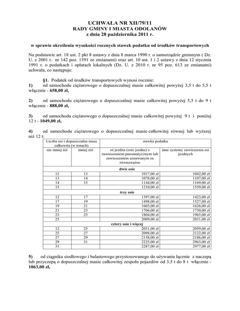 UCHWAŁA NR XII/79/11 RADY GMINY I MIASTA ODOLANÓW z dnia 28 października 2011 r. w sprawie określenia wysokości rocznych stawek podatku od środków transportowych Na podstawie art. 18 ust. 2 pkt 8 ustawy z dnia 8 marca 1990 r. o samorządzie gminnym ( Dz. U. z 2001 r. nr 142 poz. 1591 ze zmianami) oraz art. 10 ust. 1 i 2 ustawy z dnia 12 stycznia 1991 r. o podatkach i opłatach lokalnych (Dz. U. z 2010 r. nr 95 poz. 613 ze zmianami) uchwala, co następuje: §1. Podatek od środków transportowych wynosi rocznie: 1) od samochodu ciężarowego o dopuszczalnej masie całkowitej powyżej 3,5 t do 5,5 t włącznie - 658,00 zł, 2) od samochodu ciężarowego o dopuszczalnej masie całkowitej powyżej 5,5 t do 9 t włącznie - 888,00 zł, 3) od samochodu ciężarowego o dopuszczalnej masie całkowitej powyżej 9 t i poniżej 12 t - 1049,00 zł, 4) od samochodu ciężarowego o dopuszczalnej masie całkowitej równej lub wyższej niż 12 t: Liczba osi i dopuszczalna masa całkowita (w tonach) nie mniej niż mniej niż stawka podatku oś jezdna (osie jezdne) z inne systemy zawieszenia osi zawieszeniem pneumatycznym lub jezdnych zawieszeniem uznawanym za równoważne dwie osie 12 13 14 15 1017,00 zł 1078,00 zł 1144,00 zł 1210,00 zł 1042,00 zł 1107,00 zł 1169,00 zł 1559,00 zł 1397,00 zł 1498,00 zł 1603,00 zł 1706,00 zł 1804,00 zł 2009,00 zł cztery osie i więcej 2031,00 zł 2098,00 zł 2158,00 zł 2225,00 zł 2287,00 zł 1423,00 zł 1527,00 zł 1626,00 zł 1730,00 zł 1965,00 zł 2031,00 zł 13 14 15 trzy osie 12 17 19 21 23 25 17 19 21 23 25 12 25 27 29 31 25 27 29 31 2059,00 zł 2122,00 zł 2186,00 zł 2963,00 zł 2977,00 zł 5) od ciągnika siodłowego i balastowego przystosowanego do używania łącznie z naczepą lub przyczepą o dopuszczalnej masie całkowitej zespołu pojazdów od 3,5 t do 8 t włącznie 1063,00 zł, 6) od ciągnika siodłowego i balastowego przystosowanego do używania łącznie z naczepą lub przyczepą o dopuszczalnej masie całkowitej zespołu pojazdów powyżej 8 t i poniżej 12 t - 1182,00 zł, 7) od ciągnika siodłowego i balastowego przystosowanego do używania łącznie z naczepą lub przyczepą, o dopuszczalnej masie całkowitej zespołu pojazdów równej lub wyższej niż 12 t: masa całkowita zespołu pojazdów: ciągnik siodłowy + naczepa ciągnik balastowy + przyczepa (w tonach) nie mniej niż mniej niż 12 18 25 31 18 25 31 12 40 40 stawka podatku oś jezdna (osie jezdne) z zawieszeniem pneumatycznym inne systemy zawieszenia lub zawieszeniem uznawanym osi jezdnych za równoważne dwie osie 1943,00 zł 2014,00 zł 2009,00 zł 2031,00 zł 2076,00 zł 2098,00 zł 2161,00 zł 2302,00 zł trzy osie i więcej 2249,00 zł 2259,00 zł 2352,00 zł 2755,00 zł 8) od przyczep i naczep, które łącznie z pojazdem silnikowym posiadają dopuszczalną masę całkowitą od 7 do 10 t włącznie z wyjątkiem związanych wyłącznie z działalnością rolniczą prowadzoną przez podatnika podatku rolnego - 265,00 zł, 9) od przyczep i naczep, które łącznie z pojazdem silnikowym posiadają dopuszczalną masę całkowitą powyżej 10 t i poniżej 12 t, z wyjątkiem związanych wyłącznie z działalnością rolniczą prowadzoną przez podatnika podatku rolnego - 277,00 zł, 10) od przyczep i naczep, które łącznie z pojazdem silnikowym posiadają dopuszczalną masę całkowitą równą lub wyższą niż 12 t, z wyjątkiem związanych wyłącznie z działalnością rolniczą prowadzoną przez podatnika podatku rolnego: liczba osi i dopuszczalna masa całkowita zespołu pojazdów: naczepa/przyczepa + pojazd silnikowy (w tonach) nie mniej niż mniej niż 12 18 25 18 25 12 28 33 38 28 33 38 12 38 38 Stawka podatku oś jezdna (osie jezdne) z zawieszeniem inne systemy zawieszenia osi pneumatycznym lub jezdnych zawieszeniem uznawanym za równoważne jedna oś 230,00 zł 237,00 zł 253,00 zł 389,00 zł 400,00 zł 686,00 zł dwie osie 265,00 zł 387,00 zł 766,00 zł 1062,00 zł 1062,00 zł 1610,00 zł 1393,00 zł 2116,00 zł trzy osie i więcej 849,00 zł 1176,00 zł 1176,00 zł 1595,00 zł 11) od autobusów do mniej niż 30 miejsc - 941,00 zł, 12) od autobusów o liczbie miejsc równej lub wyższej niż 30 miejsc – 1754,00 zł; §2. Wykonanie uchwały powierza się Burmistrzowi Gminy i Miasta Odolanów. §3. Traci moc uchwała nr XLII/251/10 Rady Gminy i Miasta w Odolanowie z dnia 22 października 2010 roku w sprawie określenia wysokości rocznych stawek podatku od środków transportowych. §4. Uchwałę ogłasza się poprzez rozplakatowanie na tablicach ogłoszeń w Urzędzie Gminy i Miasta, na tablicach ogłoszeń we wsiach sołeckich, w prasie lokalnej oraz w Biuletynie Informacji Publicznej. §5. Uchwała wchodzi w życie po upływie 14 dni od dnia ogłoszenia w Dzienniku Urzędowym Województwa Wielkopolskiego i obowiązuje od 01 stycznia 2012 roku. Uzasadnienie Zgodnie z art. 10 ust. 1 ustawy z dnia 12 stycznia 1991 r. o podatkach i opłatach lokalnych, Rada Gminy w drodze uchwały, określa stawki podatku od środków transportowych, z tym że stawki nie mogą być niższe od stawek minimalnych, ani wyższe od stawek maksymalnych określonych przez ustawodawcę. Konieczność określenia ww. stawek na 2011 r. wiąże się z projektem uchwały w sprawie uchwalenia budżetu Gminy i Miasta Odolanów na rok 2012. Założone dochody z tytułu podatku od środków transportowych będą możliwe do wykonania przy uwzględnieniu stawek podatkowych na 2012 r. ujętych w niniejszym projekcie. Zawarte w projekcie uchwały stawki podatku zgodne są z założeniami do budżetu Gminy i Miasta Odolanów na 2012 rok, zakładającymi wzrost stawek zgodnie z projektem Obwieszczenia Ministra Finansów w sprawie górnych stawek kwotowych podatków i opłat lokalnych na rok 2012 o wskaźnik inflacji tj. o 4,20 % w stosunku do roku 2011. Przyjęty wzrost stawek o wskaźnik inflacji z tytułu podatku od środków transportowych jest działaniem typowym w stosunku do pode