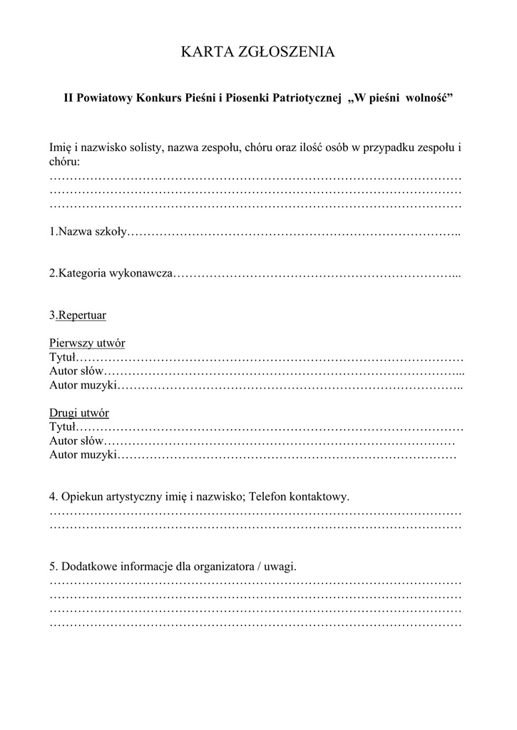 KARTA ZGŁOSZENIA II Powiatowy Konkurs Pieśni i Piosenki Patriotycznej ,,W pieśni wolność” Imię i nazwisko solisty, nazwa zespołu, chóru oraz ilość osób w przypadku zespołu i chóru: ………………………………………………………………………………………… ………………………………………………………………………………………… ………………………………………………………………………………………… 1.Nazwa szkoły……………………………………………………………………….. 2.Kategoria wykonawcza……………………………………………………………... 3.Repertuar Pierwszy utwór Tytuł…………………………………………………………………………………… Autor słów……………………………………………………………………………... Autor muzyki………………………………………………………………………….. Drugi utwór Tytuł…………………………………………………………………………………… Autor słów…………………………………………………………………………… Autor muzyki………………………………………………………………………… 4. Opiekun artystyczny imię i nazwisko; Telefon kontaktowy. ………………………………………………………………………………………… ………………………………………………………………………………………… 5. Dodatkowe informacje dla organizatora / uwagi. ………………………………………………………………………………………… ………………………………………………………………………………………… ………………………………………………………………………………………… …………………………………………………………………………………………