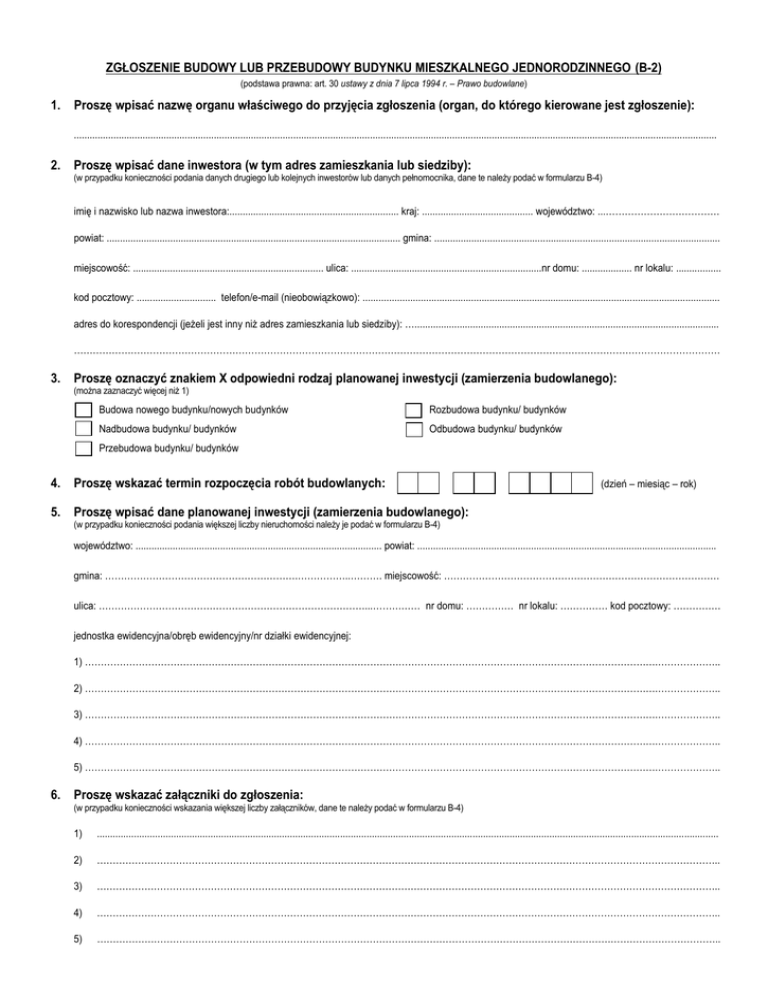 ZGŁOSZENIE BUDOWY LUB PRZEBUDOWY BUDYNKU MIESZKALNEGO JEDNORODZINNEGO (B-2) (podstawa prawna: art. 30 ustawy z dnia 7 lipca 1994 r. – Prawo budowlane) 1. Proszę wpisać nazwę organu właściwego do przyjęcia zgłoszenia (organ, do którego kierowane jest zgłoszenie): ................................................................................................................................................................................................................................................... 2. Proszę wpisać dane inwestora (w tym adres zamieszkania lub siedziby): (w przypadku konieczności podania danych drugiego lub kolejnych inwestorów lub danych pełnomocnika, dane te należy podać w formularzu B-4) imię i nazwisko lub nazwa inwestora:................................................................ kraj: .......................................... województwo: ...……………………………… powiat: ............................................................................................................... gmina: ............................................................................................................ miejscowość: ........................................................................ ulica: ........................................................................nr domu: ................... nr lokalu: ................. kod pocztowy: .............................. telefon/e-mail (nieobowiązkowo): ....................................................................................................................................... adres do korespondencji (jeżeli jest inny niż adres zamieszkania lub siedziby): …................................................................................................................... …………………………………………………………………………………………………………………………………………………………………………………… 3. Proszę oznaczyć znakiem X odpowiedni rodzaj planowanej inwestycji (zamierzenia budowlanego): (można zaznaczyć więcej niż 1) Budowa nowego budynku/nowych budynków Rozbudowa budynku/ budynków Nadbudowa budynku/ budynków Odbudowa budynku/ budynków Przebudowa budynku/ budynków 4. Proszę wskazać termin rozpoczęcia robót budowlanych: (dzień – miesiąc – rok) 5. Proszę wpisać dane planowanej inwestycji (zamierzenia budowlanego): (w przypadku konieczności podania większej liczby nieruchomości należy je podać w formularzu B-4) województwo: ............................................................................................. powiat: ................................................................................................................. gmina: …………………………………………………….……………..………. miejscowość: …………………………………………………………………………… ulica: …………………………………………………………………………...…………… nr domu: …………… nr lokalu: …………… kod pocztowy: …………… jednostka ewidencyjna/obręb ewidencyjny/nr działki ewidencyjnej: 1) ……………………………………………………………………………………………………………………………………………………………….……………….. 2) ……………………………………………………………………………………………………………………………………………………………….……………….. 3) ……………………………………………………………………………………………………………………………………………………………….……………….. 4) ……………………………………………………………………………………………………………………………………………………………….……………….. 5) ……………………………………………………………………………………………………………………………………………………………….……………….. 6. Proszę wskazać załączniki do zgłoszenia: (w przypadku konieczności wskazania większej liczby załączników, dane te należy podać w formularzu B-4) 1) ........................................................................................................................................................................................................................................... 2) …………………………………………………………………………………………………………………………………………………………………………….. 3) …………………………………………………………………………………………………………………………………………………………………………….. 4) …………………………………………………………………………………………………………………………………………………………………………….. 5) …………………………………………………………………………………………………………………………………………………………………………….. 7. Proszę oznaczyć znakiem X w przypadku dołączania formularza B-4 Dołączam formularz B-4 ……........................................................................................................................ Data oraz czytelny podpis inwestora lub osoby upoważnionej do działania w jego imieniu (w przypadku dokonania zgłoszenia przez kilku inwestorów lub osób upoważnionych podpis składa każda z nich) Wypełnia organ Data wpływu zgłoszenia:………………………………