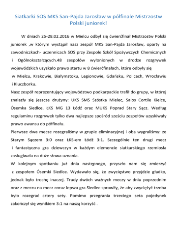 Siatkarki SOS MKS San-Pajda Jarosław w półfinale Mistrzostw Polski juniorek! W dniach 25-28.02.2016 w Mielcu odbył się ćwierćfinał Mistrzostw Polski juniorek ,w którym wystąpił nasz zespół MKS San-Pajda Jarosław, oparty na zawodniczkach- uczennicach SOS przy Zespole Szkół Spożywczych Chemicznych i Ogólnokształcących.48 zespołów wyłonionych w drodze rozgrywek wojewódzkich uzyskało prawo startu w 8 ćwierćfinałach, które odbyły się w Mielcu, Krakowie, Białymstoku, Legionowie, Gdańsku, Policach, Wrocławiu i Kluczborku. Nasz zespół reprezentujący województwo podkarpackie trafił do grupy, w której znalazły się jeszcze drużyny: UKS SMS Szóstka Mielec, Salos Cortile Kielce, Ósemka Siedlce, ŁKS MG 13 Łódź oraz MUKS Poprad Stary Sącz. Według regulaminu rozgrywek tylko dwa najlepsze spośród sześciu zespołów uzyskiwały prawo awansu do półfinału. Pierwsze dwa mecze rozegraliśmy w grupie eliminacyjnej i oba wygraliśmy: ze Starym Sączem 3:0 oraz ŁKS-em Łódź 3:1. Szczególnie ten drugi mecz i fantastyczna gra dziewczyn w każdym elemencie siatkarskiego rzemiosła zasługiwała na duże słowa uznania. W kolejnym spotkaniu już dnia następnego, przyszło nam się zmierzyć z zespołem Ósemki Siedlce. Wydawało się, że zwycięstwo przyjdzie gładko, jednak było trochę inaczej. Trudy dwóch ważnych meczy w dniu poprzednim oraz z meczu na mecz coraz lepsza gra Siedlec sprawiły, że aby zwyciężyć trzeba było rozegrać cztery sety. Pomimo przegrania trzeciego seta pojedynek zakończył się wynikiem 3:1 na naszą korzyść . Było to trzecie z kolei zwycięstwo, które bardzo realnie przybliżało nas do upragnionego awansu. Pozostawała jeszcze jedna niewiadoma sobotniego popołudnia, a mianowicie wynik meczu pomiędzy Szóstką Mielec a ŁKS-em Łódź. Już teraz bowiem wiedzieliśmy, że jeżeli wygra Mielec, to awans do najlepszej ,,16” w Polsce będziemy mogli świętować już dzisiaj. I tak też się stało. Zespół gospodarzy nie dał żadnych szans łodziankom i po bardzo dobrej grze pewnie zwyciężył 3:0. Tym samym Mielec i Jarosław były już w półfinale !!! Pozostała jeszcze jedna niewiadoma, a konkretnie kto zajmie pierwsze a kto drugie miejsce. O tym fakcie miał rozstrzygnąć ostatni mecz turnieju, który odbył się w niedzielę. Pomimo ogromnej chęci zwycięstwa i rewanżu za rozgrywki wojewódzkie nie udało nam się pokonać świetnie dysponowanego w tym turnieju i wśród własnej publiczności zespołu gospodarzy. Tym razem musieliśmy uznać ich wyższość przegrywając 1:3. Nie zmieniło to jednak faktu, że dzięki świetnej grze i ogromnej determinacji jesteśmy już dzisiaj jedną z 16 najlepszych juniorskich drużyn w Polsce!!! Gratulacje dla dziewczyn i trenerów. Trzymajcie kciuki za jak najkorzystniejsze losowanie, które odbędzie się 2.03. w siedzibie PZPS oraz jak najlepszy występ naszego zespołu w turnieju półfinałowym, który odbędzie się w dniach 11-13.03.2016, jeszcze nie wiadomo gdzie. Jolanta Pajda