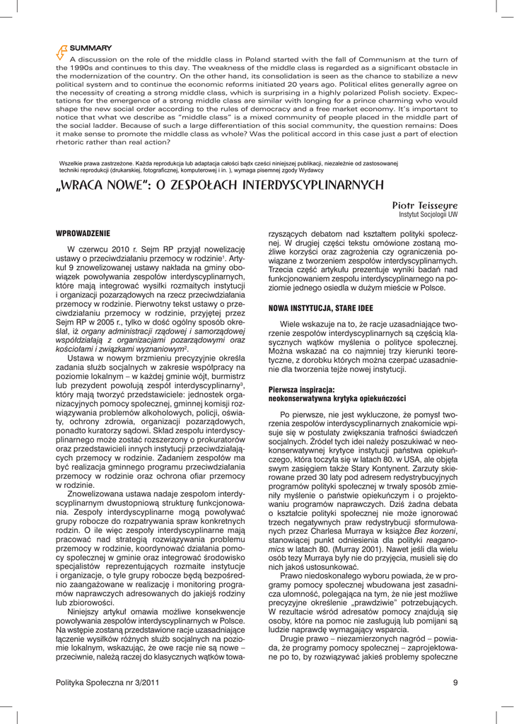 SUMMARY A discussion on the role of the middle class in Poland started with the fall of Communism at the turn of the 1990s and continues to this day. The weakness of the middle class is regarded as a significant obstacle in the modernization of the country. On the other hand, its consolidation is seen as the chance to stabilize a new political system and to continue the economic reforms initiated 20 years ago. Political elites generally agree on the necessity of creating a strong middle class, which is surprising in a highly polarized Polish society. Expectations for the emergence of a strong middle class are similar with longing for a prince charming who would shape the new social order according to the rules of democracy and a free market economy. It’s important to notice that what we describe as “middle class” is a mixed community of people placed in the middle part of the social ladder. Because of such a large differentiation of this social community, the question remains: Does it make sense to promote the middle class as whole? Was the political accord in this case just a part of election rhetoric rather than real action? Wszelkie prawa zastrzeżone. Każda reprodukcja lub adaptacja całości bądx cześci niniejszej publikacji, niezależnie od zastosowanej techniki reprodukcji (drukarskiej, fotograficznej, komputerowej i in. ), wymaga pisemnej zgody Wydawcy „WRACA NOWE”: O ZESPOŁACH INTERDYSCYPLINARNYCH Piotr Teisseyre Instytut Socjologii UW WPROWADZENIE W czerwcu 2010 r. Sejm RP przyjął nowelizację ustawy o przeciwdziałaniu przemocy w rodzinie1. Artykuł 9 znowelizowanej ustawy nakłada na gminy obowiązek powoływania zespołów interdyscyplinarnych, które mają integrować wysiłki rozmaitych instytucji i organizacji pozarządowych na rzecz przeciwdziałania przemocy w rodzinie. Pierwotny tekst ustawy o przeciwdziałaniu przemocy w rodzinie, przyjętej przez Sejm RP w 2005 r., tylko w dość ogólny sposób określał, iż organy administracji rządowej i samorządowej współdziałają z organizacjami pozarządowymi oraz kościołami i związkami wyznaniowym2. Ustawa w nowym brzmieniu precyzyjnie określa zadania służb socjalnych w zakresie współpracy na poziomie lokalnym – w każdej gminie wójt, burmistrz lub prezydent powołują zespół interdyscyplinarny3, który mają tworzyć przedstawiciele: jednostek organizacyjnych pomocy społecznej, gminnej komisji rozwiązywania problemów alkoholowych, policji, oświaty, ochrony zdrowia, organizacji pozarządowych, ponadto kuratorzy sądowi. Skład zespołu interdyscyplinarnego może zostać rozszerzony o prokuratorów oraz przedstawicieli innych instytucji przeciwdziałających przemocy w rodzinie. Zadaniem zespołów ma być realizacja gminnego programu przeciwdziałania przemocy w rodzinie oraz ochrona ofiar przemocy w rodzinie. Znowelizowana ustawa nadaje zespołom interdyscyplinarnym dwustopniową strukturę funkcjonowania. Zespoły interdyscyplinarne mogą powoływać grupy robocze do rozpatrywania spraw konkretnych rodzin. O ile więc zespoły interdyscyplinarne mają pracować nad strategią rozwiązywania problemu przemocy w rodzinie, koordynować działania pomocy społecznej w gminie oraz integrować środowisko specjalistów reprezentujących rozmaite instytucje i organizacje, o tyle grupy robocze będą bezpośrednio zaangażowane w realizację i monitoring programów naprawczych adresowanych do jakiejś rodziny lub zbiorowości. Niniejszy artykuł omawia możliwe konsekwencje powoływania zespołów interdyscyplinarnych w Polsce. Na wstępie zostaną przedstawione racje uzasadniające łączenie wysiłków różnych służb socjalnych na poziomie lokalnym, wskazując, że owe racje nie są nowe – przeciwnie, należą raczej do klasycznych wątków towaPolityka Społeczna nr 3/2011 rzyszących debatom nad kształtem polityki społecznej. W drugiej części tekstu omówione zostaną możliwe korzyści oraz zagrożenia czy ograniczenia powiązane z tworzeniem zespołów interdyscyplinarnych. Trzecia część artykułu prezentuje wyniki badań nad funkcjonowaniem zespołu interdyscyplinarnego na poziomie jednego osiedla w dużym mieście w Polsce. NOWA INSTYTUCJA, STARE IDEE Wiele wskazuje na to, że racje uzasadniające tworzenie zespołów interdyscyplinarnych są częścią klasycznych wątków myślenia o polityce społecznej. Można wskazać na co najmniej trzy kierunki teoretyczne, z dorobku których można czerpać uzasadnienie dla tworzenia tejże nowej instytucji. Pierwsza inspiracja: neokonserwatywna krytyka opiekuńczości Po pierwsze, nie jest wykluczone, że pomysł tworzenia zespołów interdyscyplinarnych znakomicie wpisuje się w postulaty zwiększania trafności świadczeń socjalnych. Źródeł tych idei należy poszukiwać w neokonserwatywnej krytyce instytucji państwa opiekuńczego, która toczyła się w latach 80. w USA, ale objęła swym zasięgiem także Stary Kontynent. Zarzuty skierowane przed 30 laty pod adresem redystrybucyjnych programów polityki społecznej w trwały sposób zmieniły myślenie o państwie opiekuńczym i o projektowaniu programów naprawczych. Dziś żadna debata o kształcie polityki społecznej nie może ignorować trzech negatywnych praw redystrybucji sformułowanych przez Charlesa Murraya w książce Bez korzeni, stanowiącej punkt odniesienia dla polityki reaganomics w latach 80. (Murray 2001). Nawet jeśli dla wielu osób tezy Murraya były nie do przyjęcia, musieli się do nich jakoś ustosunkować. Prawo niedoskonałego wyboru powiada, że w programy pomocy społecznej wbudowana jest zasadnicza ułomność, polegająca na tym, że nie jest możliwe precyzyjne określenie „prawdziwie” potrzebujących. W rezultacie wśród adresatów pomocy znajdują się osoby, które na pomoc nie zasługują lub pomijani są ludzie naprawdę wymagający wsparcia. Drugie prawo – niezamierzonych nagród – powiada, że programy pomocy społecznej – z