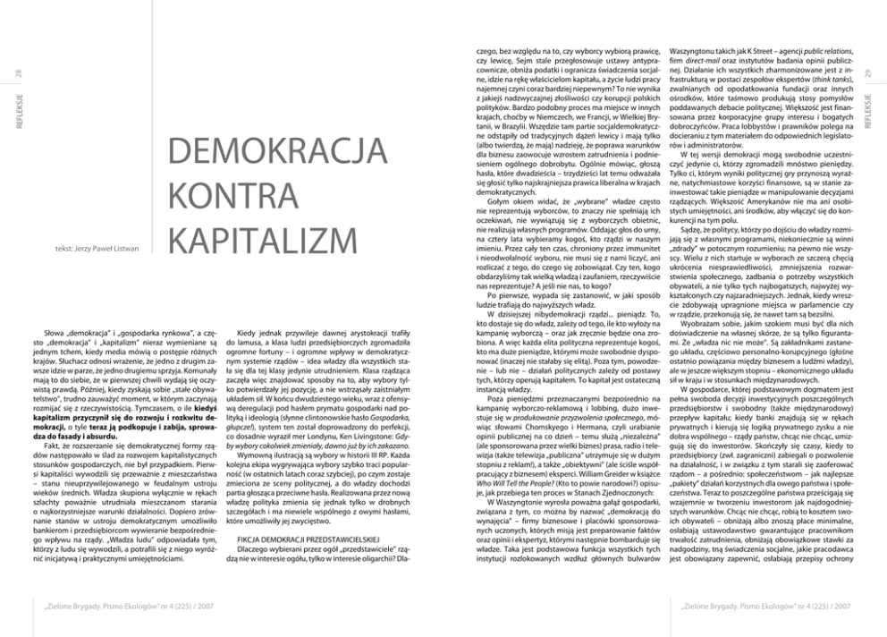 Słowa „demokracja” i „gospodarka rynkowa”, a często „demokracja” i „kapitalizm” nieraz wymieniane są jednym tchem, kiedy media mówią o postępie różnych krajów. Słuchacz odnosi wrażenie, że jedno z drugim zawsze idzie w parze, że jedno drugiemu sprzyja. Komunały mają to do siebie, że w pierwszej chwili wydają się oczywistą prawdą. Później, kiedy zyskają sobie „stałe obywatelstwo”, trudno zauważyć moment, w którym zaczynają rozmijać się z rzeczywistością. Tymczasem, o ile kiedyś kapitalizm przyczynił się do rozwoju i rozkwitu demokracji, o tyle teraz ją podkopuje i zabija, sprowadza do fasady i absurdu. Fakt, że rozszerzanie się demokratycznej formy rządów następowało w ślad za rozwojem kapitalistycznych stosunków gospodarczych, nie był przypadkiem. Pierwsi kapitaliści wywodzili się przeważnie z mieszczaństwa – stanu nieuprzywilejowanego w feudalnym ustroju wieków średnich. Władza skupiona wyłącznie w rękach szlachty poważnie utrudniała mieszczanom starania o najkorzystniejsze warunki działalności. Dopiero zrównanie stanów w ustroju demokratycznym umożliwiło bankierom i przedsiębiorcom wywieranie bezpośredniego wpływu na rządy. „Władza ludu” odpowiadała tym, którzy z ludu się wywodzili, a potrafili się z niego wyróżnić inicjatywą i praktycznymi umiejętnościami. „Zielone Brygady. Pismo Ekologów” nr 4 (225) / 2007 Kiedy jednak przywileje dawnej arystokracji trafiły do lamusa, a klasa ludzi przedsiębiorczych zgromadziła ogromne fortuny – i ogromne wpływy w demokratycznym systemie rządów – idea władzy dla wszystkich stała się dla tej klasy jedynie utrudnieniem. Klasa rządząca zaczęła więc znajdować sposoby na to, aby wybory tylko potwierdzały jej pozycję, a nie wstrząsały zaistniałym układem sił. W końcu dwudziestego wieku, wraz z ofensywą deregulacji pod hasłem prymatu gospodarki nad polityką i ideologią (słynne clintonowskie hasło Gospodarka, głupcze!), system ten został doprowadzony do perfekcji, co dosadnie wyraził mer Londynu, Ken Livingstone: Gdyby wybory cokolwiek zmieniały, dawno już by ich zakazano. Wymowną ilustracją są wybory w historii III RP. Każda kolejna ekipa wygrywająca wybory szybko traci popularność (w ostatnich latach coraz szybciej), po czym zostaje zmieciona ze sceny politycznej, a do władzy dochodzi partia głosząca przeciwne hasła. Realizowana przez nową władzę polityka zmienia się jednak tylko w drobnych szczegółach i ma niewiele wspólnego z owymi hasłami, które umożliwiły jej zwycięstwo. FIKCJA DEMOKRACJI PRZEDSTAWICIELSKIEJ Dlaczego wybierani przez ogół „przedstawiciele” rządzą nie w interesie ogółu, tylko w interesie oligarchii? Dla- „Zielone Brygady. Pismo Ekologów” nr 4 (225) / 2007 29 Waszyngtonu takich jak K Street – agencji public relations, firm direct-mail oraz instytutów badania opinii publicznej. Działanie ich wszystkich zharmonizowane jest z infrastrukturą w postaci zespołów ekspertów (think tanks), zwalnianych od opodatkowania fundacji oraz innych ośrodków, które taśmowo produkują stosy pomysłów poddawanych debacie politycznej. Większość jest finansowana przez korporacyjne grupy interesu i bogatych dobroczyńców. Praca lobbystów i prawników polega na docieraniu z tym materiałem do odpowiednich legislatorów i administratorów. W tej wersji demokracji mogą swobodnie uczestniczyć jedynie ci, którzy zgromadzili mnóstwo pieniędzy. Tylko ci, którym wyniki politycznej gry przynoszą wyraźne, natychmiastowe korzyści finansowe, są w stanie zainwestować takie pieniądze w manipulowanie decyzjami rządzących. Większość Amerykanów nie ma ani osobistych umiejętności, ani środków, aby włączyć się do konkurencji na tym polu. Sądzę, że politycy, którzy po dojściu do władzy rozmijają się z własnymi programami, niekoniecznie są winni „zdrady” w potocznym rozumieniu; na pewno nie wszyscy. Wielu z nich startuje w wyborach ze szczerą chęcią ukrócenia niesprawiedliwości, zmniejszenia rozwarstwienia społecznego, zadbania o potrzeby wszystkich obywateli, a nie tylko tych najbogatszych, najwyżej wykształconych czy najzaradniejszych. Jednak, kiedy wreszcie zdobywają upragnione miejsca w parlamencie czy w rządzie, przekonują się, że nawet tam są bezsilni. Wyobrażam sobie, jakim szokiem musi być dla nich doświadczenie na własnej skórze, że są tylko figurantami. Że „władza nic nie może”. Są zakładnikami zastanego układu, częściowo personalno-korupcyjnego (głośne ostatnio powiązania między biznesem a ludźmi władzy), ale w jeszcze większym stopniu – ekonomicznego układu sił w kraju i w stosunkach międzynarodowych. W gospodarce, której podstawowym dogmatem jest pełna swoboda decyzji inwestycyjnych poszczególnych przedsiębiorstw i swobodny (także międzynarodowy) przepływ kapitału; kiedy banki znajdują się w rękach prywatnych i kierują się logiką prywatnego zysku a nie dobra wspólnego – rządy państw, chcąc nie chcąc, umizgują się do inwestorów. Skończyły się czasy, kiedy to przedsiębiorcy (zwł. zagraniczni) zabiegali o pozwolenie na działalność, i w związku z tym starali się zaoferować rządom – a pośrednio: społeczeństwom – jak najlepsze „pakiety” działań korzystnych dla owego państwa i społeczeństwa. Teraz to poszczególne państwa prześcigają się wzajemnie w tworzeniu inwestorom jak najdogodniejszych warunków. Chcąc nie chcąc, robią to kosztem swoich obywateli – obniżają albo znoszą płace minimalne, osłabiają ustawodawstwo gwarantujące pracownikom trwałość zatrudnienia, obniżają obowiązkowe stawki za nadgodziny, tną świadczenia socjalne, jakie pracodawca jest obowiązany zapewnić, osłabiają przepisy ochrony REFLEKSJE 28 REFLEKSJE tekst: Jerzy Paweł Listwan DEMOKRACJA KONTRA KAPITALIZM czego, bez względu na to, czy wyborcy w