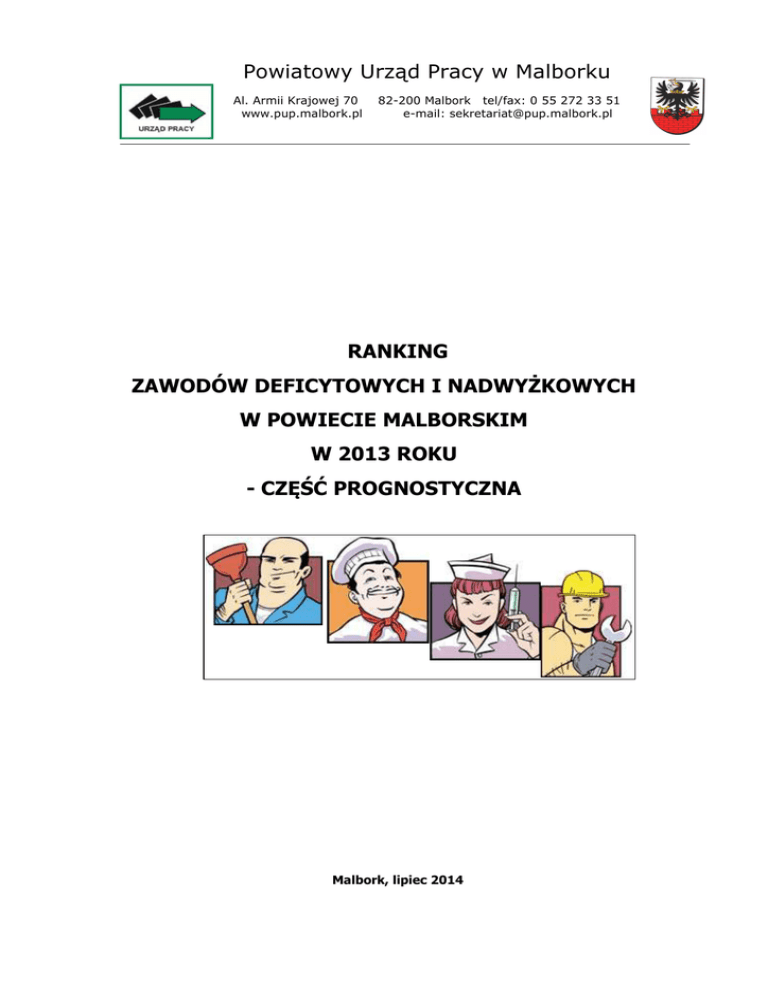 Powiatowy Urząd Pracy w Malborku Al. Armii Krajowej 70 www.pup.malbork.pl 82-200 Malbork tel/fax: 0 55 272 33 51 e-mail: [email protected] RANKING ZAWODÓW DEFICYTOWYCH I NADWYŻKOWYCH W POWIECIE MALBORSKIM W 2013 ROKU - CZĘŚĆ PROGNOSTYCZNA Malbork, lipiec 2014 SPIS TREŚCI CZĘŚĆ PROGNOSTYCZNA 1. Absolwenci szkół ponadgimnazjalnych w powiecie malborskim 1.1 1.2 Strona 3 Absolwenci roku szkolnego 2012/2013 i osoby bezrobotne wg stanu na 31.12.2013 r. 3 Przewidywani absolwenci roku szkolnego 2013/2014 6 2. Wnioski do części prognostycznej 9 Spis tabel 9 2 1 Absolwenci szkół ponadgimnazjalnych w powiecie malborskim. Ministerstwo Pracy i Polityki Społecznej w Warszawie w celu usprawnienia pracy nad raportem rocznym pozyskało z Ministerstwa Edukacji Narodowej, dane dotyczące absolwentów, którzy ukończyli szkołę ponadgimnazjalną w roku 2013 oraz przewidywanej liczby absolwentów w roku 2014 na poziomie powiatów. Powyższe dane zostały umieszczone w SI SYRIUSZ. Powiatowy Urząd Pracy w Malborku w oparciu o tabele wynikowe wygenerowane przy użyciu powyższej aplikacji opracował II część raportu „Ranking zawodów deficytowych i nadwyżkowych w powiecie malborskim w 2013 roku”. Prezentowane dane i poniższa analiza nie uwzględniają szkół dla dorosłych. 1.1 Absolwenci roku szkolnego 2012/2013 i osoby bezrobotne wg stanu na 31.12.2013 roku. W 2013 roku szkoły ponadgimnazjalne z terenu powiatu malborskiego ukończyło 831 osób, z czego 294 osoby zarejestrowane było na dzień 31.12.2013 roku w Powiatowym Urzędzie Pracy w Malborku jako osoby bezrobotne, co stanowiło 35,38% absolwentów szkół. Tabela 1. Liczba absolwentów szkół powiatu malborskiego oraz zarejestrowanych wg stanu na 31.12.2013 r. Absolwenci, Bezrobotni którzy absolwenci Kod Nazwa szkoły Nazwa zawodu ukończyli zarejestrowani zawodu szkołę w w PUP w końcu roku 2013 roku 2013 Szkoły średnie techniczne (technika, licea zawodowe) ogółem Technikum Nr 2 w Malborku Państwowa Szkoła Muzyczna I stopnia w Malborku 64 "311204" Technik drogownictwa Technik architektury "311303" krajobrazu "311408" Technik elektronik "311504" Technik mechanik "311918" Technik poligraf "315317" Technik mechanik lotniczy 16 "343602" Muzyk 3 24 12 7 9 6 20 5 7 11 3 2 2 4 0 Liceum Plastyczne w "343204" Plastyk Malborku ogółem "343403" Technikum nr 3 w Malborku 14 4 158 76 Technik organizacji usług gastronomicznych 23 11 "422402" Technik hotelarstwa 27 7 "331403" Technik ekonomista 21 10 28 14 "351203" Technik informatyk 37 18 "333107" Technik logistyk 22 16 "422103" Technik obsługi turystycznej Licea ogólnokształcące IV Liceum Ogólnokształcące w Malborku I Liceum Ogólnokształcące w Malborku Publiczne Katolickie Liceum Ogólnokształcące w Malborku II Liceum Ogólnokształcące w Malborku "000000" Bez zawodu 123 22 "000000" Bez zawodu 181 12 "000000" Bez zawodu 23 6 "000000" Bez zawodu 97 24 129 91 Zasadnicze szkoły zawodowe ogółem "512002" Kucharz małej gastronomii Zasadnicza Szkoła Zawodowa Nr 1 w Malborku 41 33 "514101" Fryzjer 8 8 "711202" Murarz "722204" Ślusarz 1 2 1 0 32 25 1 8 2 4 1 2 6 1 1 5 0 2 1 0 6 0 "723103" "732201" "711202" "721306" "751201" "751204" "752205" "522301" "732301" Mechanik pojazdów samochodowych Drukarz Murarz Blacharz samochodowy Cukiernik Piekarz Stolarz Sprzedawca Introligator 4 Mechanik - monter maszyn i urządzeń "742102" Monter - elektronik "723310" Zasadnicza Szkoła Zawodowa Nr 5 Specjalna w Malborku ogółem Zasadnicza Szkoła Zawodowa nr 3 w Malborku ogółem 9 3 11 6 6 2 "752205" Stolarz 4 0 "753105" Krawiec 2 2 20 "522301" Sprzedawca 5 20 Razem 831 5 294 Prezentowane powyżej dane wskazują, że najwięcej osób w 2013 roku ukończyło szkoły średnie ogólnokształcące - 424 osoby, z tego 64 zarejestrowane były jako osoby bezrobotne wg stanu na dzień 31.12.2013r. Drugą grupą pod względem liczebności były osoby z wykształceniem średnim zawodowym. W kierunku tym, szkołę ukończyło 252 absolwentów, spośród których 76 osób znajdowało się w ewidencji PUP w Malborku na 31.12.2013 roku. Analizując dane z tabel wynikowych można stwierdzić, że najwięcej osób ukończyło szkoły w następujących zawodach: Tabela 2. Liczba absolwentów wg zawodów o najwyższym poziomie (powyżej 10 osób) w powiecie malborskim Kod zawodu Absolwenci, którzy ukończyli szkołę na terenie powiatu w roku 2013 Nazwa zawodu Bezrobotni absolwenci zarejestrowani w PUP w końcu roku 2013 "512002" Kucharz małej gastronomii* 41 33 "351203" "723103" Technik informatyk* Mechanik pojazdów samochodowych* 37 32 18 25 "422103" "422402" "522301" 28 27 26 14 7 11 "343403" Technik obsługi turystycznej* Technik hotelarstwa* Sprzedawca* Technik organizacji usług gastronomicznych* 23 11 "333107" Technik logistyk* 22 16 "331403" "311408" Technik ekonomista* Technik elektronik* 21 20 10 3 "343602" Muzyk* 16 0 5 "343204" Plastyk* 14 4 "311206" Technik drogownictwa* 12 7 "742102" Monter - elektronik* 11 6 Jak wynika z powyższych danych, najliczniejszą grupę stanowili absolwenci w zawodzie „Kucharz małej gastronomii”. Drugą co do wielkości grupą, były osoby w zawodzie „Technik informatyk”. Należy zauważyć, że wśród absolwentów zarejestrowanych na dzień 31.12.2013r. były osoby, które ukończyły szkoły ponadgimnazjalne poza powiatem malborskim: • Technikum Zawodowe w Elblągu - 4 osoby, • Technikum Zawodowe Suwałki - 2 osoby, • Technikum Wolin - 2 osoby, • Technikum nr 2 w Tczewie – 4 osoby, • Technikum nr 4 w Tczewie - 4 osoby, • Technikum Hotelarskie w Elblągu - 2 osoby, • Technikum Obsługi Turystycznej w Nowym Dworze Gdańskim - 4 osoby, • Zasadnicza Szkoła Zawodowa w Swarożynie - 2 osoby, • Zasadnicza Szkoła Zawodowa nr 1 Barlewiczki - 2 osoby, • Zasadnicza Szkoła Zawodowa nr 2 w Tczewie – 6 osób, • Zasadnicza Szkoła Zawodowa nr 5 Puławy - 2 osoby, • Zasadnicza Szkoła Zawodowa w Nowym Dworze Gdańskim - 2