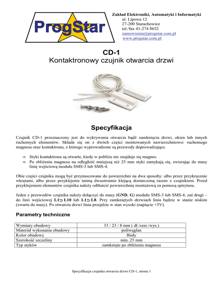 Specyfikacja czujnika otwarcia drzwi CD-1