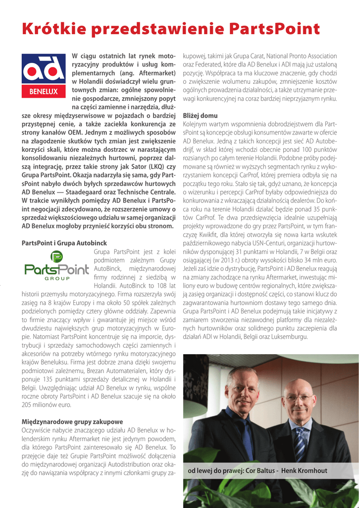 Krótkie przedstawienie PartsPoint W ciągu ostatnich lat rynek motoryzacyjny produktów i usług komplementarnych (ang. Aftermarket) w Holandii doświadczył wielu gruntownych zmian: ogólne spowolnienie gospodarcze, zmniejszony popyt na części zamienne i narzędzia, dłuższe okresy międzyserwisowe w pojazdach o bardziej przystępnej cenie, a także zaciekła konkurencja ze strony kanałów OEM. Jednym z możliwych sposobów na złagodzenie skutków tych zmian jest zwiększenie korzyści skali, które można dostrzec w narastającym konsolidowaniu niezależnych hurtowni, poprzez dalszą integrację, przez takie strony jak Sator (LKQ) czy Grupa PartsPoint. Okazja nadarzyła się sama, gdy PartsPoint nabyło dwóch byłych sprzedawców hurtowych AD Benelux — Staadegaard oraz Technische Centrale. W trakcie wynikłych pomiędzy AD Benelux i PartsPoint negocjacji zdecydowano, że rozszerzenie umowy o sprzedaż większościowego udziału w samej organizacji AD Benelux mogłoby przynieść korzyści obu stronom. PartsPoint i Grupa Autobinck Grupa PartsPoint jest z kolei podmiotem zależnym Grupy AutoBinck, międzynarodowej firmy rodzinnej z siedzibą w Holandii. AutoBinck to 108 lat historii przemysłu motoryzacyjnego. Firma rozszerzyła swój zasięg na 8 krajów Europy i ma około 50 spółek zależnych podzielonych pomiędzy cztery główne oddziały. Zapewnia to firmie znaczący wpływ i gwarantuje jej miejsce wśród dwudziestu największych grup motoryzacyjnych w Europie. Natomiast PartsPoint koncentruje się na imporcie, dystrybucji i sprzedaży samochodowych części zamiennych i akcesoriów na potrzeby wtórnego rynku motoryzacyjnego krajów Beneluksu. Firma jest dobrze znana dzięki swojemu podmiotowi zależnemu, Brezan Automaterialen, który dysponuje 135 punktami sprzedaży detalicznej w Holandii i Belgii. Uwzględniając udział AD Benelux w rynku, wspólne roczne obroty PartsPoint i AD Benelux szacuje się na około 205 milionów euro. Międzynarodowe grupy zakupowe Oczywiście nabycie znaczącego udziału AD Benelux w holenderskim rynku Aftermarket nie jest jedynym powodem, dla którego PartsPoint zainteresowało się AD Benelux. To przejęcie daje też Grupie PartsPoint możliwość dołączenia do międzynarodowej organizacji Autodistribution oraz okazję do nawiązania współpracy z innymi członkami grupy za- kupowej, takimi jak Grupa Carat, National Pronto Association oraz Federated, które dla AD Benelux i ADI mają już ustaloną pozycję. Współpraca ta ma kluczowe znaczenie, gdy chodzi o zwiększenie wolumenu zakupów, zmniejszenie kosztów ogólnych prowadzenia działalności, a także utrzymanie przewagi konkurencyjnej na coraz bardziej nieprzyjaznym rynku. Bliżej domu Kolejnym wartym wspomnienia dobrodziejstwem dla PartsPoint są koncepcje obsługi konsumentów zawarte w ofercie AD Benelux. Jedną z takich koncepcji jest sieć AD Autobedrijf, w skład której wchodzi obecnie ponad 100 punktów rozsianych po całym terenie Holandii. Podobne próby podejmowane są również w wyższych segmentach rynku z wykorzystaniem koncepcji CarProf, której premiera odbyła się na początku tego roku. Stało się tak, gdyż uznano, że koncepcja o wizerunku i percepcji CarProf byłaby odpowiedniejsza do konkurowania z wkraczającą działalnością dealerów. Do końca roku na terenie Holandii działać będzie ponad 35 punktów CarProf. Te dwa przedsięwzięcia idealnie uzupełniają projekty wprowadzone do gry przez PartsPoint, w tym franczyzę Kwikfit, dla której otworzyła się nowa karta wskutek październikowego nabycia USN-Centuri, organizacji hurtowników dysponującej 31 punktami w Holandii, 7 w Belgii oraz osiągającej (w 2013 r.) obroty wysokości blisko 34 mln euro. Jeżeli zaś idzie o dystrybucję, PartsPoint i AD Benelux reagują na zmiany zachodzące na rynku Aftermarket, inwestując miliony euro w budowę centrów regionalnych, które zwiększają zasięg organizacji i dostępność części, co stanowi klucz do zagwarantowania hurtowniom dostawy tego samego dnia. Grupa PartsPoint i AD Benelux podejmują takie inicjatywy z zamiarem stworzenia niezawodnej platformy dla niezależnych hurtowników oraz solidnego punktu zaczepienia dla działań ADI w Holandii, Belgii oraz Luksemburgu. od lewej do prawej: Cor Baltus - Henk Kromhout 9