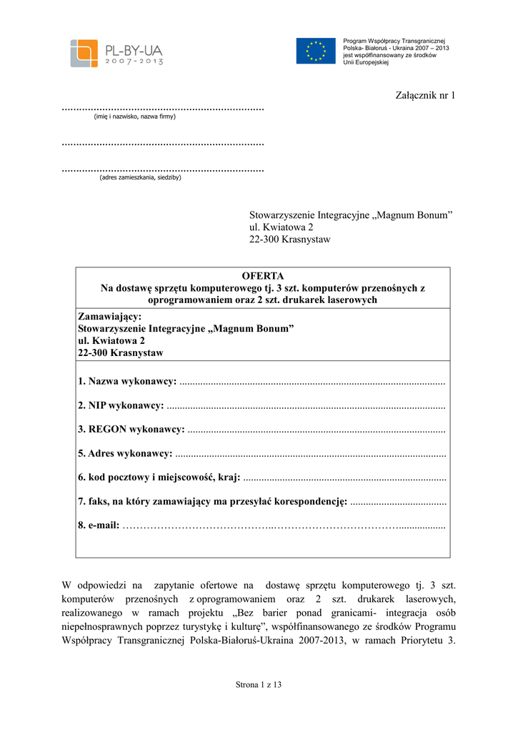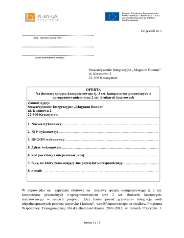 Program Współpracy Transgranicznej Polska- Białoruś - Ukraina 2007 – 2013 jest współfinansowany ze środków Unii Europejskiej ...................................................................... Załącznik nr 1 (imię i nazwisko, nazwa firmy) ...................................................................... ...................................................................... (adres zamieszkania, siedziby) Stowarzyszenie Integracyjne „Magnum Bonum” ul. Kwiatowa 2 22-300 Krasnystaw OFERTA Na dostawę sprzętu komputerowego tj. 3 szt. komputerów przenośnych z oprogramowaniem oraz 2 szt. drukarek laserowych Zamawiający: Stowarzyszenie Integracyjne „Magnum Bonum” ul. Kwiatowa 2 22-300 Krasnystaw 1. Nazwa wykonawcy: ...................................................................................................... 2. NIP wykonawcy: ........................................................................................................... 3. REGON wykonawcy: ................................................................................................... 5. Adres wykonawcy: ........................................................................................................ 6. kod pocztowy i miejscowość, kraj: .............................................................................. 7. faks, na który zamawiający ma przesyłać korespondencję: ..................................... 8. e-mail: ……………………………………..……………………………….................. W odpowiedzi na zapytanie ofertowe na dostawę sprzętu komputerowego tj. 3 szt. komputerów przenośnych z oprogramowaniem oraz 2 szt. drukarek laserowych, realizowanego w ramach projektu „Bez barier ponad granicami- integracja osób niepełnosprawnych poprzez turystykę i kulturę”, współfinansowanego ze środków Programu Współpracy Transgranicznej Polska-Białoruś-Ukraina 2007-2013, w ramach Priorytetu 3. Strona 1 z 13 Program Współpracy Transgranicznej Polska- Białoruś - Ukraina 2007 – 2013 jest współfinansowany ze środków Unii Europejskiej Współpraca sieciowa oraz inicjatywy społeczności lokalnych, Działanie 3.1. Rozwój regionalnych i lokalnych możliwości współpracy transgranicznej. 1. Oferuję wykonanie przedmiotu zamówienia określonego w zapytaniu ofertowym i wzorze umowy w terminie określonym w zapytaniu ofertowym za łączną cenę brutto.......................................zł, słownie:.............................................................................. .............................................................................................................zł), na którą składa się: Przedmiot L.p. zamówienia Marka, typ, model** Ilość 1 Komputer przenośny 3szt. 2 Drukarka laserowa 2 szt. Cena netto za 1szt. ** VAT** Cena brutto za 1 szt. ** Łączna cena brutto Razem ** wypełnia wykonawca 2. Oświadczam/y, że zapoznałam/łem/liśmy się z niniejszym zapytaniem i nie wnoszę/simy zastrzeżeń oraz uzyskałam/em/liśmy konieczne informacje do przygotowania oferty. ……………………………………………… podpis osoby/osób uprawnionej/ych do reprezentowania wykonawcy Strona 2 z 13 Program Współpracy Transgranicznej Polska- Białoruś - Ukraina 2007 – 2013 jest współfinansowany ze środków Unii Europejskiej Załącznik nr 2 …………………………………………. (miejscowość i data) ……………………………….. (Imię i nazwisko/Nazwa Oferenta) Oświadczenie o spełnieniu warunków udziału w postępowaniu Oświadczam, iż spełniam warunki udziału w postępowaniu określone w Zapytaniu Ofertowym nr 7/PL-BY-UA/2014. 1. Znajduję się w sytuacji ekonomicznej i finansowej zapewniającej wykonanie zamówienia. 2. Brak jest podstaw do wykluczenia tj: − W ciągu ostatnich 3 lat przed wszczęciem postępowania nie wyrządziłem szkody, nie wykonując zamówienia lub wykonując je nienależycie. − Nie otwarto wobec mnie likwidacji ani nie ogłoszono upadłości. − Nie zalegam z uiszczeniem podatków, opłat lub składek na ubezpieczenia społeczne lub zdrowotne − Nie zostałem prawomocnie skazany za przestępstwo popełnione w związku z postępowaniem o udzielenie zamówienia, przestępstwo przekupstwa, przestępstwo przeciwko obrotowi gospodarczemu lub inne przestępstwo popełnione w celu osiągnięcia korzyści majątkowych − Jako wspólnik spółki jawnej, partner lub członek zarządu spółki partnerskiej; komplementariusz spółki komandytowej oraz spółki komandytowo-akcyjnej; członek organu zarządzającego osoby prawnej nie zostałem prawomocnie skazany za przestępstwo popełnione w związku z postępowaniem o udzielenie zamówienia, przestępstwo przekupstwa, przestępstwo przeciwko obrotowi gospodarczemu lub inne przestępstwo popełnione w celu osiągnięcia korzyści majątkowych. − Jako podmiot zbiorowy sąd nie orzekł wobec mnie zakazu ubiegania się o zamówienia, na podstawie przepisów o odpowiedzialności podmiotów zbiorowych za czyny zabronione pod groźbą kary. ……………………………………… Podpis Oferenta Strona 3 z 13 Program Współpracy Transgranicznej Polska- Białoruś - Ukraina 2007 – 2013 jest współfinansowany ze środków Unii Europejskiej Załącznik nr 3 …………………………………………. (miejscowość i data) ……………………………….. (Imię i nazwisko/Nazwa Oferenta) Oświadczenie Oferenta Oświadczam, że posiadam niezbędną wiedzę i doświadczenie oraz dysponuję potencjałem technicznym i osobami zdolnymi do wykonania zamówienia. ……………………………………….. (podpis Oferenta) Strona 4 z 13 Program Współpracy Transgranicznej Polska- Białoruś - Ukraina 2007 – 2013 jest współfinansowany ze środków Unii Europejskiej Załącznik nr 4 …………………………………………. (miejscowość i data) ……………………