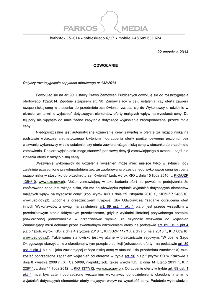 Powołując się na art 90. Ustawy Prawo Zamówień Publicznych odwołuję się od rozstrzygnięcia