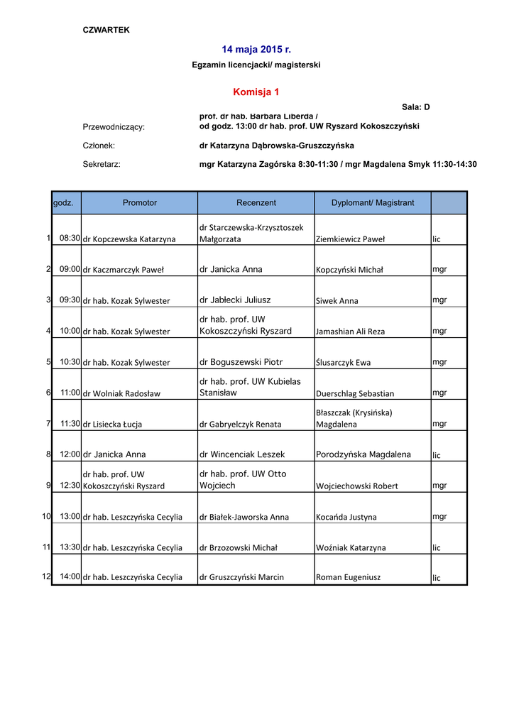 CZWARTEK 14 maja 2015 r. Egzamin licencjacki/ magisterski Komisja 1 godz. Przewodniczący: Sala: D prof. dr hab. Barbara Liberda / od godz. 13:00 dr hab. prof. UW Ryszard Kokoszczyński Członek: dr Katarzyna Dąbrowska-Gruszczyńska Sekretarz: mgr Katarzyna Zagórska 8:30-11:30 / mgr Magdalena Smyk 11:30-14:30 Promotor Recenzent Dyplomant/ Magistrant 1 08:30 dr Kopczewska Katarzyna dr Starczewska-‐Krzysztoszek Małgorzata Ziemkiewicz Paweł lic 2 09:00 dr Kaczmarczyk Paweł dr Janicka Anna Kopczyński Michał mgr 3 09:30 dr hab. Kozak Sylwester dr Jabłecki Juliusz Siwek Anna mgr 4 10:00 dr hab. Kozak Sylwester dr hab. prof. UW Kokoszczyński Ryszard Jamashian Ali Reza mgr 5 10:30 dr hab. Kozak Sylwester dr Boguszewski Piotr Ślusarczyk Ewa mgr 6 11:00 dr Wolniak Radosław dr hab. prof. UW Kubielas Stanisław Duerschlag Sebastian mgr 7 11:30 dr Lisiecka Łucja dr Gabryelczyk Renata Błaszczak (Krysińska) Magdalena mgr 8 12:00 dr Janicka Anna dr Wincenciak Leszek Porodzyńska Magdalena lic 9 12:30 Kokoszczyński Ryszard dr hab. prof. UW dr hab. prof. UW Otto Wojciech Wojciechowski Robert mgr 10 13:00 dr hab. Leszczyńska Cecylia dr Białek-‐Jaworska Anna Kocańda Justyna mgr 11 13:30 dr hab. Leszczyńska Cecylia dr Brzozowski Michał Woźniak Katarzyna lic 12 14:00 dr hab. Leszczyńska Cecylia dr Gruszczyński Marcin Roman Eugeniusz lic