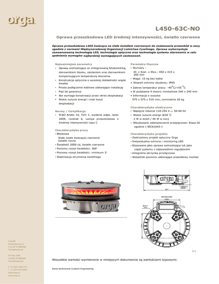L450-63C-NO Oprawa przeszkodowa LED średniej intensywności, światło czerwone Oprawa przeszkodowa L450 świecąca na stałe światłem czerwonym do znakowania przeszkód w nocy zgodnie z normami Międzynarodowej Organizacji Lotnictwa Cywilnego. Oprawa wykorzystuje zaawansowaną technologię LED, technologie optyczne oraz technologie systemu sterowania w celu spełnienia wymogów najbardziej wymagających zastosowań. Najważniejsze parametry • Oprawa wolnostojąca ze zintegrowaną fotokomórką, sterownikiem błysku, zasilaniem oraz sterownikiem kompensującym temperaturę otoczenia. Parametry fizyczne • Wymiary : Dł. x Szer. x Wys.: 450 x 415 x 265 mm • Waga: 15 kg bez kabla • Konstrukcja optyczna o wysokiej dokładności wiązki światła • Proste podłączenie kablowe ułatwiające instalację • Zakres temperatur pracy: -40ºC/+55 ºC • Pięć lat gwarancji • W podstawie 4 otwory montażowe 240 x 240 mm • • Nie wymaga konserwacji przez okres eksploatacji • Informacja o wysyłce Niskie zużycie energii i niski koszt • Stopień ochrony obudowy: IP65 575 x 575 x 510 mm; nominalnie 20 kg eksploatacji Charakterystyka elektryczna Normy / Certyfikacja • ICAO Aneks 14, Tom 1, wydanie piąte, lipiec 2009, rozdział 6, Lampa przeszkodowa o średniej intensywności typu C • Napięcie robocze 110-254 V AC, 50-60 Hz • Niskie zużycie energii @20 ºC 2 W w dzień / 40 W w nocy • Wbudowane zabezpieczenie przepięciowe: Klasa III zgodnie z IEC61643-1 Charakterystyka pracy • Błyskowa Stałe (stale świecące) czerwone światło nocne • Światłość 2000 cd, światło czerwone • Poziomy rozsył światłości: 360° Charakterystyka projektu • Zastrzeżony projekt optyczny Orga • Indywidualna ochrona i monitoring LED • Stosowana jako oprawa wolnostojąca lub jako część systemu z odpowiednim regulatorem • Pionowy rozsył światłości: minimum 3° • Integralna skrzynka przyłączowa • Stabilizacja strumienia świetlnego • Wskaźniki poziomu ułatwiające prawidłowy montaż R4 Wszystkie wartości wymienione w niniejszym dokumencie są wartościami typowymi. Dane techniczne Custom Engineering