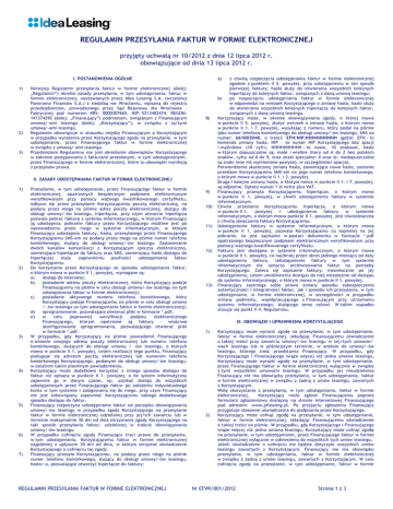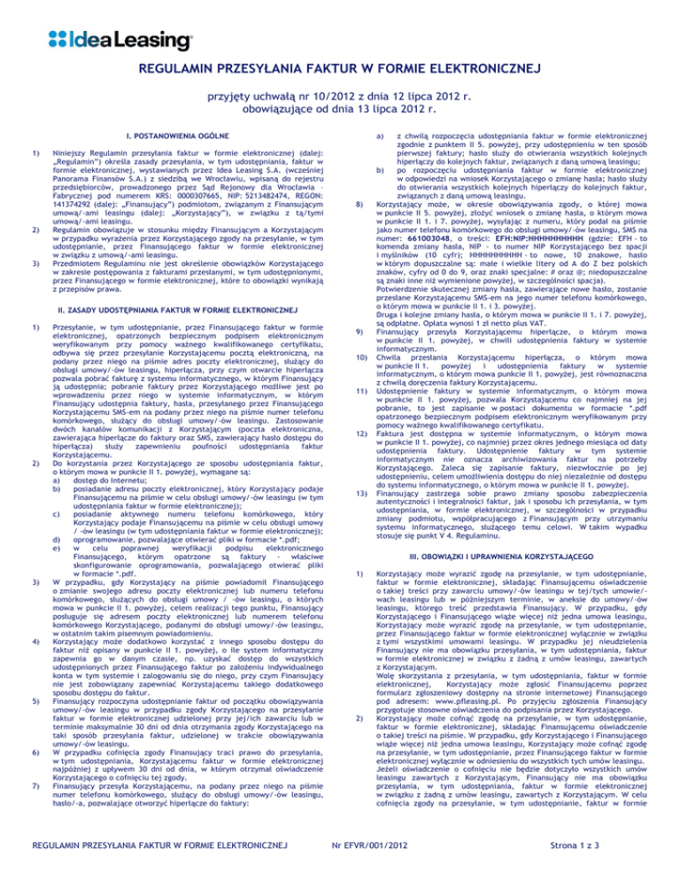 REGULAMIN PRZESYŁANIA FAKTUR W FORMIE ELEKTRONICZNEJ przyjęty uchwałą nr 10/2012 z dnia 12 lipca 2012 r. obowiązujące od dnia 13 lipca 2012 r. I. POSTANOWIENIA OGÓLNE 1) 2) 3) Niniejszy Regulamin przesyłania faktur w formie elektronicznej (dalej: „Regulamin”) określa zasady przesyłania, w tym udostępniania, faktur w formie elektronicznej, wystawianych przez Idea Leasing S.A. (wcześniej Panorama Finansów S.A.) z siedzibą we Wrocławiu, wpisaną do rejestru przedsiębiorców, prowadzonego przez Sąd Rejonowy dla Wrocławia – Fabrycznej pod numerem KRS: 0000307665, NIP: 5213482474, REGON: 141374292 (dalej: „Finansujący”) podmiotom, związanym z Finansującym umową/-ami leasingu (dalej: „Korzystający”), w związku z tą/tymi umową/-ami leasingu. Regulamin obowiązuje w stosunku między Finansującym a Korzystającym w przypadku wyrażenia przez Korzystającego zgody na przesyłanie, w tym udostępnianie, przez Finansującego faktur w formie elektronicznej w związku z umową/-ami leasingu. Przedmiotem Regulaminu nie jest określenie obowiązków Korzystającego w zakresie postępowania z fakturami przesłanymi, w tym udostępnionymi, przez Finansującego w formie elektronicznej, które to obowiązki wynikają z przepisów prawa. a) 8) II. ZASADY UDOSTĘPNIANIA FAKTUR W FORMIE ELEKTRONICZNEJ 1) 2) 3) 4) 5) 6) 7) Przesyłanie, w tym udostępnianie, przez Finansującego faktur w formie elektronicznej, opatrzonych bezpiecznym podpisem elektronicznym weryfikowanym przy pomocy ważnego kwalifikowanego certyfikatu, odbywa się przez przesyłanie Korzystającemu pocztą elektroniczną, na podany przez niego na piśmie adres poczty elektronicznej, służący do obsługi umowy/-ów leasingu, hiperłącza, przy czym otwarcie hiperłącza pozwala pobrać fakturę z systemu informatycznego, w którym Finansujący ją udostępnia; pobranie faktury przez Korzystającego możliwe jest po wprowadzeniu przez niego w systemie informatycznym, w którym Finansujący udostępnia faktury, hasła, przesyłanego przez Finansującego Korzystającemu SMS-em na podany przez niego na piśmie numer telefonu komórkowego, służący do obsługi umowy/-ów leasingu. Zastosowanie dwóch kanałów komunikacji z Korzystającym (poczta elektroniczna, zawierająca hiperłącze do faktury oraz SMS, zawierający hasło dostępu do hiperłącza) służy zapewnieniu poufności udostępniania faktur Korzystającemu. Do korzystania przez Korzystającego ze sposobu udostępniania faktur, o którym mowa w punkcie II 1. powyżej, wymagane są: a) dostęp do Internetu; b) posiadanie adresu poczty elektronicznej, który Korzystający podaje Finansującemu na piśmie w celu obsługi umowy/-ów leasingu (w tym udostępniania faktur w formie elektronicznej); c) posiadanie aktywnego numeru telefonu komórkowego, który Korzystający podaje Finansującemu na piśmie w celu obsługi umowy / -ów leasingu (w tym udostępniania faktur w formie elektronicznej); d) oprogramowanie, pozwalające otwierać pliki w formacie *.pdf; e) w celu poprawnej weryfikacji podpisu elektronicznego Finansującego, którym opatrzone są faktury - właściwe skonfigurowanie oprogramowania, pozwalającego otwierać pliki w formacie *.pdf. W przypadku, gdy Korzystający na piśmie powiadomił Finansującego o zmianie swojego adresu poczty elektronicznej lub numeru telefonu komórkowego, służących do obsługi umowy / -ów leasingu, o których mowa w punkcie II 1. powyżej, celem realizacji tego punktu, Finansujący posługuje się adresem poczty elektronicznej lub numerem telefonu komórkowego Korzystającego, podanymi do obsługi umowy/-ów leasingu, w ostatnim takim pisemnym powiadomieniu. Korzystający może dodatkowo korzystać z innego sposobu dostępu do faktur niż opisany w punkcie II 1. powyżej, o ile system informatyczny zapewnia go w danym czasie, np. uzyskać dostęp do wszystkich udostępnionych przez Finansującego faktur po założeniu indywidualnego konta w tym systemie i zalogowaniu się do niego, przy czym Finansujący nie jest zobowiązany zapewniać Korzystającemu takiego dodatkowego sposobu dostępu do faktur. Finansujący rozpoczyna udostępnianie faktur od początku obowiązywania umowy/-ów leasingu w przypadku zgody Korzystającego na przesyłanie faktur w formie elektronicznej udzielonej przy jej/ich zawarciu lub w terminie maksymalnie 30 dni od dnia otrzymania zgody Korzystającego na taki sposób przesyłania faktur, udzielonej w trakcie obowiązywania umowy/-ów leasingu. W przypadku cofnięcia zgody Finansujący traci prawo do przesyłania, w tym udostępniania, Korzystającemu faktur w formie elektronicznej najpóźniej z upływem 30 dni od dnia, w którym otrzymał oświadczenie Korzystającego o cofnięciu tej zgody. Finansujący przesyła Korzystającemu, na podany przez niego na piśmie numer telefonu komórkowego, służący do obsługi umowy/-ów leasingu, hasło/-a, pozwalające otworzyć hiperłącze do faktury: REGULAMIN PRZESYŁANIA FAKTUR W FORMIE ELEKTRONICZNEJ 9) 10) 11) 12) 13) z chwilą rozpoczęcia udostępniania faktur w formie elektronicznej zgodnie z punktem II 5. powyżej, przy udostępnieniu w ten sposób pierwszej faktury; hasło służy do otwierania wszystkich kolejnych hiperłączy do kolejnych faktur, związanych z daną umową leasingu; b) po rozpoczęciu udostępniania faktur w formie elektronicznej w odpowiedzi na wniosek Korzystającego o zmianę hasła; hasło służy do otwierania wszystkich kolejnych hiperłączy do kolejnych faktur, związanych z daną umową leasingu. Korzystający może, w okresie obowiązywania zgody, o której mowa w punkcie II 5. powyżej, złożyć wniosek o zmianę hasła, o którym mowa w punkcie II 1. i 7. powyżej, wysyłając z numeru, który podał na piśmie jako numer telefonu komórkowego do obsługi umowy/-ów leasingu, SMS na numer: 661003048, o treści: EFH:NIP:HHHHHHHHHH (gdzie: EFH - to komenda zmiany hasła, NIP - to numer NIP Korzy