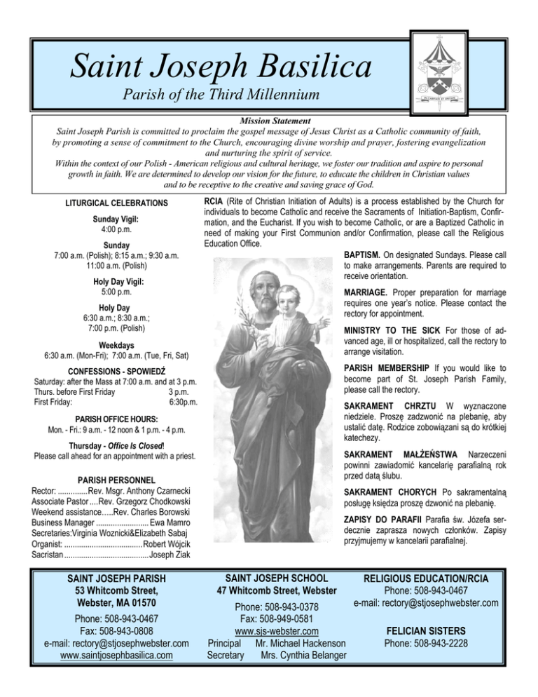 Saint Joseph Basilica Parish of the Third Millennium Mission Statement Saint Joseph Parish is committed to proclaim the gospel message of Jesus Christ as a Catholic community of faith, by promoting a sense of commitment to the Church, encouraging divine worship and prayer, fostering evangelization and nurturing the spirit of service. Within the context of our Polish - American religious and cultural heritage, we foster our tradition and aspire to personal growth in faith. We are determined to develop our vision for the future, to educate the children in Christian values and to be receptive to the creative and saving grace of God. LITURGICAL CELEBRATIONS Sunday Vigil: 4:00 p.m. Sunday 7:00 a.m. (Polish); 8:15 a.m.; 9:30 a.m. 11:00 a.m. (Polish) Holy Day Vigil: 5:00 p.m. RCIA (Rite of Christian Initiation of Adults) is a process established by the Church for individuals to become Catholic and receive the Sacraments of Initiation-Baptism, Confirmation, and the Eucharist. If you wish to become Catholic, or are a Baptized Catholic in need of making your First Communion and/or Confirmation, please call the Religious Education Office. BAPTISM. On designated Sundays. Please call to make arrangements. Parents are required to receive orientation. MARRIAGE. Proper preparation for marriage requires one year’s notice. Please contact the rectory for appointment. Holy Day 6:30 a.m.; 8:30 a.m.; 7:00 p.m. (Polish) MINISTRY TO THE SICK For those of advanced age, ill or hospitalized, call the rectory to arrange visitation. Weekdays 6:30 a.m. (Mon-Fri); 7:00 a.m. (Tue, Fri, Sat) PARISH MEMBERSHIP If you would like to become part of St. Joseph Parish Family, please call the rectory. CONFESSIONS - SPOWIEDŹ Saturday: after the Mass at 7:00 a.m. and at 3 p.m. Thurs. before First Friday 3 p.m. First Friday: 6:30p.m. SAKRAMENT CHRZTU W wyznaczone niedziele. Proszę zadzwonić na plebanię, aby ustalić datę. Rodzice zobowiązani są do krótkiej katechezy. PARISH OFFICE HOURS: Mon. - Fri.: 9 a.m. - 12 noon & 1 p.m. - 4 p.m. Thursday - Office Is Closed! Please call ahead for an appointment with a priest. SAKRAMENT MAŁŻEŃSTWA Narzeczeni powinni zawiadomić kancelarię parafialną rok przed datą ślubu. PARISH PERSONNEL Rector: .............. Rev. Msgr. Anthony Czarnecki Associate Pastor .... Rev. Grzegorz Chodkowski Weekend assistance…..Rev. Charles Borowski Business Manager ......................... Ewa Mamro Secretaries:Virginia Woznicki&Elizabeth Sabaj Organist: ..................................... Robert Wójcik Sacristan ........................................ Joseph Ziak SAINT JOSEPH PARISH 53 Whitcomb Street, Webster, MA 01570 Phone: 508-943-0467 Fax: 508-943-0808 e-mail: [email protected] www.saintjosephbasilica.com SAKRAMENT CHORYCH Po sakramentalną posługę księdza proszę dzwonić na plebanię. ZAPISY DO PARAFII Parafia św. Józefa serdecznie zaprasza nowych członków. Zapisy przyjmujemy w kancelarii parafialnej. SAINT JOSEPH SCHOOL 47 Whitcomb Street, Webster Phone: 508-943-0378 Fax: 508-949-0581 www.sjs-webster.com Principal Mr. Michael Hackenson Secretary Mrs. Cynthia Belanger RELIGIOUS EDUCATION/RCIA Phone: 508-943-0467 e-mail: [email protected] FELICIAN SISTERS Phone: 508-943-2228 Page 2 October 23, 2016 Masses for the week—Msze Św. w Tygodniu Sunday Vigil 4:00pm r.s. Edward W. Szymczak (49th anniv.) - int. Family Sunday - October 23 7:00 ś. p. Regina Hynek (3r. sm.) - int. córka z dzieczmi 8:15 For the parishioners of St. Joseph Basilica 9:30 r.s. Tessie Lenkiewicz (22nd anniv.) - Son, daughters, sons-in-law, grandchildren and great-grandchildren 11:00 ś.p. Leon Mamro (22 r. śm.) - int. syn Michał z rodziną Monday - October 24 6:30 Za wypominki Tuesday– October 25 6:30 r.s. Regina Sielawa - int. Stella Miller Wednesday - October 26 6:30 śp. Grzegorz Nieściór - int. Józef Nieściór 7:00pm Prosząc św. Józefa o nawrocenie syna Damiana oraz ospokój duszy zmarłych z rodzin Góreckich i Wysockich - int. Krystyna Górecka Thursday - October 27 6:30 ś.p. Zenona Jankowska - int. Aniela Jankowska Friday - October 28 6:30 r.s. Margaret Skarbek - int. Theresa (Dudek) Jankowski 7:00 Za wypominki Saturday – October 29 7:00 r.s. Alane Czyżewski Davis (21st anniv.) and James Davis - int. Vanessa Davis Sunday Vigil 4:00 r.s. Elizabeth Romanek - int. Sister and family Sunday - Otober 30 7:00 ś.p. Zofia Stoś (4r. śm.) - int. córka Maria z rodziną 8:15 For the parishioners of St. Joseph Basilica 9:30 r.s. Ziggy Czernicki - int. Wife, Doris and family 11:00 ś.p. Józef Portka (9 r. śm.) - int. córka Danuta I-25 Club Winner for 4th week #118—Michael Hackenson Stewardship Note: “. . . . For whoever exalts himself will be humbled, and the one who humbles himself will be exalted.” Pride and ego is the root cause of most of our sins. Thinking your time is so valuable, your talent is better than anyone else and your money gives you status is another way of making those things “gods” before God. Remember all those gifts were God-given. Instead we should be humbled by God’s abundant generosity and our hearts should be filled with gratitude. SHARING OUR BLESSINGS-October 16, 2016 Weekly Collection—$5,736 Haiti Collection—$689 Thank you for your continued support! 23 października 2016 r. THIRTIETH SUNDAY IN ORDINARY TIME October 23, 2016 The prayer of the lowly pierces the clouds; it does not rest until it reaches its goal, nor will it withdraw till the Most High responds. Sirach 35:17‑18a NO COMPARISONS How many times have we read or heard about someone who’s gotten into trouble—maybe even fired from a job—because of a brush with the law? While our “Christian” minds tell us to be sorry and even pray for the person, a little voice inside our heads may also be saying, “I’m glad I would never do anything like that.” And perhaps we wouldn’t. But are there some things we do that are still not pleasing in God’s eyes? Today’s readings caution us