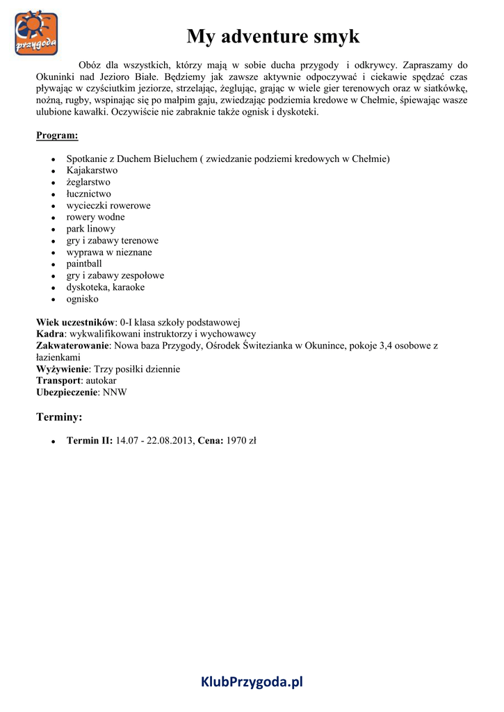 My adventure smyk Obóz dla wszystkich, którzy mają w sobie ducha przygody i odkrywcy. Zapraszamy do Okuninki nad Jezioro Białe. Będziemy jak zawsze aktywnie odpoczywać i ciekawie spędzać czas pływając w czyściutkim jeziorze, strzelając, żeglując, grając w wiele gier terenowych oraz w siatkówkę, nożną, rugby, wspinając się po małpim gaju, zwiedzając podziemia kredowe w Chełmie, śpiewając wasze ulubione kawałki. Oczywiście nie zabraknie także ognisk i dyskoteki. Program: Spotkanie z Duchem Bieluchem ( zwiedzanie podziemi kredowych w Chełmie) Kajakarstwo żeglarstwo łucznictwo wycieczki rowerowe rowery wodne park linowy gry i zabawy terenowe wyprawa w nieznane paintball gry i zabawy zespołowe dyskoteka, karaoke ognisko Wiek uczestników: 0-I klasa szkoły podstawowej Kadra: wykwalifikowani instruktorzy i wychowawcy Zakwaterowanie: Nowa baza Przygody, Ośrodek Świtezianka w Okunince, pokoje 3,4 osobowe z łazienkami Wyżywienie: Trzy posiłki dziennie Transport: autokar Ubezpieczenie: NNW Terminy: Termin II: 14.07 - 22.08.2013, Cena: 1970 zł KlubPrzygoda.pl