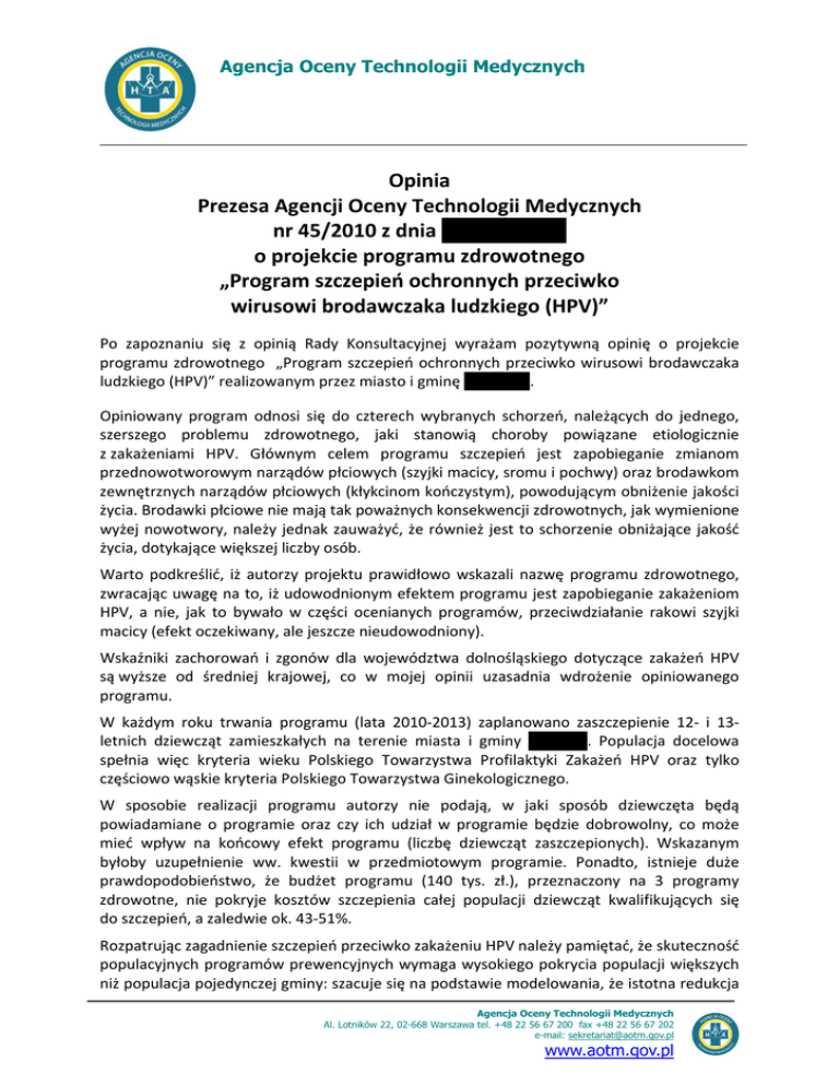 Agencja Oceny Technologii Medycznych Opinia Prezesa Agencji Oceny Technologii Medycznych nr 45/2010 z dnia o projekcie programu zdrowotnego „Program szczepień ochronnych przeciwko wirusowi brodawczaka ludzkiego (HPV)” Po zapoznaniu się z opinią Rady Konsultacyjnej wyrażam pozytywną opinię o projekcie programu zdrowotnego „Program szczepień ochronnych przeciwko wirusowi brodawczaka ludzkiego (HPV)” realizowanym przez miasto i gminę x . Opiniowany program odnosi się do czterech wybranych schorzeń, należących do jednego, szerszego problemu zdrowotnego, jaki stanowią choroby powiązane etiologicznie z zakażeniami HPV. Głównym celem programu szczepień jest zapobieganie zmianom przednowotworowym narządów płciowych (szyjki macicy, sromu i pochwy) oraz brodawkom zewnętrznych narządów płciowych (kłykcinom kończystym), powodującym obniżenie jakości życia. Brodawki płciowe nie mają tak poważnych konsekwencji zdrowotnych, jak wymienione wyżej nowotwory, należy jednak zauważyć, że również jest to schorzenie obniżające jakość życia, dotykające większej liczby osób. Warto podkreślić, iż autorzy projektu prawidłowo wskazali nazwę programu zdrowotnego, zwracając uwagę na to, iż udowodnionym efektem programu jest zapobieganie zakażeniom HPV, a nie, jak to bywało w części ocenianych programów, przeciwdziałanie rakowi szyjki macicy (efekt oczekiwany, ale jeszcze nieudowodniony). Wskaźniki zachorowań i zgonów dla województwa dolnośląskiego dotyczące zakażeń HPV są wyższe od średniej krajowej, co w mojej opinii uzasadnia wdrożenie opiniowanego programu. W każdym roku trwania programu (lata 2010‐2013) zaplanowano zaszczepienie 12‐ i 13‐ letnich dziewcząt zamieszkałych na terenie miasta i gminy x . Populacja docelowa spełnia więc kryteria wieku Polskiego Towarzystwa Profilaktyki Zakażeń HPV oraz tylko częściowo wąskie kryteria Polskiego Towarzystwa Ginekologicznego. W sposobie realizacji programu autorzy nie podają, w jaki sposób dziewczęta będą powiadamiane o programie oraz czy ich udział w programie będzie dobrowolny, co może mieć wpływ na końcowy efekt programu (liczbę dziewcząt zaszczepionych). Wskazanym byłoby uzupełnienie ww. kwestii w przedmiotowym programie. Ponadto, istnieje duże prawdopodobieństwo, że budżet programu (140 tys. zł.), przeznaczony na 3 programy zdrowotne, nie pokryje kosztów szczepienia całej populacji dziewcząt kwalifikujących się do szczepień, a zaledwie ok. 43‐51%. Rozpatrując zagadnienie szczepień przeciwko zakażeniu HPV należy pamiętać, że skuteczność populacyjnych programów prewencyjnych wymaga wysokiego pokrycia populacji większych niż populacja pojedynczej gminy: szacuje się na podstawie modelowania, że istotna redukcja Agencja Oceny Technologii Medycznych Al. Lotników 22, 02-668 Warszawa tel. +48 22 56 67 200 fax +48 22 56 67 202 e-mail: [email protected] www.aotm.gov.pl raków szyjki macicy, zależnych od typów HPV występujących w szczepionce, wymaga zaszczepienia ponad 70% populacji i utrzymywania się immunoprotekcji przez co najmniej 10 lat. Opis sposobu realizacji może stwarzać wrażenie, że planowana edukacja będzie wdrażana po szczepieniu, tymczasem powinna ona stanowić istotną część programu i być skierowana do całej populacji młodzieży oraz rodziców i opiekunów (w zakresie cytologicznych badań przesiewowych). W programie brakuje wymagań co do osób mających edukować uczestników programu. Wskazuję również na ogromne znaczenie edukacji zdrowotnej dotyczącej profilaktyki raka szyjki macicy. Zaszczepione kobiety muszą mieć świadomość, że szczepionka nie gwarantuje ochrony przed wszystkimi typami wirusa HPV i absolutnie konieczne jest wykonywanie przesiewowych badań cytologicznych. Szczepienia przeciwko zakażeniu HPV są obiecującym i zalecanym w wielu krajach sposobem prewencji pierwotnej raka szyjki macicy i innych raków związanych z zakażeniem HPV (typu 16/18 albo 16/18 i 6/11). Jednak rzeczywiste przełożenie się szczepień na zmniejszenie wskaźników zapadalności i śmiertelności znane będzie dopiero po długim czasie stosowania szczepionek. Pożądane byłoby ponadto wyjściowe określenie, a następnie długotrwałe monitorowanie (na podstawie danych uzyskanych z Narodowego Funduszu Zdrowia) odsetka osób zgłaszających się na przesiewowe badania cytologiczne. Jego zwiększenie mogłoby przemawiać za skutecznością podejmowanych w programie działań edukacyjnych, a także stanowiłoby spełnienie postulatu światowych rekomendacji klinicznych. 2/2