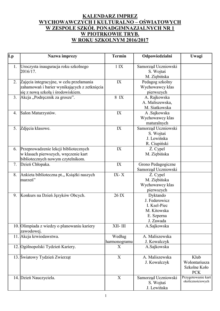 Kalendarz imprez szkolnych na rok szkolny 2016/2017