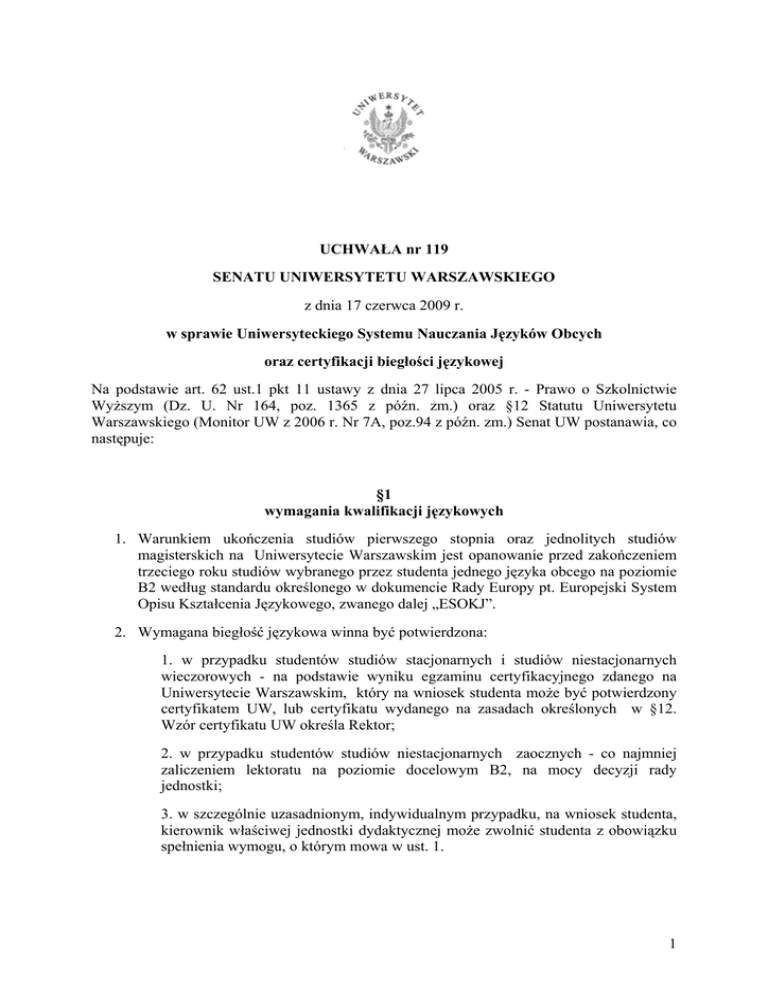 UCHWAŁA nr 119 SENATU UNIWERSYTETU WARSZAWSKIEGO z dnia 17 czerwca 2009 r. w sprawie Uniwersyteckiego Systemu Nauczania Języków Obcych oraz certyfikacji biegłości językowej Na podstawie art. 62 ust.1 pkt 11 ustawy z dnia 27 lipca 2005 r. - Prawo o Szkolnictwie Wyższym (Dz. U. Nr 164, poz. 1365 z późn. zm.) oraz §12 Statutu Uniwersytetu Warszawskiego (Monitor UW z 2006 r. Nr 7A, poz.94 z późn. zm.) Senat UW postanawia, co następuje: §1 wymagania kwalifikacji językowych 1. Warunkiem ukończenia studiów pierwszego stopnia oraz jednolitych studiów magisterskich na Uniwersytecie Warszawskim jest opanowanie przed zakończeniem trzeciego roku studiów wybranego przez studenta jednego języka obcego na poziomie B2 według standardu określonego w dokumencie Rady Europy pt. Europejski System Opisu Kształcenia Językowego, zwanego dalej „ESOKJ”. 2. Wymagana biegłość językowa winna być potwierdzona: 1. w przypadku studentów studiów stacjonarnych i studiów niestacjonarnych wieczorowych - na podstawie wyniku egzaminu certyfikacyjnego zdanego na Uniwersytecie Warszawskim, który na wniosek studenta może być potwierdzony certyfikatem UW, lub certyfikatu wydanego na zasadach określonych w §12. Wzór certyfikatu UW określa Rektor; 2. w przypadku studentów studiów niestacjonarnych zaocznych - co najmniej zaliczeniem lektoratu na poziomie docelowym B2, na mocy decyzji rady jednostki; 3. w szczególnie uzasadnionym, indywidualnym przypadku, na wniosek studenta, kierownik właściwej jednostki dydaktycznej może zwolnić studenta z obowiązku spełnienia wymogu, o którym mowa w ust. 1. 1 §2 lektoraty 1. Organizację procesu nauczania i doskonalenia znajomości języków obcych, tj. nabywania kompetencji językowych i międzykulturowych zgodnych ze standardami ESOKJ, stanowiących podstawę procesu certyfikacji biegłości językowej na UW, o których mowa w §1, zapewnia Uniwersytecki System Nauczania Języków Obcych, zwany dalej „USNJO”. 2. Przedmiotem działania USNJO jest nauczanie języków obcych w formie lektoratów, zgodnie z zasadami zapewniania i doskonalenia jakości kształcenia sformułowanych w ramach uniwersyteckiego systemu zapewniania jakości kształcenia. W przypadku studentów zagranicznych, język polski może być językiem obcym w rozumieniu niniejszej Uchwały. Językiem takim nie może być język ojczysty studenta lub język urzędowy/oficjalny kraju pochodzenia studenta. 3. Przez lektorat rozumie się nauczanie niekierunkowych języków obcych, to jest takich, które nie stanowią przedmiotu studiów studenta. 4. Do prowadzenia lektoratów w ramach USNJO, zwanych dalej "lektoratami USNJO" są uprawnione następujące jednostki organizacyjne UW, zwane dalej Jednostkami Prowadzącymi Lektoraty - „JPL”: 1) Wydział Lingwistyki Stosowanej; 2) Wydział Neofilologii; 3) Wydział Orientalistyczny; 4) Wydział Polonistyki; 5) Szkoła Języków Obcych; 6) Centrum Kształcenia Nauczycieli Języków Obcych i Edukacji Europejskiej. 5. JPL mogą również oferować alternatywne formy kształcenia językowego, np. poprzez udostępnianie pracowni i narzędzi multimedialnych, centrów samokształcenia itp. pod opieką wykwalifikowanych nauczycieli. 6. JPL mogą oferować lektoraty języków obcych z inicjatywy i we współpracy z Centrum Otwartej i Multimedialnej Edukacji z wykorzystaniem technik e-kształcenia (nowych technologii informacyjnych i komunikacyjnych). 7. Lektoraty i inne oferowane w ramach USNJO formy kształcenia językowego kończą się zaliczeniem na ocenę, wystawianą przez nauczyciela prowadzącego zajęcia. 8. Lektoraty i inne formy kształcenia językowego zaliczane są na podstawie uzgodnionych przez JPL-e kryteriów. 9. Sylabusy lektoratów oferowanych przez JPL-e są oparte na ramowych programach nauczania opracowanych z uwzględnieniem efektów kształcenia przewidzianych w ESOKJ. 2 §3 warunki korzystania z USNJO 1. Lektoraty USNJO są dostępne dla wszystkich studentów UW, przy czym student ma prawo do wyboru dowolnego lektoratu. Prawo to nie powinno być ograniczone planem studiów. 2. Studenci stacjonarnych studiów pierwszego stopnia oraz jednolitych studiów magisterskich mają prawo do bezpłatnego korzystania z lektoratów języka obcego w wymiarze nieprzekraczającym 240 godzin, tj. 240 żetonów lektoratowych. 3. Studenci studiów niestacjonarnych wieczorowych i zaocznych studiów pierwszego stopnia oraz niestacjonarnych jednolitych studiów magisterskich mają prawo do korzystania z lektoratu w ramach opłaconego czesnego za studia w wymiarze nieprzekraczającym 240 godzin. 4. Limit godzin może być także wykorzystany na udział w innych formach kształcenia wymienionych w §2 ust.5. 5. Nauczyciele prowadzący zajęcia w ramach lektoratów USNJO są zobowiązani do odbywania dyżuru w celu udzielania konsultacji dla studentów w wymiarze co najmniej 2 godzin tygodniowo, w okresie trwania zajęć dydaktycznych. 6. Studenci studiów stacjonarnych nabywają prawo do dodatkowych godzin lektoratu (dodatkowych żetonów lektoratowych), jeśli studiują równolegle lub sukcesywnie na innym kierunku tylko w przypadku, jeśli zaliczony na jednym kierunku lektorat ze względów merytorycznych nie może być uznany na innym kierunku studiów. Studenci studiów niestacjonarnych mają prawo do lektoratu w określonym powyżej wymiarze z tytułu czesnego opłacanego na każdym kierunku studiów studenta. 7. Studenci UW mogą korzystać odpłatnie z dowolnej liczby lektoratów UNSJO i innych form kształcenia językowego, o których mowa w § 2 ust. 5, w miarę wolnych miejsc. §4 programy lektoratów USNJO 1. Lektoraty poszczególnych języków oraz inne formy kształcenia kończące się zaliczeniem są prowadzone w semestralnych modułach, według jednolitych ramowych programów nauczania, w oparciu o standardy określone w ESOKJ. 2. Ramowe programy nauczania dla poszczególnych modułów lektoratów są opracowane wspóln