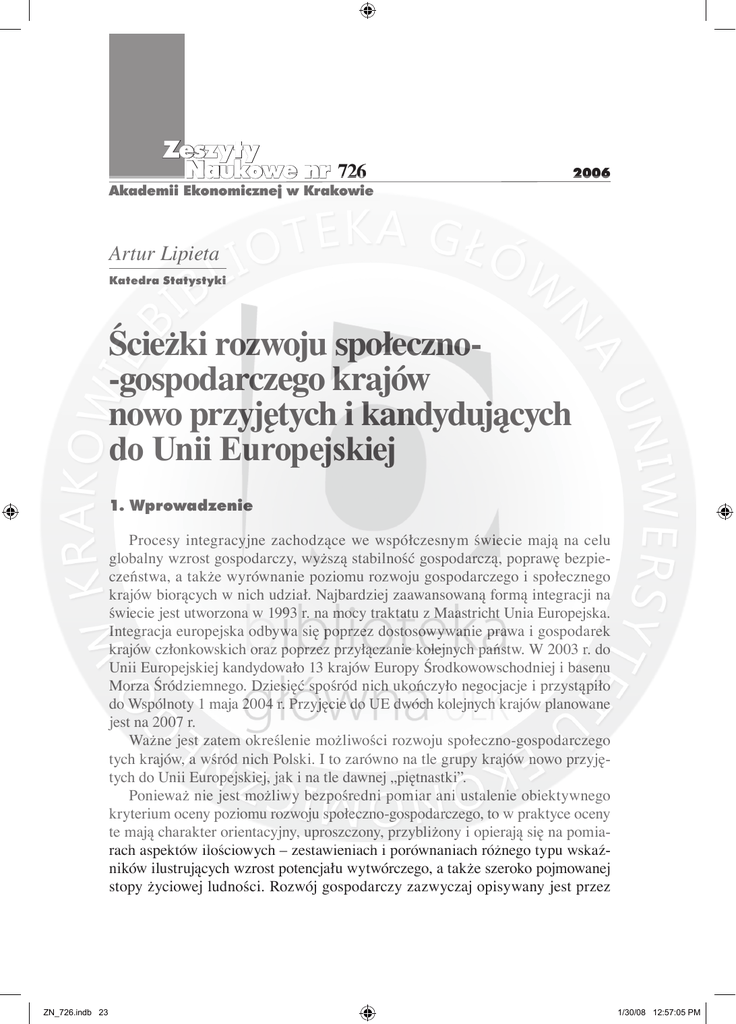 Lipieta A. [2003], Analiza poziomu rozwoju społeczno-ekonomicznego krajów kandydujących do Unii Europejskiej. Ujęcie taksonomiczne, AE w Krakowie, praca doktorska,