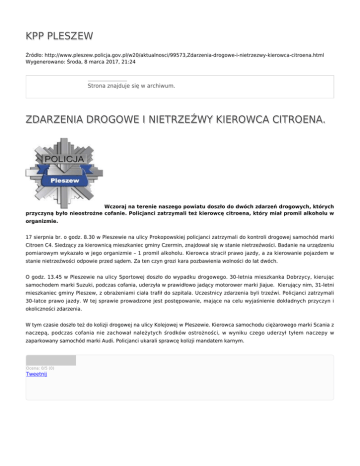 KPP PLESZEW Źródło: http://www.pleszew.policja.gov.pl/w20/aktualnosci/99573,Zdarzenia-drogowe-i-nietrzezwy-kierowca-citroena.html Wygenerowano: Środa, 8 marca 2017, 21:24 Strona znajduje się w archiwum. ZDARZENIA DROGOWE I NIETRZEŹWY KIEROWCA CITROENA. Wczoraj na terenie naszego powiatu doszło do dwóch zdarzeń drogowych, których przyczyną było nieostrożne cofanie. Policjanci zatrzymali też kierowcę citroena, który miał promil alkoholu w organizmie. 17 sierpnia br. o godz. 8.30 w Pleszewie na ulicy Prokopowskiej policjanci zatrzymali do kontroli drogowej samochód marki Citroen C4. Siedzący za kierownicą mieszkaniec gminy Czermin, znajdował się w stanie nietrzeźwości. Badanie na urządzeniu pomiarowym wykazało w jego organizmie – 1 promil alkoholu. Kierowca stracił prawo jazdy, a za kierowanie pojazdem w stanie nietrzeźwości odpowie przed sądem. Za ten czyn grozi kara pozbawienia wolności do lat dwóch. O godz. 13.45 w Pleszewie na ulicy Sportowej doszło do wypadku drogowego. 30-letnia mieszkanka Dobrzycy, kierując samochodem marki Suzuki, podczas cofania, uderzyła w prawidłowo jadący motorower marki Jiajue. Kierujący nim, 31-letni mieszkaniec gminy Pleszew, z obrażeniami ciała trafił do szpitala. Uczestnicy zdarzenia byli trzeźwi. Policjanci zatrzymali 30-latce prawo jazdy. W tej sprawie prowadzone jest postępowanie, mające na celu wyjaśnienie dokładnych przyczyn i okoliczności zdarzenia. W tym czasie doszło też do kolizji drogowej na ulicy Kolejowej w Pleszewie. Kierowca samochodu ciężarowego marki Scania z naczepą, podczas cofania nie zachował należytych środków ostrożności, w wyniku czego uderzył tyłem naczepy w zaparkowany samochód marki Audi. Policjanci ukarali sprawcę kolizji mandatem karnym. Ocena: 0/5 (0) Tweetnij