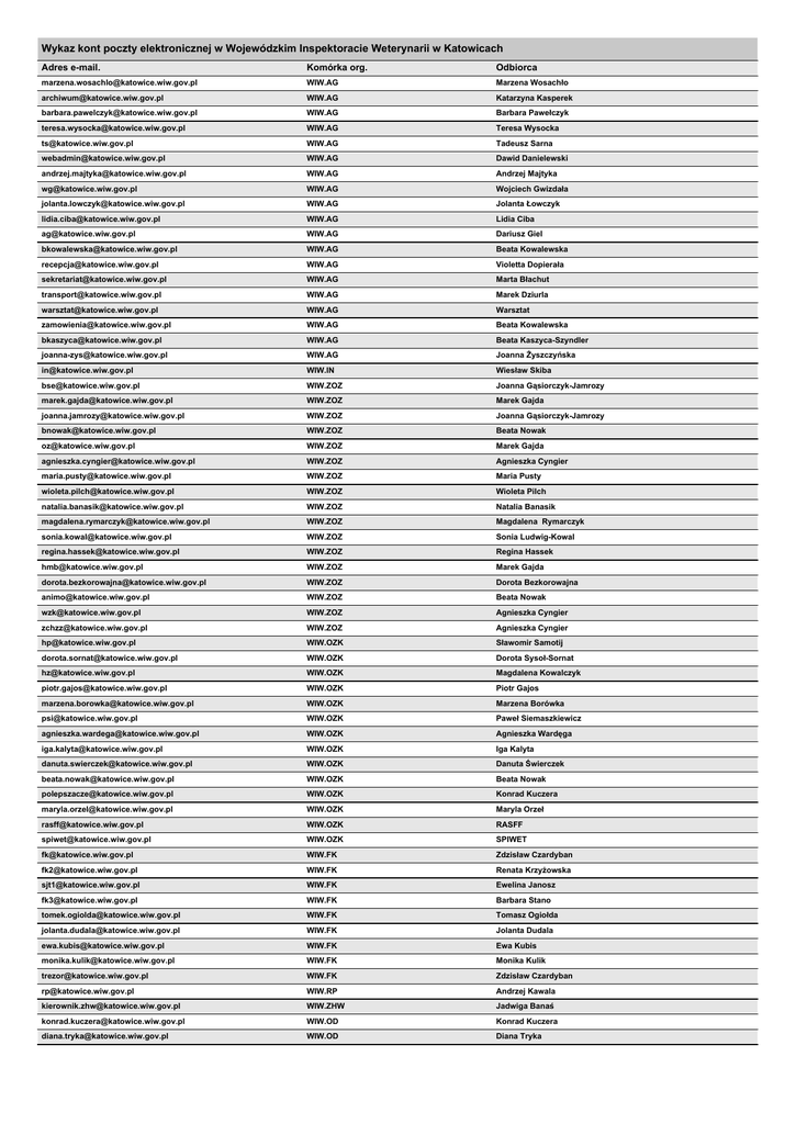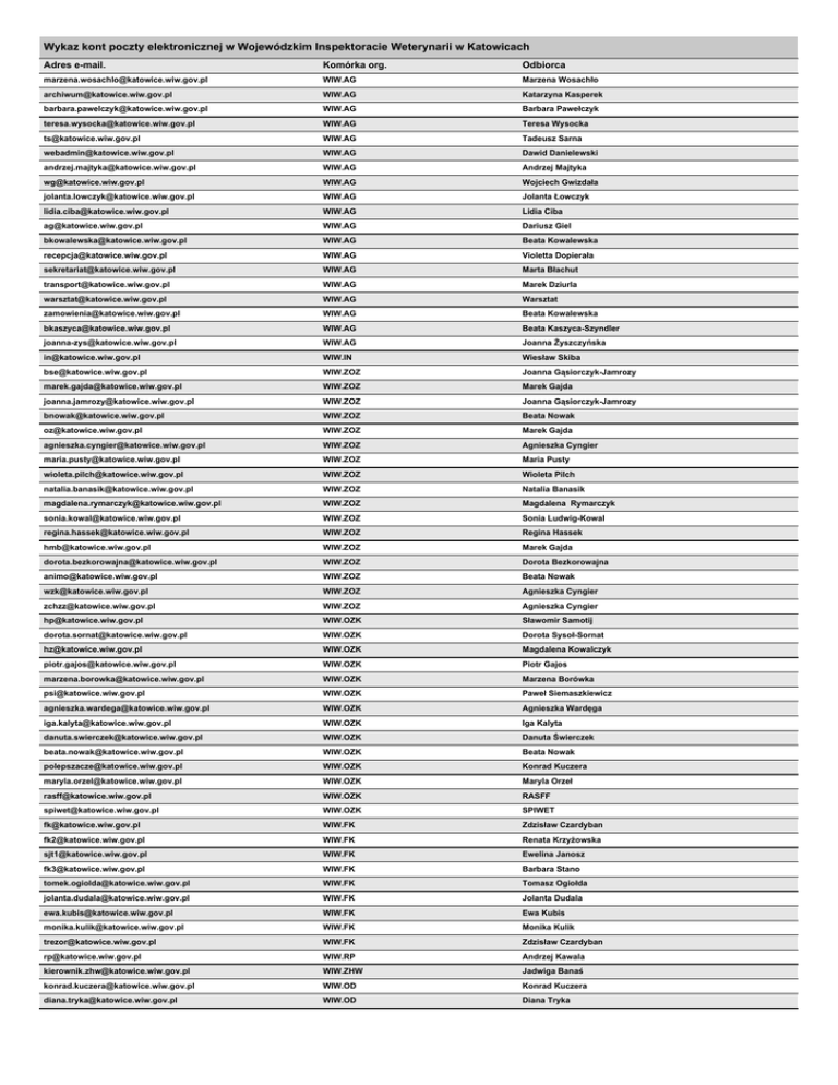 Wykaz kont poczty elektronicznej w Wojewódzkim Inspektoracie Weterynarii w Katowicach Adres e-mail. Komórka org. Odbiorca [email protected] WIW.AG Marzena Wosachło [email protected] WIW.AG Katarzyna Kasperek [email protected] WIW.AG Barbara Pawełczyk [email protected] WIW.AG Teresa Wysocka [email protected] WIW.AG Tadeusz Sarna [email protected] WIW.AG Dawid Danielewski [email protected] WIW.AG Andrzej Majtyka [email protected] WIW.AG Wojciech Gwizdała [email protected] WIW.AG Jolanta Łowczyk [email protected] WIW.AG Lidia Ciba [email protected] WIW.AG Dariusz Giel [email protected] WIW.AG Beata Kowalewska [email protected] WIW.AG Violetta Dopierała [email protected] WIW.AG Marta Błachut [email protected] WIW.AG Marek Dziurla [email protected] WIW.AG Warsztat [email protected] WIW.AG Beata Kowalewska [email protected] WIW.AG Beata Kaszyca-Szyndler [email protected] WIW.AG Joanna Żyszczyńska [email protected] WIW.IN Wiesław Skiba [email protected] WIW.ZOZ Joanna Gąsiorczyk-Jamrozy [email protected] WIW.ZOZ Marek Gajda [email protected] WIW.ZOZ Joanna Gąsiorczyk-Jamrozy [email protected] WIW.ZOZ Beata Nowak [email protected] WIW.ZOZ Marek Gajda [email protected] WIW.ZOZ Agnieszka Cyngier [email protected] WIW.ZOZ Maria Pusty [email protected] WIW.ZOZ Wioleta Pilch [email protected] WIW.ZOZ Natalia Banasik [email protected] WIW.ZOZ Magdalena Rymarczyk [email protected] WIW.ZOZ Sonia Ludwig-Kowal [email protected] WIW.ZOZ Regina Hassek [email protected] WIW.ZOZ Marek Gajda [email protected] WIW.ZOZ Dorota Bezkorowajna [email protected] WIW.ZOZ Beata Nowak [email protected] WIW.ZOZ Agnieszka Cyngier [email protected] WIW.ZOZ Agnieszka Cyngier [email protected] WIW.OZK Sławomir Samotij [email protected] WIW.OZK Dorota Sysoł-Sornat [email protected] WIW.OZK Magdalena Kowalczyk [email protected] WIW.OZK Piotr Gajos [email protected] WIW.OZK Marzena Borówka [email protected] WIW.OZK Paweł Siemaszkiewicz [email protected] WIW.OZK Agnieszka Wardęga [email protected] WIW.OZK Iga Kalyta [email protected] WIW.OZK Danuta Świerczek [email protected] WIW.OZK Beata Nowak [email protected] WIW.OZK Konrad Kuczera [email protected] WIW.OZK Maryla Orzeł [email protected] WIW.OZK RASFF [email protected] WIW.OZK SPIWET [email protected] WIW.FK Zdzisław Czardyban [email protected] WIW.FK Renata Krzyżowska [email protected] WIW.FK Ewelina Janosz [email protected] WIW.FK Barbara Stano [email protected] WIW.FK Tomasz Ogiołda [email protected] WIW.FK Jolanta Dudala [email protected] WIW.FK Ewa Kubis [email protected] WIW.FK Monika Kulik [email protected] WIW.FK Zdzisław Czardyban [email protected] WIW.RP Andrzej Kawala [email protected] WIW.ZHW Jadwiga Banaś [email protected] WIW.OD Konrad Kuczera [email protected] WIW.OD Diana Tryka [email protected] WIW.ZHW.PBC Anida Pelka [email protected] WIW.ZHW.PBC Aleksandra Marniok-Glűck [email protected] WIW.ZHW.PBC Ewa Jaromin [email protected] WIW.ZHW.PBC Halina Żak-Sobotowska [email protected] WIW.ZHW.PBC Monika Karwot [email protected] WIW.ZHW.PBC Małgorzata Podleśka - Nowak [email protected] WIW.ZHW.PBC Beata Cyganik [email protected] WIW.ZHW.MS Anna Zwonik [email protected] WIW.ZHW.PB Dorota Łazarek Tabor [email protected] WIW.ZHW.PB Ewa Nakonieczny [email protected] WIW.ZHW.PB Dorota Jeżewska [email protected] WIW.ZHW.PB Monika Brandwein [email protected] WIW.ZHW.PS Barbara Mucha [email protected] WIW.ZHW.PS Monika Curyło-Sztanderska [email protected] WIW.ZHW.PS Małgorzata Błażejowska [email protected] WIW.ZHW.OM Justyna Tarka [email protected] WIW.ZHW.OM Magazyn [email protected] WIW.ZHW.OM Punkt Obsługi Klienta ZHW Ostatnia aktualizacja: 25.06.2012, godz.11:44