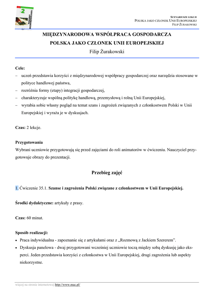 SCENARIUSZE LEKCJI POLSKA JAKO CZŁONEK UNII EUROPEJSKIEJ FILIP ŻURAKOWSKI MIĘDZYNARODOWA WSPÓŁPRACA GOSPODARCZA POLSKA JAKO CZŁONEK UNII EUROPEJSKIEJ Filip Żurakowski Cele: − uczeń przedstawia korzyści z międzynarodowej współpracy gospodarczej oraz narzędzia stosowane w polityce handlowej państwa, − rozróżnia formy (etapy) integracji gospodarczej, − charakteryzuje wspólną politykę handlową, przemysłową i rolną Unii Europejskiej, − wyrabia sobie własny pogląd na temat szans i zagrożeń związanych z członkostwem Polski w Unii Europejskiej i wyraża je w dyskusjach. Czas: 2 lekcje. Przygotowania Wybrani uczniowie przygotowują się przed zajęciami do roli animatorów w ćwiczeniu. Nauczyciel przygotowuje obrazy do prezentacji. Przebieg zajęć 1. Ćwiczenie 35.1. Szanse i zagrożenia Polski związane z członkostwem w Unii Europejskiej. Środki dydaktyczne: artykuły z prasy. Czas: 60 minut. Sposób realizacji: • Praca indywidualna - zapoznanie się z artykułami oraz z „Rozmową z Jackiem Szererem”. • Dyskusja panelowa - dwaj przygotowani wcześniej uczniowie toczą między sobą dyskusję jako eks- perci. Jeden przedstawia korzyści z członkostwa w Unii Europejskiej, drugi zagrożenia lub aspekty niekorzystne. więcej na stronie internetowej http://www.mac.pl/ SCENARIUSZE LEKCJI POLSKA JAKO CZŁONEK UNII EUROPEJSKIEJ FILIP ŻURAKOWSKI • Po pewnym czasie pozostali uczniowie dołączają się do dyskusji. Dyskusją kieruje nauczyciel lub uczniowie - eksperci (animatorzy), którzy inicjowali ją jako członkowie panelu. 2. Ćwiczenie rezerwowe 35.2. Trzy filary Unii Europejskiej a etapy integracji. Środki dydaktyczne: powielony materiał pomocniczy „Trzy filary Unii Europejskiej”. Czas: 15 minut. Sposób realizacji: Praca w parach - analiza rys. 35.2. z podręcznika i materiału pomocniczego „Trzy filary Unii Europejskiej”. Poszukiwanie odpowiedzi na pytanie: Jakim etapom międzynarodowej integracji odpowiada wprowadzanie poszczególnych filarów Unii Europejskiej? Rys. 35.2. Etapy międzynarodowej integracji gospodarczej 3. Ewaluacja. Należy poprosić uczniów o uzupełnienie i skomentowanie poszczególnych elementów poniższego schematu blokowego (rys. 35.1), sprawdzając w ten sposób zapamiętanie i zrozumienie wiadomości. więcej na stronie internetowej http://www.mac.pl/ SCENARIUSZE LEKCJI POLSKA JAKO CZŁONEK UNII EUROPEJSKIEJ FILIP ŻURAKOWSKI Rys. 35.1. Współpraca międzynarodowa. Integracja gospodarcza 4. Sygnał dotyczący następnych zajęć. Chętni (zainteresowani tematem) uczniowie powinni przygotować się do roli animatorów w ćwiczeniu przewidzianym w następnym spotkaniu. więcej na stronie internetowej http://www.mac.pl/ SCENARIUSZE LEKCJI POLSKA JAKO CZŁONEK UNII EUROPEJSKIEJ FILIP ŻURAKOWSKI Trzy filary Unii Europejskiej Źródło: „Unia bez tajemnic. Wczoraj, dziś, jutro”, wydawca: Pełnomocnik Rządu ds. Informacji Europejskiej. Jakie są najważniejsze dziedziny czyli filary Unii? Po dwuletnich negocjacjach w lutym 1992 roku podpisany został w Maastricht traktat o Unii Europejskiej. Unia stała się faktem 1 listopada 1993 r. Traktat z Maastricht łączy w całość trzy dziedziny zwane również filarami Unii Europejskiej. Pierwszy filar obejmuje gospodarkę, handel, politykę społeczną, ochronę środowiska i kulturę, a wiec sprawy, w których udało się osiągnąć wysoki poziom integracji we Wspólnotach Europejskich. Uzyskany postęp w tej dziedzinie pozwolił zbudować Unię Gospodarczą i Walutową, której ostatnim etapem było wprowadzenie do obiegu wspólnej europejskiej waluty - euro (od 1 stycznia 2002 r.). Traktat z Maastricht nakreślił zasady współpracy w dziedzinach delikatnych i trudnych z punktu widzenia interesów państw członkowskich. Dziedziny zaliczane do drugiego filaru, czyli wspólna polityka zagraniczna i bezpieczeństwo oraz do trzeciego filaru - wymiar sprawiedliwości i sprawy wewnętrzne - powinny podlegać integracji w wolniejszym tempie niż sprawy gospodarki (pierwszy filar). więcej na stronie internetowej http://www.mac.pl/