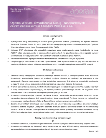 Siemianowice Śląskie, 18.02.2014 Ogólne Warunki Świadczenia Usług Transportowych Aperam Stainless Services & Solutions Poland Sp. z o.o. Zakres obowiązywania §1 1. Wykonywanie usług transportowych towarów przez jakikolwiek podmiot (Kontrahent) dla Aperam Stainless Services & Solutions Poland Sp. z o.o. (dalej ASSSP) następuje wyłącznie na podstawie poniższych Ogólnych Warunkach Świadczenia Usług Transportowych (dalej OWT). 2. Niniejsze OWT obowiązują dla wszystkich przyszłych usług realizowanych przez Kontrahenta na rzecz ASSSP, także wówczas, gdyby w poszczególnych przypadkach nie powołano się na nie w sposób wyraźny (domniemanie obowiązywania OWT we wszystkich umowach zwieranych przez ASSSP). 3. Możliwość stosowania ogólnych warunków Kontrahenta do zamówień ASSSP jest wyłączona. 4. Usługi mogą być realizowane dla ASSSP z pominięciem OWT wyłącznie wówczas, gdy ASSSP wyrazi na to zgodę na piśmie lub mailem. Niniejsze warunki tracą moc z chwilą ich zastąpienia przez ASSSP nowymi. Oferta i zawarcie umowy §2 1. Zawarcie umowy następuje na podstawie pisemnego zlecenia ASSSP, z chwilą otrzymania przez ASSSP od Kontrahenta potwierdzenia (faxem lub mailem) przyjęcia zlecenia do realizacji na warunkach w nim wskazanych. Zlecenie może zostać przyjęte jedynie bez zastrzeżeń. Brak pisemnej odpowiedzi na zlecenie, w ciągu 15 minut od jego otrzymania jest równoznaczny z przyjęciem zlecenia do realizacji. 2. W chwili potwierdzenia zlecenia, Kontrahent zobowiązany jest posiadać ubezpieczenie OC pojazdu oraz OCP z sumą ubezpieczenia odpowiadającą, co najmniej wartości przewożonego ładunku. W przypadku braku ubezpieczenia OCP przewoźnik zobowiązany jest ubezpieczyć ładunek. 3. Kontrahent zobowiązany jest posiadać niezbędne licencje i zezwolenia na wykonywanie transportu, w tym transportu międzynarodowego, jeśli zlecenie dotyczy trasy zagranicznej. Przyjęcie zlecenia do realizacji jest równoznaczne z potwierdzeniem faktu, iż Zleceniobiorca jest uprawnionym przewoźnikiem. 4. Zleceniodawcy ASSSP przysługuje prawo odstąpienia od umowy zawartej na podstawie zlecenia w każdym czasie bez podania przyczyn. Odstąpienie dochodzi do skutku poprzez przesłanie faksem lub mailem anulacji zlecenia. Jeżeli w związku z odstąpieniem od umowy przez ASSSP powstały po stronie Kontrahenta koszty, ASSSP zobowiązuje się do zwrotu jedynie koniecznych i udokumentowanych przez Kontrahenta kosztów. Zasady świadczenia usług transportowych §3 1. Kontrahent oświadcza, iż spełnia wszystkie stawiane prawem wymogi dla świadczenia usług objętych OWT. 2. Kontrahent zobowiązuje się świadczyć usługi transportowe na rzecz ASSSP według najwyższej staranności wymaganej dla podmiotów zawodowo trudniących się świadczeniem tego typu usług. Strona 1 z 5 Siemianowice Śląskie, 18.02.2014 Ogólne Warunki Świadczenia Usług Transportowych Aperam Stainless Services & Solutions Poland Sp. z o.o. 3. Kontrahent zobowiązuje się dostarczyć towar wymieniony w zleceniu w miejsce i w terminie wskazanym w zamówieniu oraz uzyskać pisemne potwierdzenie odbioru dostarczonego towaru na dokumentach przewozowych (pieczątka i podpis). 4. Kontrahent zobowiązuje się ponadto – jeżeli zostało to wskazane w zleceniu – wykonać na rzecz ASSSP usługę załadunku i/lub rozładunku towaru objętego zleceniem oraz wypełnić przewidziane prawem zobowiązania związane z wewnątrzwspólnotową dostawą/eksportem/importem towarów. 5. Kontrahent zobowiązany jest podstawić pojazd odpowiedni do transportu towaru określonego w zleceniu przewozowym. 6. Kontrahent zobowiązany jest zapewnić, żeby kierowca zgłaszający się na załadunek odbył określony przepisami prawa odpoczynek dobowy i/lub tygodniowy oraz dysponował wystarczającą ilością czasu pracy potrzebną do realizacji Zlecenia Przewozowego. 7. Kontrahent zobowiązany jest do uzyskania każdorazowo zgody ASSSP na ewentualną kilkukrotną realizację różnych Zleceń Przewozowych przy pomocy tego samego pojazdu i/lub tego samego kierowcy w tym samym dniu. 8. Kontrahent zobowiązany jest sprawdzić zgodność towaru z dokumentacją, a w szczególności z treścią zlecenia. 9. Kontrahent zobowiązany jest sprawdzić prawidłowość dokonanego przez nadawcę załadunku oraz zabezpieczyć go na czas transportu. Kontrahent zobowiązuje się zabezpieczyć przewożony towar w sposób uniemożliwiający jego przemieszczanie się i uszkodzenie podczas transportu. 10. Kontrahent jest zobowiązany do przestrzegania zasad zawartych w instrukcji I/ZB/19 „Ogólne zasady bezpieczeństwa dla firm transportowych”. 11. Kontrahent zobowiązuje się ponadto zabezpieczyć przewożony towar przed niekorzystnym wpływem warunków atmosferycznych. 12. Obowiązuje całkowity zakaz przeładunków lub doładunków bez uzyskania wcześniejszej pisemnej (fax lub mail) zgody zleceniodawcy. 13. W przypadku jakichkolwiek komplikacji podczas wykonywania przewozu Kontrahent zobowiązany jest skontaktować się ze ASSSP pod numer telefonu wskazany w zleceniu przewozowym. Za działania podjęte bez konsultacji i zgody ASSSP pełną odpowiedzialność ponosi Kontrahent, w tym w szczególności obciążają go wszelkie koszty powstałe w związku z podjętymi działaniami. 14. ASSSP zastrzega pierwsze 48 godzin postoju (72 godziny w krajach Europy Wschodniej), a także postój w soboty, niedziele oraz święta przy załadunku i rozładunku, jako wolne od opłat postojowych. ASSSP nie ponosi odpowiedzialności za postoje na granicach państw, Urzędach Celnych oraz w dni ograniczonego poruszania się samochodów ciężarowych. Strona 2 z 5 Siemianowice Śląskie, 18.02.2014 Ogólne Warunki Świadczenia Usług Transportowych Aperam Stainless Services & Solutions Poland Sp. z o.o. 15. Kontrahent zobowiązany jest zapewnić Zleceniodawcy stały kontakt telefoniczny z kierowcą wykonującym przewóz. 16. Kontrahent zobow