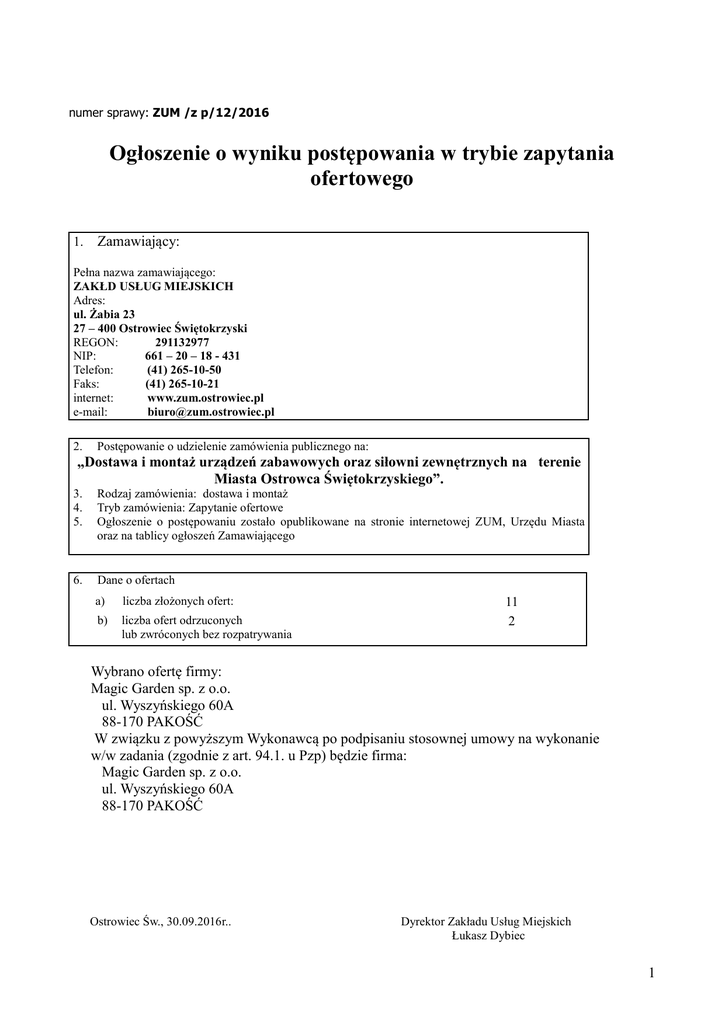 numer sprawy: ZUM /z p/12/2016 Ogłoszenie o wyniku postępowania w trybie zapytania ofertowego 1. Zamawiający: Pełna nazwa zamawiającego: ZAKŁD USŁUG MIEJSKICH Adres: ul. Żabia 23 27 – 400 Ostrowiec Świętokrzyski REGON: 291132977 NIP: 661 – 20 – 18 - 431 Telefon: (41) 265-10-50 Faks: (41) 265-10-21 internet: www.zum.ostrowiec.pl e-mail: [email protected] 2. Postępowanie o udzielenie zamówienia publicznego na: „Dostawa i montaż urządzeń zabawowych oraz siłowni zewnętrznych na terenie Miasta Ostrowca Świętokrzyskiego”. 3. 4. 5. Rodzaj zamówienia: dostawa i montaż Tryb zamówienia: Zapytanie ofertowe Ogłoszenie o postępowaniu zostało opublikowane na stronie internetowej ZUM, Urzędu Miasta oraz na tablicy ogłoszeń Zamawiającego 6. Dane o ofertach a) liczba złożonych ofert: b) liczba ofert odrzuconych lub zwróconych bez rozpatrywania 11 2 Wybrano ofertę firmy: Magic Garden sp. z o.o. ul. Wyszyńskiego 60A 88-170 PAKOŚĆ W związku z powyższym Wykonawcą po podpisaniu stosownej umowy na wykonanie w/w zadania (zgodnie z art. 94.1. u Pzp) będzie firma: Magic Garden sp. z o.o. ul. Wyszyńskiego 60A 88-170 PAKOŚĆ Ostrowiec Św., 30.09.2016r.. Dyrektor Zakładu Usług Miejskich Łukasz Dybiec 1 2