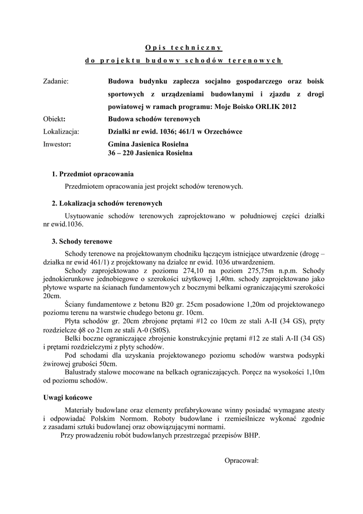 Opis techniczny do projektu budowy schodów terenowych Zadanie: Budowa budynku zaplecza socjalno gospodarczego oraz boisk sportowych z urządzeniami budowlanymi i zjazdu z drogi powiatowej w ramach programu: Moje Boisko ORLIK 2012 Obiekt: Budowa schodów terenowych Lokalizacja: Działki nr ewid. 1036; 461/1 w Orzechówce Inwestor: Gmina Jasienica Rosielna 36 – 220 Jasienica Rosielna 1. Przedmiot opracowania Przedmiotem opracowania jest projekt schodów terenowych. 2. Lokalizacja schodów terenowych Usytuowanie schodów terenowych zaprojektowano w południowej części działki nr ewid.1036. 3. Schody terenowe Schody terenowe na projektowanym chodniku łączącym istniejące utwardzenie (drogę – działka nr ewid 461/1) z projektowany na działce nr ewid. 1036 utwardzeniem. Schody zaprojektowano z poziomu 274,10 na poziom 275,75m n.p.m. Schody jednokierunkowe jednobiegowe o szerokości użytkowej 1,40m. schody zaprojektowano jako płytowe wsparte na ścianach fundamentowych z bocznymi belkami ograniczającymi szerokości 20cm. Ściany fundamentowe z betonu B20 gr. 25cm posadowione 1,20m od projektowanego poziomu terenu na warstwie chudego betonu gr. 10cm. Płyta schodów gr. 20cm zbrojone prętami #12 co 10cm ze stali A-II (34 GS), pręty rozdzielcze φ8 co 21cm ze stali A-0 (St0S). Belki boczne ograniczające zbrojenie konstrukcyjnie prętami #12 ze stali A-II (34 GS) i prętami rozdzielczymi z płyty schodów. Pod schodami dla uzyskania projektowanego poziomu schodów warstwa podsypki żwirowej grubości 50cm. Balustrady stalowe mocowane na belkach ograniczających. Poręcz na wysokości 1,10m od poziomu schodów. Uwagi końcowe Materiały budowlane oraz elementy prefabrykowane winny posiadać wymagane atesty i odpowiadać Polskim Normom. Roboty budowlane i rzemieślnicze wykonać zgodnie z zasadami sztuki budowlanej oraz obowiązującymi normami. Przy prowadzeniu robót budowlanych przestrzegać przepisów BHP. Opracował: