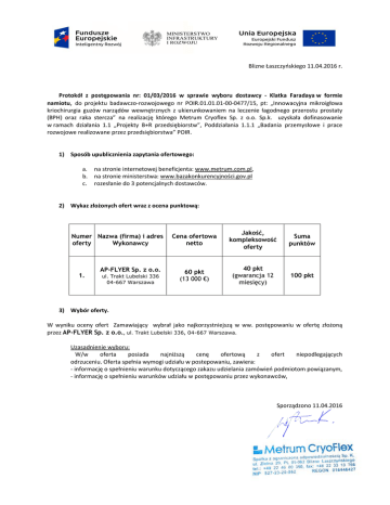 Blizne Łaszczyńskiego 11.04.2016 r. Protokół z postępowania nr: 01/03/2016 w sprawie wyboru dostawcy ‐ Klatka Faradaya w formie namiotu, do projektu badawczo‐rozwojowego nr POIR.01.01.01‐00‐0477/15, pt: „Innowacyjna mikroigłowa kriochirurgia guzów narządów wewnętrznych z ukierunkowaniem na leczenie łagodnego przerostu prostaty (BPH) oraz raka stercza” na realizację którego Metrum Cryoflex Sp. z o.o. Sp.k. uzyskała dofinasowanie w ramach działania 1.1 „Projekty B+R przedsiębiorstw”, Poddziałania 1.1.1 „Badania przemysłowe i prace rozwojowe realizowane przez przedsiębiorstwa” POIR. 1) Sposób upublicznienia zapytania ofertowego: a. na stronie internetowej beneficjenta: www.metrum.com.pl, b. na stronie ministerstwa: www.bazakonkurencyjności.gov.pl c. rozesłanie do 3 potencjalnych dostawców. 2) Wykaz złożonych ofert wraz z ocena punktową: Numer Nazwa (firma) i adres oferty Wykonawcy 1. AP-FLYER Sp. z o.o. ul. Trakt Lubelski 336 04-667 Warszawa Cena ofertowa netto Jakość, kompleksowość oferty Suma punktów 60 pkt (13 000 €) 40 pkt (gwarancja 12 miesięcy) 100 pkt 3) Wybór oferty. W wyniku oceny ofert Zamawiający wybrał jako najkorzystniejszą w ww. postępowaniu w ofertę złożoną przez AP-FLYER Sp. z o.o., ul. Trakt Lubelski 336, 04-667 Warszawa. Uzasadnienie wyboru: W/w oferta posiada najniższą cenę ofertową z ofert niepodlegających odrzuceniu. Oferta spełnia wymogi udziału w postepowaniu, zawiera: ‐ informację o spełnieniu warunku dotyczącego zakazu udzielania zamówień podmiotom powiązanym, ‐ informację o spełnieniu warunków udziału w postępowaniu przez wykonawców, Sporządzono 11.04.2016
