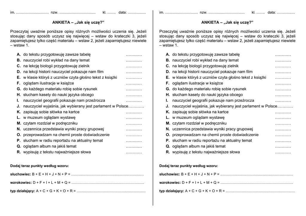 im. ……………………… nzw. ………………………… kl. ……. data: …………… im. ……………………… nzw. ………………………… kl. ……. data: …………… ANKIETA – „Jak się uczę?” ANKIETA – „Jak się uczę?” Przeczytaj uważnie poniższe opisy różnych możliwości uczenia się. Jeżeli stosując dany sposób uczysz się najwięcej – wstaw do krateczki 3, jeżeli zapamiętujesz tylko część materiału – wstaw 2, jeżeli zapamiętujesz niewiele – wstaw 1. Przeczytaj uważnie poniższe opisy różnych możliwości uczenia się. Jeżeli stosując dany sposób uczysz się najwięcej – wstaw do krateczki 3, jeżeli zapamiętujesz tylko część materiału – wstaw 2, jeżeli zapamiętujesz niewiele – wstaw 1. A. B. C. D. E. F. G. H. I. J. K. L. M. N. O. P. Q. R. do tekstu przygotowuję zawsze tabelę ………… nauczyciel robi wykład na dany temat ………… na lekcję biologii przygotowuję zielnik ………… na lekcji historii nauczyciel pokazuje nam film ………… w klasie któryś z uczniów czyta głośno tekst z książki ………… oglądam ilustracje w książce ………… do każdego materiału robię sobie rysunek ………… słucham kasety do nauki języka obcego ………… nauczyciel geografii pokazuje nam przeźrocza ………… nauczyciel wyjaśnia, jak wybierany jest parlament w Polsce………… zapisuję sobie słówka na kartce ………… w muzeum oglądam wystawę ………… czytam rozdział w podręczniku ………… uczennica przedstawia wyniki pracy grupowej ………… przeprowadzam na chemii proste doświadczenie ………… słucham w radiu reportażu na aktualny temat ………… oglądam album na jakiś temat ………… wypisuję z tekstu najważniejsze słowa ………… A. B. C. D. E. F. G. H. I. J. K. L. M. N. O. P. Q. R. do tekstu przygotowuję zawsze tabelę ………… nauczyciel robi wykład na dany temat ………… na lekcję biologii przygotowuję zielnik ………… na lekcji historii nauczyciel pokazuje nam film ………… w klasie któryś z uczniów czyta głośno tekst z książki ………… oglądam ilustracje w książce ………… do każdego materiału robię sobie rysunek ………… słucham kasety do nauki języka obcego ………… nauczyciel geografii pokazuje nam przeźrocza ………… nauczyciel wyjaśnia, jak wybierany jest parlament w Polsce………… zapisuję sobie słówka na kartce ………… w muzeum oglądam wystawę ………… czytam rozdział w podręczniku ………… uczennica przedstawia wyniki pracy grupowej ………… przeprowadzam na chemii proste doświadczenie ………… słucham w radiu reportażu na aktualny temat ………… oglądam album na jakiś temat ………… wypisuję z tekstu najważniejsze słowa ………… Dodaj teraz punkty według wzoru: Dodaj teraz punkty według wzoru: słuchowiec: B + E + H + J + N + P = …………………………………………………… słuchowiec: B + E + H + J + N + P = …………………………………………………… wzrokowiec: D + F + I + L + M + Q = …………………………………………………… wzrokowiec: D + F + I + L + M + Q = …………………………………………………… typ działający: A + C + G + K + O + R = ………………………………………………… typ działający: A + C + G + K + O + R = …………………………………………………