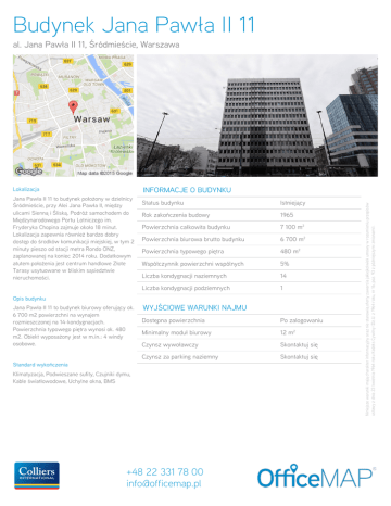 Budynek Jana Pawła II 11 al. Jana Pawła II 11, Śródmieście, Warszawa Lokalizacja Status budynku Istniejący Rok zakończenia budowy 1965 Powierzchnia całkowita budynku 7 100 m2 Powierzchnia biurowa brutto budynku 6 700 m2 Powierzchnia typowego piętra 480 m2 Współczynnik powierzchni wspólnych 5% Liczba kondygnacji naziemnych 14 Liczba kondygnacji podziemnych 1 Opis budynku Jana Pawła II 11 to budynek biurowy oferujący ok. 6 700 m2 powierzchni na wynajem rozmieszczonej na 14-kondygnacjach. Powierzchnia typowego piętra wynosi ok. 480 m2. Obiekt wyposażony jest w m.in.: 4 windy osobowe. WYJŚCIOWE WARUNKI NAJMU Dostępna powierzchnia Po zalogowaniu Minimalny moduł biurowy 12 m2 Czynsz wywoławczy Skontaktuj się Czynsz za parking naziemny Skontaktuj się Standard wykończenia Klimatyzacja, Podwieszane sufity, Czujniki dymu, Kable światłowodowe, Uchylne okna, BMS +48 22 331 78 00 [email protected] Niniejsze warunki mają charakter informacyjny oraz nie stanowią oferty zawarcia jakiejkolwiek umowy w rozumieniu przepisów ustawy z dnia 23 kwietnia 1964 roku Kodeks Cywilny (Dz.U. z 1964 roku, nr 16, poz. 93 z późniejszymi zmianami). INFORMACJE O BUDYNKU Jana Pawła II 11 to budynek położony w dzielnicy Śródmieście, przy Alei Jana Pawła II, między ulicami Sienną i Śliską. Podróż samochodem do Międzynarodowego Portu Lotniczego im. Fryderyka Chopina zajmuje około 18 minut. Lokalizacja zapewnia również bardzo dobry dostęp do środków komunikacji miejskiej, w tym 2 minuty pieszo od stacji metra Rondo ONZ, zaplanowanej na koniec 2014 roku. Dodatkowym atutem położenia jest centrum handlowe Złote Tarasy usytuowane w bliskim sąsiedztwie nieruchomości.