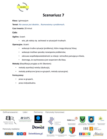Scenariusz 7 Klasa: I gimnazjum Temat: Nie zawsze jest idealnie... Rozmawiamy o problemach. Czas trwania: 20 minut Cele: Ogólne. Uczeń: • wie, jak należy się zachować w sytuacjach trudnych. Operacyjne. Uczeń: • wskazuje trudne sytuacje (problemy), które mogą dotyczyć klasy; • wskazuje możliwe sposoby rozwiązania problemów; • odczuwa współodpowiedzialność za relacje i atmosferę panującą w klasie, • dostrzega, że wychowawca jest wsparciem dla klasy. Metody (klasyfikacja przyjęta za W. Okoniem): • metody asymilacji wiedzy (dyskusja), • metody praktyczne (praca w grupach, metody sytuacyjne). Formy pracy: • praca w grupach, • praca indywidualna. Przebieg zajęć I Ogniwo wstępne 1. Nauczyciel dzieli klasę na grupy dwuosobowe i prosi uczniów, aby odpowiedzieli na pytanie: Co może pójść nie tak w klasie? Uczniowie wypisują na kartce możliwe (potencjalne) problemy. Następnie siadają w grupach czteroosobowych, porównują swoje odpowiedzi i próbują znaleźć rozwiązanie dla każdego z wypisanych problemów. II Ogniwo centralne 2. Przedstawiciel grupy omawia problemy i rozwiązania na forum klasy. Następnie uczniowie z pomocą nauczyciela podejmują wspólnie decyzję, które z proponowanych rozwiązań można zastosować w klasie. Nauczyciel powinien na tym etapie ćwiczenia zwrócić uwagę na fakt, że wszyscy uczniowie są odpowiedzialni za dobrą atmosferę w klasie i mają wpływ na to, jak czują się w swoim towarzystwie. 3. Wychowawca proponuje, aby wspólnie wypracować procedurę dotycząca tego, jak uczniowie będą informować go o swoich problemach lub trudnościach, które zauważają w klasie. III Ogniwo końcowe 4. Wychowawca w podsumowaniu powinien zapewnić uczniów, iż jest dla nich wsparciem i zawsze służy pomocą. Może także podkreślić, iż problemy najlepiej rozwiązywać razem z wychowawcą lub na forum klasy. Zadanie domowe: „Do przemyślenia”: Co byś zrobił/zrobiła, gdybyś był/ była świadkiem sytuacji, w której jeden z uczniów klasy szantażuje i zastrasza drugiego np. wymusza pieniądze?
