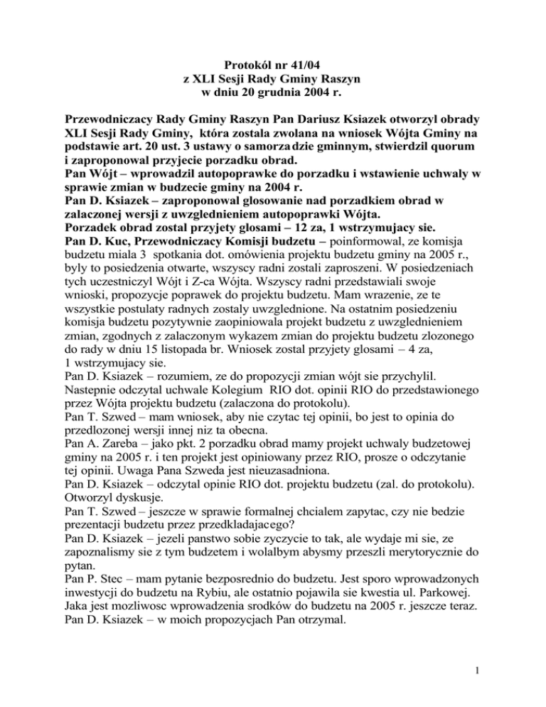 Protokól nr 41/04 z XLI Sesji Rady Gminy Raszyn w dniu 20 grudnia