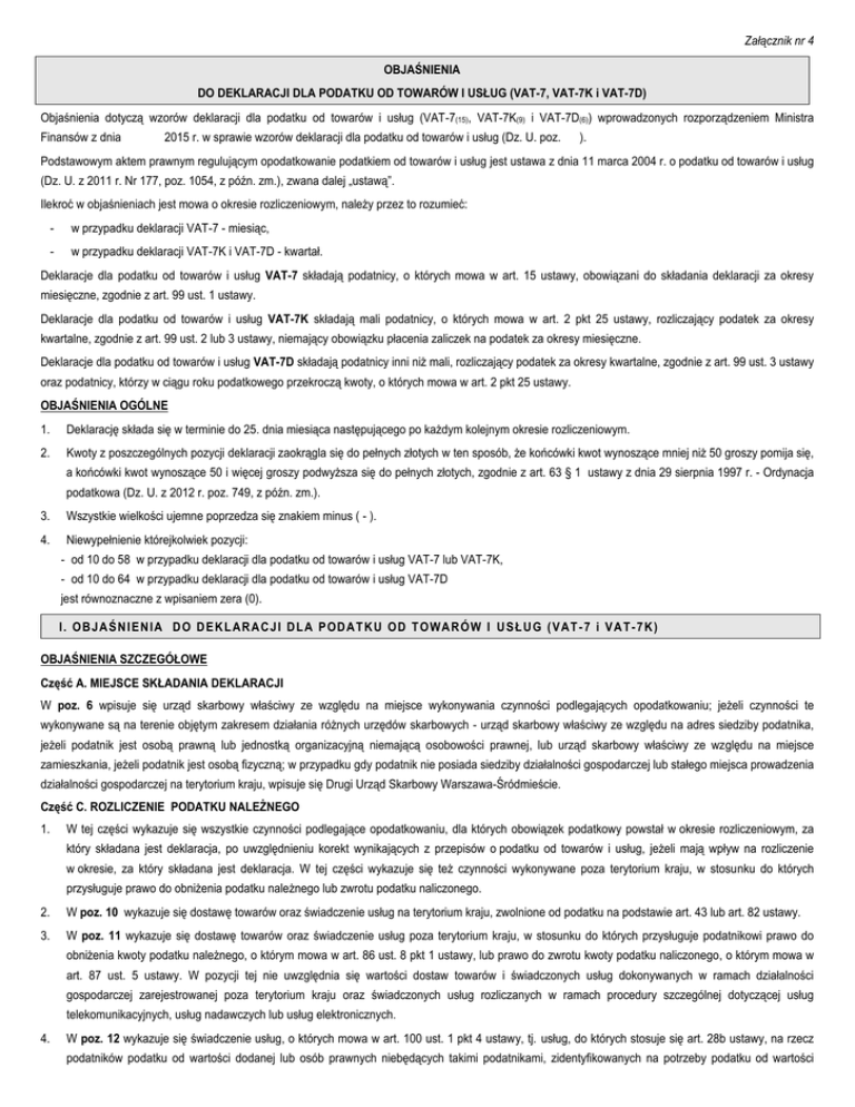 Załącznik nr 4 OBJAŚNIENIA DO DEKLARACJI DLA PODATKU OD TOWARÓW I USŁUG (VAT-7, VAT-7K i VAT-7D) Objaśnienia dotyczą wzorów deklaracji dla podatku od towarów i usług (VAT-7(15), VAT-7K(9) i VAT-7D(6)) wprowadzonych rozporządzeniem Ministra Finansów z dnia 2015 r. w sprawie wzorów deklaracji dla podatku od towarów i usług (Dz. U. poz. ). Podstawowym aktem prawnym regulującym opodatkowanie podatkiem od towarów i usług jest ustawa z dnia 11 marca 2004 r. o podatku od towarów i usług (Dz. U. z 2011 r. Nr 177, poz. 1054, z późn. zm.), zwana dalej „ustawą”. Ilekroć w objaśnieniach jest mowa o okresie rozliczeniowym, należy przez to rozumieć: - w przypadku deklaracji VAT-7 - miesiąc, - w przypadku deklaracji VAT-7K i VAT-7D - kwartał. Deklaracje dla podatku od towarów i usług VAT-7 składają podatnicy, o których mowa w art. 15 ustawy, obowiązani do składania deklaracji za okresy miesięczne, zgodnie z art. 99 ust. 1 ustawy. Deklaracje dla podatku od towarów i usług VAT-7K składają mali podatnicy, o których mowa w art. 2 pkt 25 ustawy, rozliczający podatek za okresy kwartalne, zgodnie z art. 99 ust. 2 lub 3 ustawy, niemający obowiązku płacenia zaliczek na podatek za okresy miesięczne. Deklaracje dla podatku od towarów i usług VAT-7D składają podatnicy inni niż mali, rozliczający podatek za okresy kwartalne, zgodnie z art. 99 ust. 3 ustawy oraz podatnicy, którzy w ciągu roku podatkowego przekroczą kwoty, o których mowa w art. 2 pkt 25 ustawy. OBJAŚNIENIA OGÓLNE 1. Deklarację składa się w terminie do 25. dnia miesiąca następującego po każdym kolejnym okresie rozliczeniowym. 2. Kwoty z poszczególnych pozycji deklaracji zaokrągla się do pełnych złotych w ten sposób, że końcówki kwot wynoszące mniej niż 50 groszy pomija się, a końcówki kwot wynoszące 50 i więcej groszy podwyższa się do pełnych złotych, zgodnie z art. 63 § 1 ustawy z dnia 29 sierpnia 1997 r. - Ordynacja podatkowa (Dz. U. z 2012 r. poz. 749, z późn. zm.). 3. Wszystkie wielkości ujemne poprzedza się znakiem minus ( - ). 4. Niewypełnienie którejkolwiek pozycji: - od 10 do 58 w przypadku deklaracji dla podatku od towarów i usług VAT-7 lub VAT-7K, - od 10 do 64 w przypadku deklaracji dla podatku od towarów i usług VAT-7D jest równoznaczne z wpisaniem zera (0). I . OB JA ŚN IEN IA D O D EK L A R A C J I D L A POD A T K U OD T OWA R ÓW I U SŁ U G ( VA T - 7 i VA T - 7K ) OBJAŚNIENIA SZCZEGÓŁOWE Część A. MIEJSCE SKŁADANIA DEKLARACJI W poz. 6 wpisuje się urząd skarbowy właściwy ze względu na miejsce wykonywania czynności podlegających opodatkowaniu; jeżeli czynności te wykonywane są na terenie objętym zakresem działania różnych urzędów skarbowych - urząd skarbowy właściwy ze względu na adres siedziby podatnika, jeżeli podatnik jest osobą prawną lub jednostką organizacyjną niemającą osobowości prawnej, lub urząd skarbowy właściwy ze względu na miejsce zamieszkania, jeżeli podatnik jest osobą fizyczną; w przypadku gdy podatnik nie posiada siedziby działalności gospodarczej lub stałego miejsca prowadzenia działalności gospodarczej na terytorium kraju, wpisuje się Drugi Urząd Skarbowy Warszawa-Śródmieście. Część C. ROZLICZENIE PODATKU NALEŻNEGO 1. W tej części wykazuje się wszystkie czynności podlegające opodatkowaniu, dla których obowiązek podatkowy powstał w okresie rozliczeniowym, za który składana jest deklaracja, po uwzględnieniu korekt wynikających z przepisów o podatku od towarów i usług, jeżeli mają wpływ na rozliczenie w okresie, za który składana jest deklaracja. W tej części wykazuje się też czynności wykonywane poza terytorium kraju, w stosunku do których przysługuje prawo do obniżenia podatku należnego lub zwrotu podatku naliczonego. 2. W poz. 10 wykazuje się dostawę towarów oraz świadczenie usług na terytorium kraju, zwolnione od podatku na podstawie art. 43 lub art. 82 ustawy. 3. W poz. 11 wykazuje się dostawę towarów oraz świadczenie usług poza terytorium kraju, w stosunku do których przysługuje podatnikowi prawo do obniżenia kwoty podatku należnego, o którym mowa w art. 86 ust. 8 pkt 1 ustawy, lub prawo do zwrotu kwoty podatku naliczonego, o którym mowa w art. 87 ust. 5 ustawy. W pozycji tej nie uwzględnia się wartości dostaw towarów i świadczonych usług dokonywanych w ramach działalności gospodarczej zarejestrowanej poza terytorium kraju oraz świadczonych usług rozliczanych w ramach procedury szczególnej dotyczącej usług telekomunikacyjnych, usług nadawczych lub usług elektronicznych. 4. W poz. 12 wykazuje się świadczenie usług, o których mowa w art. 100 ust. 1 pkt 4 ustawy, tj. usług, do których stosuje się art. 28b ustawy, na rzecz podatników podatku od wartości dodanej lub osób prawnych niebędących takimi podatnikami, zidentyfikowanych na potrzeby podatku od wartości 2 dodanej, świadczonych na terytorium państwa członkowskiego innym niż terytorium kraju, innych niż zwolnionych od podatku od wartości dodanej lub opodatkowanych stawką 0%, dla których zobowiązanym do zapłaty podatku od wartości dodanej jest usługobiorca. 5. W wierszu 4 „Dostawa towarów oraz świadczenie usług na terytorium kraju, opodatkowane stawką 3% albo 5%” w poz. 15 wykazuje się podstawę opodatkowania transakcji opodatkowanych stawką, o której mowa w art. 41 ust. 2a ustawy (od dnia 1 stycznia 2011 r. jest to stawka w wysokości 5%), a w poz. 16 wykazuje się podatek należny od tych transakcji. W wierszu tym wykazuje się również transakcje opodatkowane wg stawki 3% (podstawa opodatkowania i podatek należny), jeżeli w okresie rozliczeniowym, za który składana jest deklaracja, wystąpił taki przypadek, a także uwzględniane są korekty takich transakcji, jeżeli mają wpływ na rozliczenie podatku należnego w okresie, za który składana jest deklaracja. 6. W wierszu 5 „Dostawa towarów oraz świad