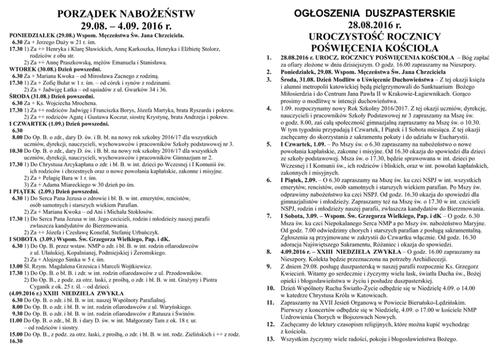 PORZĄDEK NABOŻEŃSTW 29.08. – 4.09. 2016 r.