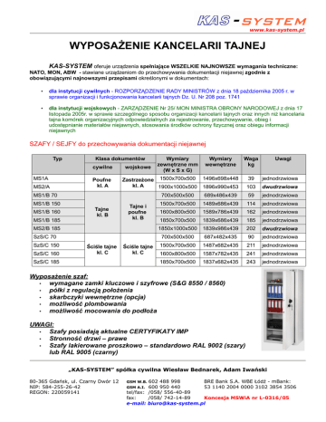 www.kas-system.pl WYPOSAŻENIE KANCELARII TAJNEJ KAS-SYSTEM oferuje urządzenia spełniające WSZELKIE NAJNOWSZE wymagania techniczne: NATO, MON, ABW - stawiane urządzeniom do przechowywania dokumentacji niejawnej zgodnie z obowiązującymi najnowszymi przepisami określonymi w dokumentach: • dla instytucji cywilnych - ROZPORZĄDZENIE RADY MINISTRÓW z dnia 18 października 2005 r. w sprawie organizacji i funkcjonowania kancelarii tajnych Dz. U. Nr 208 poz. 1741 • dla instytucji wojskowych - ZARZĄDZENIE Nr 25/ MON MINISTRA OBRONY NARODOWEJ z dnia 17 listopada 2005r. w sprawie szczególnego sposobu organizacji kancelarii tajnych oraz innych niż kancelaria tajna komórek organizacyjnych odpowiedzialnych za rejestrowanie, przechowywanie, obieg i udostępnianie materiałów niejawnych, stosowania środków ochrony fizycznej oraz obiegu informacji niejawnych SZAFY / SEJFY do przechowywania dokumentacji niejawnej Typ Klasa dokumentów cywilne MS1A MS2/A Poufne kl. A wojskowe MS1/B 160 MS1/B 185 Tajne kl. B Tajne i poufne kl. B MS2/B 185 SzS/C 70 SzS/C 150 SzS/C 160 Ściśle tajne kl. C Wymiary wewnętrzne Waga kg 1496x698x448 39 jednodrzwiowa 1896x990x453 103 dwudrzwiowa 700x500x500 689x486x439 59 jednodrzwiowa 1500x700x500 1489x686x439 114 jednodrzwiowa 1600x800x500 1589x786x439 162 jednodrzwiowa 1850x700x500 1839x686x439 185 jednodrzwiowa 1850x1000x500 1839x986x439 202 dwudrzwiowa 700x500x500 687x482x435 90 jednodrzwiowa 1500x700x500 1487x682x435 211 jednodrzwiowa 1600x800x500 1587x782x435 241 jednodrzwiowa 1850x700x500 1837x682x435 243 jednodrzwiowa Zastrzeżone 1500x700x500 kl. A 1900x1000x500 MS1/B 70 MS1/B 150 Wymiary zewnętrzne mm (W x S x G) Ściśle tajne kl. C SzS/C 185 Uwagi Wyposażenie szaf: • wymagane zamki kluczowe i szyfrowe (S&G 8550 / 8560) • półki z regulacją położenia • skarbczyki wewnętrzne (opcja) • możliwość plombowania • możliwość mocowania do podłoża UWAGI: • Szafy posiadają aktualne CERTYFIKATY IMP • Stronność drzwi – prawe • Szafy lakierowane proszkowo – standardowo RAL 9002 (szary) lub RAL 9005 (czarny) „KAS-SYSTEM” spółka cywilna Wiesław Bednarek, Adam Iwański 80-365 Gdańsk, ul. Czarny Dwór 12 NIP: 584-255-26-42 REGON: 220059141 602 488 998 BRE Bank S.A. WBE Łódź - mBank: 600 950 440 53 1140 2004 0000 3102 3854 3506 tel/fax: /058/ 556-40-89 fax: /058/ 742-14-89 Koncesja MSWiA nr L-0316/05 e-mail: [email protected] GSM W.B. GSM A.I.