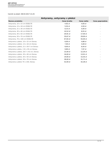 ART OFFICE http://www.dlabiurazakupy.pl [email protected] Cennik na dzień: 08-03-2017 21:25 Antyramy, antyramy z pleksi Nazwa produktu Cena brutto Cena netto Cena poprzednia Antyrama, 10 x 15 cm ESSELTE 4,92 zł 4,00 zł - Antyrama, 13 x 18 cm ESSELTE 5,54 zł 4,50 zł - Antyrama, 21 x 30 cm ESSELTE 6,15 zł 5,00 zł - Antyrama, 30 x 40 cm ESSELTE 10,52 zł 8,55 zł - Antyrama, 40 x 50 cm ESSELTE 20,91 zł 17,00 zł - Antyrama, 50 x 70 cm ESSELTE 35,67 zł 29,00 zł - Antyrama, 70 x 100 cm ESSELTE 67,65 zł 55,00 zł - Antyrama z pleksi, 10 x 15 cm Donau 6,00 zł 4,88 zł - Antyrama z pleksi, 13 x 18 cm Donau 7,00 zł 5,69 zł - Antyrama z pleksi, 21 x 29.7 cm Donau 8,00 zł 6,50 zł - Antyrama z pleks, i 24 x 30 cm Donau 9,80 zł 7,97 zł - Antyrama z pleksi, 29,7 x 42 cm, Donau 15,00 zł 12,20 zł - Antyrama z pleksi, 30 x 40 cm Donau 16,00 zł 13,01 zł - Antyrama z pleksi, 40 x 50 cm Donau 19,00 zł 15,45 zł - Antyrama z pleksi, 50 x 70 cm Donau 39,00 zł 31,71 zł - Antyrama z pleksi 70 x 100, Donau 52,00 zł 42,28 zł - 1/1 Powered by TCPDF (www.tcpdf.org)