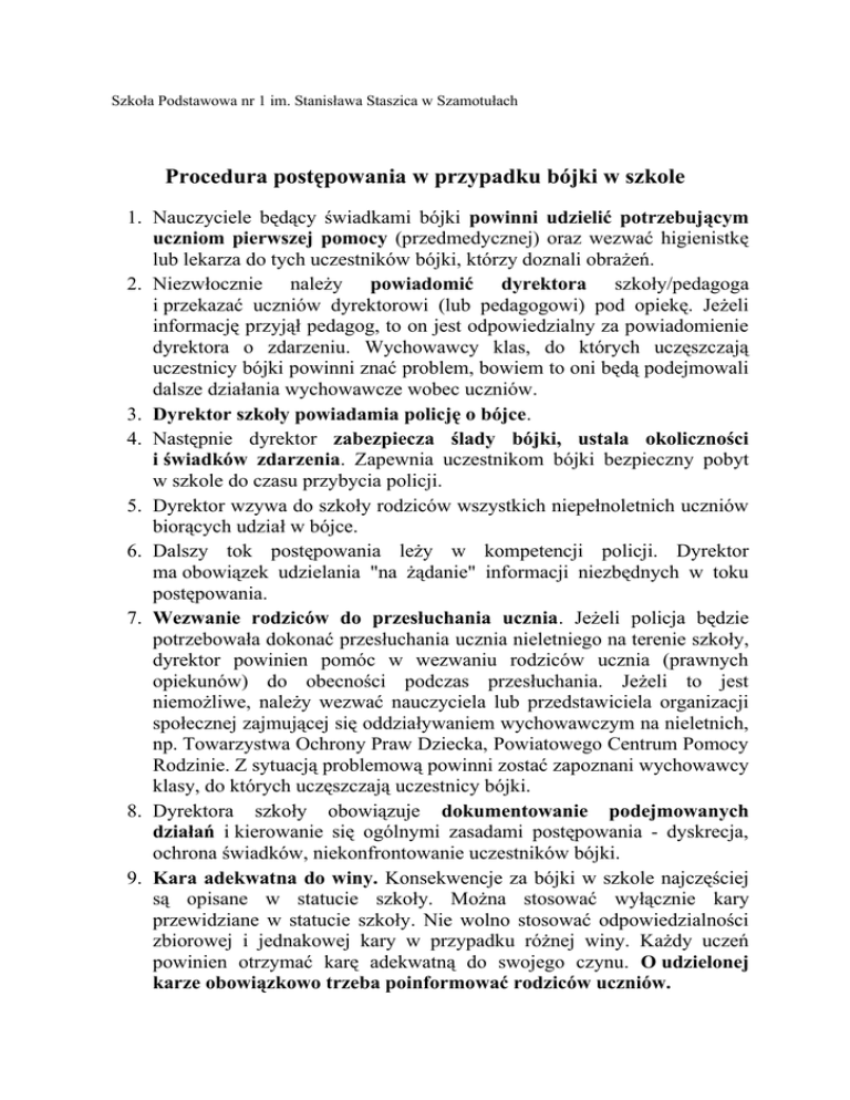 Szkoła Podstawowa nr 1 im. Stanisława Staszica w Szamotułach Procedura postępowania w przypadku bójki w szkole 1. Nauczyciele będący świadkami bójki powinni udzielić potrzebującym uczniom pierwszej pomocy (przedmedycznej) oraz wezwać higienistkę lub lekarza do tych uczestników bójki, którzy doznali obrażeń. 2. Niezwłocznie należy powiadomić dyrektora szkoły/pedagoga i przekazać uczniów dyrektorowi (lub pedagogowi) pod opiekę. Jeżeli informację przyjął pedagog, to on jest odpowiedzialny za powiadomienie dyrektora o zdarzeniu. Wychowawcy klas, do których uczęszczają uczestnicy bójki powinni znać problem, bowiem to oni będą podejmowali dalsze działania wychowawcze wobec uczniów. 3. Dyrektor szkoły powiadamia policję o bójce. 4. Następnie dyrektor zabezpiecza ślady bójki, ustala okoliczności i świadków zdarzenia. Zapewnia uczestnikom bójki bezpieczny pobyt w szkole do czasu przybycia policji. 5. Dyrektor wzywa do szkoły rodziców wszystkich niepełnoletnich uczniów biorących udział w bójce. 6. Dalszy tok postępowania leży w kompetencji policji. Dyrektor ma obowiązek udzielania "na żądanie" informacji niezbędnych w toku postępowania. 7. Wezwanie rodziców do przesłuchania ucznia. Jeżeli policja będzie potrzebowała dokonać przesłuchania ucznia nieletniego na terenie szkoły, dyrektor powinien pomóc w wezwaniu rodziców ucznia (prawnych opiekunów) do obecności podczas przesłuchania. Jeżeli to jest niemożliwe, należy wezwać nauczyciela lub przedstawiciela organizacji społecznej zajmującej się oddziaływaniem wychowawczym na nieletnich, np. Towarzystwa Ochrony Praw Dziecka, Powiatowego Centrum Pomocy Rodzinie. Z sytuacją problemową powinni zostać zapoznani wychowawcy klasy, do których uczęszczają uczestnicy bójki. 8. Dyrektora szkoły obowiązuje dokumentowanie podejmowanych działań i kierowanie się ogólnymi zasadami postępowania - dyskrecja, ochrona świadków, niekonfrontowanie uczestników bójki. 9. Kara adekwatna do winy. Konsekwencje za bójki w szkole najczęściej są opisane w statucie szkoły. Można stosować wyłącznie kary przewidziane w statucie szkoły. Nie wolno stosować odpowiedzialności zbiorowej i jednakowej kary w przypadku różnej winy. Każdy uczeń powinien otrzymać karę adekwatną do swojego czynu. O udzielonej karze obowiązkowo trzeba poinformować rodziców uczniów.
