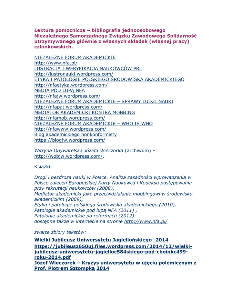 Lektura pomocnicza – bibliografia jednoosobowego Niezależnego Samorządnego Związku Zawodowego Solidarność utrzymywanego głównie z własnych składek (własnej pracy) członkowskich. NIEZALEŻNE FORUM AKADEMICKIE http://www.nfa.pl/ LUSTRACJA I WERYFIKACJA NAUKOWCÓW PRL http://lustronauki.wordpress.com/ ETYKA I PATOLOGIE POLSKIEGO ŚRODOWISKA AKADEMICKIEGO http://nfaetyka.wordpress.com/ MEDIA POD LUPĄ NFA http://nfajw.wordpress.com/ NIEZALEŻNE FORUM AKADEMICKIE – SPRAWY LUDZI NAUKI http://nfapat.wordpress.com/ MEDIATOR AKADEMICKI KONTRA MOBBING http://nfamob.wordpress.com/ NIEZALEŻNE FORUM AKADEMICKIE – WHO IS WHO http://nfawww.wordpress.com/ Blog akademickiego nonkonformisty https://blogjw.wordpress.com/ Witryna Obywatelska Józefa Wieczorka (archiwum) – http://wobjw.wordpress.com/. Książki: Drogi i bezdroża nauki w Polsce. Analiza zasadności wprowadzenia w Polsce zaleceń Europejskiej Karty Naukowca i Kodeksu postępowania przy rekrutacji naukowców (2008), Mediator akademicki jako przeciwdziałanie mobbingowi w środowisku akademickim (2009), Etyka i patologie polskiego środowiska akademickiego (2010), Patologie akademickie pod lupą NFA (2011) , Patologie akademickie po reformach (2012) dostępne także w internecie na stronie http://www.nfa.pl/ zwarte zbiory tekstów: Wielki Jubileusz Uniwersytetu Jagiellońskiego -2014 https://jubileusz650uj.files.wordpress.com/2014/12/wielkijubileusz-uniwersytetu-jagielloc584skiego-pod-choinkc499roku-2014.pdf Józef Wieczorek – Kryzys uniwersytetu w ujęciu polemicznym z Prof. Piotrem Sztompką 2014 https://jubileusz650uj.files.wordpress.com/2014/11/jc3b3zef -wieczorek-kryzys-uniwersytetu-w-ujc499ciu-polemicznym-zprof-piotrem-sztompkc485.pdf Moje boje – Blogosłowie dysydenta akademickiego Tom 1 https://blogjw.wordpress.com/2015/05/05/moje-boje-blogoslowiedysydenta-akademickiego-tom-1/ Moje boje – Blogosłowie dysydenta akademickiego Tom 2 https://blogjw.wordpress.com/2015/05/26/moje-boje-blogoslowiedysydenta-akademickiego-tom-2/ Moje boje – Blogosłowie dysydenta akademickiego Tom 3 https://blogjw.wordpress.com/2015/06/08/moje-boje-blogoslowiedysydenta-akademickiego-tom-3/ Moje boje – Blogosłowie dysydenta akademickiego – Tom 4 https://blogjw.wordpress.com/2015/06/16/moje-boje-blogoslowiedysydenta-akademickiego-tom-4/ Moje boje – Blogosłowie dysydenta akademickiego Tom 5 https://blogjw.wordpress.com/2015/06/28/moje-boje-blogoslowiedysydenta-akademickiego-tom-5/ (kolejne tomy w opracowaniu) Moje boje – Archiwum prasowe dysydenta akademickiego https://blogjw.wordpress.com/2015/08/13/moje-boje-archiwumprasowe-dysydenta-akademickiego/ Moje boje – Archiwum lustracyjne dysydenta akademickiego – Tom A https://blogjw.wordpress.com/2015/08/27/moje-boje-archiwumlustracyjne-dysydenta-akademickiego-tom-a/ Moje boje – Archiwum lustracyjne dysydenta akademickiego – Tom B https://blogjw.wordpress.com/2015/08/31/moje-boje-archiwumlustracyjne-dysydenta-akademickiego-tom-b/ Moje boje – Archiwum lustracyjne dysydenta akademickiego – Tom C https://blogjw.wordpress.com/2015/09/08/moje-boje-archiwumlustracyjne-dysydenta-akademickiego-tom-c/ Archiwum http://niepoprawneradio.pl/ nagrania licznych tekstów i dyskusji o problematyce akademickiej ( część dostępna też na ‘niepoprawnym’ kanale na YouTube-Niepoprawne Radio PL– JÓZEF WIECZOREK | Akademickie patologie – http://www.youtube.com/playlist?list=PLVEXBZAfiKyt9kjvqbV QGEzBJsEsI028_ ♣ Także dokumentacje niezależnych i patriotycznych a także akademickich wydarzeń w Krakowie, i nie tylko, w formie fotoreportaży (zdjęcia i wideo) na licznych stronach internetowych (aktualizowane) Józef Wieczorek w Krakowie (i nie tylko) w 2015 https://wkrakowie2015.wordpress.com/ Wojtek z Armii Andersa w krakowskim Parku Jordana http://pomnikwojtek.wordpress.com/ Wielki Jubileusz Uniwersytetu Jagiellońskiego W trosce o Uniwersytet i prawdę oraz pamięć współczesnych i potomnych http://jubileusz650uj.wordpress.com/ Żołnierze Niezłomni w Parku Jordana w Krakowie Pomniki „Żołnierzy Wyklętych” w systemie komunistycznym, uhonorowanych w Galerii Wielkich Polaków XX wieku http://niezlomniwparkujordana.wordpress.com/ (archiwalne): Józef Wieczorek w Krakowie (i nie tylko) w 2014 FOTOkronika wydarzeń niezależnych i patriotycznychhttp://wkrakowie2014.wordpress.com/ ;https:/ /wkrakowie2014cd.wordpress.com/ Józef Wieczorek – W Krakowie (i nie tylko) w 2013 roku http://wkrakowie2013.wordpress.com/ W Krakowie (i nie tylko) w 2012 roku – cd. http://wkrakowie2012cd.wordpress.com/ W Krakowie ( i nie tylko) w 2012 r. http://wkrakowie2012.wordpress.com W Krakowie (i nie tylko) http://wkrakowie.wordpress.com/ W Krakowie i okolicach http://krakjw.wordpress.com/ Krakowianie solidarni z Gruzją – Reakcja krakowian na łamanie praw człowieka w Gruzji http://gruzjakrakow.wordpress.com/ Krzyż Pamięci Jana Pawła II na krakowskich Błoniach http://krzyz.wordpress.com/ kanał na YouTube http://www.youtube.com/ jwfoto- http://www.youtube.com/user/jwfoto
