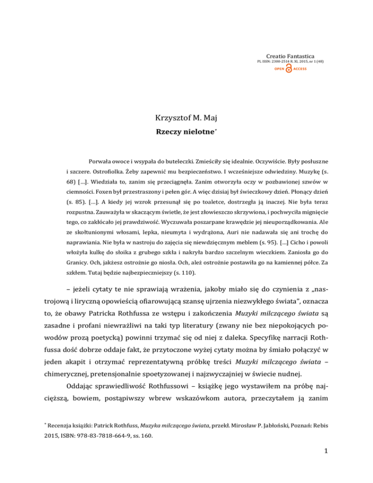Creatio Fantastica PL ISSN: 2300-2514 R. XI, 2015, nr 1 (48) Krzysztof M. Maj Rzeczy nielotne* Porwała owoce i wsypała do buteleczki. Zmieściły się idealnie. Oczywiście. Były posłuszne i szczere. Ostrofiolka. Żeby zapewnić mu bezpieczeństwo. I wcześniejsze odwiedziny. Muzykę (s. 68) […]. Wiedziała to, zanim się przeciągnęła. Zanim otworzyła oczy w pozbawionej szwów w ciemności. Foxen był przestraszony i pełen gór. A więc dzisiaj był świeczkowy dzień. Płonący dzień (s. 85). […]. A kiedy jej wzrok przesunął się po toaletce, dostrzegła ją inaczej. Nie była teraz rozpustna. Zauważyła w skaczącym świetle, że jest złowieszczo skrzywiona, i pochwyciła mignięcie tego, co zakłócało jej prawdziwość. Wyczuwała poszarpane krawędzie jej nieuporządkowania. Ale ze skołtunionymi włosami, lepka, nieumyta i wydrążona, Auri nie nadawała się ani trochę do naprawiania. Nie była w nastroju do zajęcia się niewdzięcznym meblem (s. 95). […] Cicho i powoli włożyła kulkę do słoika z grubego szkła i nakryła bardzo szczelnym wieczkiem. Zaniosła go do Granicy. Och, jakżesz ostrożnie go niosła. Och, ależ ostrożnie postawiła go na kamiennej półce. Za szkłem. Tutaj będzie najbezpieczniejszy (s. 110). – jeżeli cytaty te nie sprawiają wrażenia, jakoby miało się do czynienia z „nastrojową i liryczną opowieścią ofiarowującą szansę ujrzenia niezwykłego świata”, oznacza to, że obawy Patricka Rothfussa ze wstępu i zakończenia Muzyki milczącego świata są zasadne i profani niewrażliwi na taki typ literatury (zwany nie bez niepokojących powodów prozą poetycką) powinni trzymać się od niej z daleka. Specyfikę narracji Rothfussa dość dobrze oddaje fakt, że przytoczone wyżej cytaty można by śmiało połączyć w jeden akapit i otrzymać reprezentatywną próbkę treści Muzyki milczącego świata – chimerycznej, pretensjonalnie spoetyzowanej i najzwyczajniej w świecie nudnej. Oddając sprawiedliwość Rothfussowi – książkę jego wystawiłem na próbę najcięższą, bowiem, postąpiwszy wbrew wskazówkom autora, przeczytałem ją zanim * Recenzja książki: Patrick Rothfuss, Muzyka milczącego świata, przekł. Mirosław P. Jabłoński, Poznań: Rebis 2015, ISBN: 978-83-7818-664-9, ss. 160. 1 zapoznałem się ze światem cyklu o magu Kvothem. Dlaczego? Dlatego, że tylko wówczas nie czyta się tej książki z pozycji bezkrytycznego fana cyklu, skłonnego do zachwycenia się nawet najbardziej bezwartościową fabułą tylko z tego względu, że – jak i sam Rothfuss bez pokrycia obiecuje we wstępie – może się z niej „dowiedzieć się czegoś więcej o ukrytych mechanizmach świata”. Jeśli ukryte mechanizmy świata Kronik ma jednak odkrywać ewidentnie autystyczna dziewczyna, mająca poważne trudności z pozasynestezyjnym opisem rzeczywistości – to nie wróży to zbyt dobrze temu światu i nie zachęca raczej do lektury czegokolwiek, w co będzie zaangażowana neurotyczna Auri. Wypełniające powieść elukubracje na temat klinicznego przypadku nerwicy natręctw, przejawiającego się w nieustannym przekładaniu przedmiotów z miejsca na miejsce czy raczej – przepraszam za ten krótkotrwały przejaw ignorancji – z n i e o d p o w i e d n i e g o miejsca w o d p o w i e d n i e miejsce, składają się na lekturę, która zabija nie tylko czas, ale i czytelnika. I to w dodatku z wyrafinowanym okrucieństwem, gdyż niemiłosiernie powoli. Wbrew pozorom nie są to czcze złośliwości malkontenta: w posłowiu autorskim w charakterze superaty pojawia się uwaga beta-readera, że „czuł silniejszy związek z przedmiotami nieożywionymi […] niż z pełnowymiarowymi postaciami w innych książkach”, która pada po rozbrajająco szczerej deklaracji autora, iż napisał portret na trzydzieści tysięcy słów, zawierający ośmiostronicowy opis produkcji mydła. Nie jestem w stanie kompetentnie zrecenzować Muzyki milczącego świata. Jest to przykład książki, o której znacznie więcej mógłby powiedzieć wzięty psychiatra czy terapeuta, ale na już nie biedny czytelnik czy jeszcze biedniejszy – bo do lektury przymuszony powinnością profesjonalną – krytyk. Ci ostatni rzec mogą tyle tylko, że książkę winno się omijać szerokim łukiem, jeśli tylko odczuwa się poznawczy rozdźwięk między entuzjastycznymi blurbami obwołującymi powieść „cudownie napisaną i balansującą na granicy poetyckości” a rozpoczynającą niniejszą recenzję kolekcją cytatów. Muzyka milczącego świata, jeśli odjąć od niej wszelkie konotacje z historią maga Kvothem, jest płodem obłąkanego umysłu, albowiem tylko w takim może narodzić się wizja, że studwudziestostronicowy pamiętnik z życia znerwicowanej anorektyczki błąkającej się po wilgotnych podziemiach Podspodzia, może być zajmującym dopełnieniem świata nierozwiniętego na kartach trylogii. Trud mojej lektury i znaczniejszy nawet odeń trud sporządzenia niniejszej recenzji niech będzie ostrzeżeniem dla wszystkich, którzy zanadto wezmą sobie do serca czołobitne blurby i zechcą mieć styczność z tzw. literaturą wysoką. Problem z literaturą wysoką zasadza się bowiem na tym samym, co ze 2 wspinaczką wysokogórską – wprawdzie dobrze jest mierzyć wysoko, ale dobrze jest też pamiętać, że upadki z dużych wysokości kończą się zwykle spektakularnie. 3