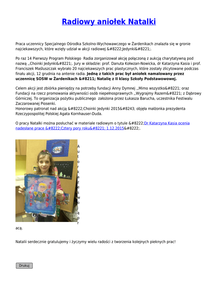 Radiowy aniołek Natalki Praca uczennicy Specjalnego Ośrodka Szkolno-Wychowawczego w Żardenikach znalazła się w gronie najciekawszych, które wzięły udział w akcji radiowej „Jedynki”. Po raz 14 Pierwszy Program Polskiego Radia zorganizował akcję połączoną z aukcją charytatywną pod nazwą ,,Choinki Jedynki”. Jury w składzie: prof. Danuta Kołwzan-Nowicka, dr Katarzyna Kasia i prof. Franciszek Maśluszczak wybrało 20 najciekawszych prac plastycznych, które zostały zlicytowane podczas finału akcji, 12 grudnia na antenie radia. Jedną z takich prac był aniołek namalowany przez uczennicę SOSW w Żardenikach – Natalię z II klasy Szkoły Podstawowowej. Celem akcji jest zbiórka pieniędzy na potrzeby fundacji Anny Dymnej ,,Mimo wszystko” oraz Fundacji na rzecz promowania aktywności osób niepełnosprawnych ,,Wygrajmy Razem” z Dąbrowy Górniczej. To organizacja pożytku publicznego założona przez Łukasza Barucha, uczestnika Festiwalu Zaczarowanej Piosenki. Honorowy patronat nad akcją „Choinki Jedynki 2015″ objęła małżonka prezydenta Rzeczypospolitej Polskiej Agata Kornhauser-Duda. O pracy Natalki można posłuchać w materiale radiowym o tytule „Dr Katarzyna Kasia ocenia nadesłane prace „Cztery pory roku” 1.12.2015„. A u t o r k a z e s w o j ą p r acą. Natalii serdecznie gratulujemy i życzymy wielu radości z tworzenia kolejnych pieknych prac! Drukuj