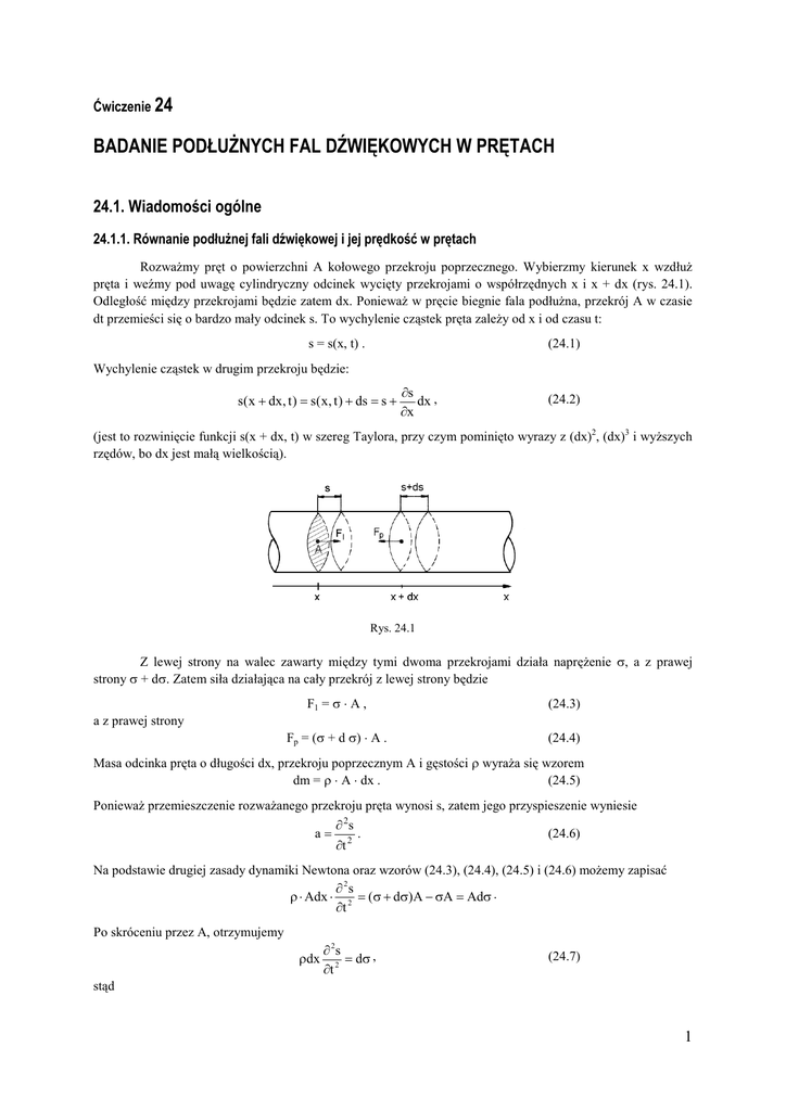 Ćwiczenie 24 BADANIE PODŁUŻNYCH FAL DŹWIĘKOWYCH W PRĘTACH 24.1. Wiadomości ogólne 24.1.1. Równanie podłużnej fali dźwiękowej i jej prędkość w prętach Rozważmy pręt o powierzchni A kołowego przekroju poprzecznego. Wybierzmy kierunek x wzdłuż pręta i weźmy pod uwagę cylindryczny odcinek wycięty przekrojami o współrzędnych x i x + dx (rys. 24.1). Odległość między przekrojami będzie zatem dx. Ponieważ w pręcie biegnie fala podłużna, przekrój A w czasie dt przemieści się o bardzo mały odcinek s. To wychylenie cząstek pręta zależy od x i od czasu t: s = s(x, t) . (24.1) Wychylenie cząstek w drugim przekroju będzie: s( x + dx, t ) = s( x, t ) + ds = s + ∂s dx , ∂x (24.2) (jest to rozwinięcie funkcji s(x + dx, t) w szereg Taylora, przy czym pominięto wyrazy z (dx)2, (dx)3 i wyższych rzędów, bo dx jest małą wielkością). Rys. 24.1 Z lewej strony na walec zawarty między tymi dwoma przekrojami działa naprężenie σ, a z prawej strony σ + dσ. Zatem siła działająca na cały przekrój z lewej strony będzie F1 = σ ⋅ A , (24.3) Fp = (σ + d σ) ⋅ A . (24.4) a z prawej strony Masa odcinka pręta o długości dx, przekroju poprzecznym A i gęstości ρ wyraża się wzorem dm = ρ ⋅ A ⋅ dx . (24.5) Ponieważ przemieszczenie rozważanego przekroju pręta wynosi s, zatem jego przyspieszenie wyniesie a= ∂ 2s ∂t 2 . (24.6) Na podstawie drugiej zasady dynamiki Newtona oraz wzorów (24.3), (24.4), (24.5) i (24.6) możemy zapisać ∂ 2s ρ ⋅ Adx ⋅ 2 = (σ + dσ)A − σA = Adσ . ∂t Po skróceniu przez A, otrzymujemy ρdx ∂ 2s = dσ , ∂t 2 (24.7) stąd 1 ρ ∂ 2s ∂σ = ∂t 2 ∂x (24.8) (w równaniu (24.8) piszemy pochodną cząstkową ∂σ/∂x, gdyż σ jest funkcją nie tylko x, ale również t). Skorzystamy teraz z prawa Hooke’a, wiążącego naprężenie σ z wydłużeniem względnym ∆l/l ∆l (24.9) σ=E , l0 gdzie E jest modułem Younga. W rozważanym przypadku odcinka pręta o długości l0 = dx, wydłużenie wynosi ∆l = ds = czyli l0 = dx oraz ∆l = ∂s dx , ∂x ∂s ⋅ dx . ∂x (24.10) Wstawiając wyrażenie (24.10) do równania (24.9), otrzymujemy σ=E ∂s , ∂x stąd ∂σ ∂ 2s =E 2 . ∂x ∂x (24.11) Ostatecznie z równań (24.8) i (24.11) otrzymujemy równanie różniczkowe ∂ 2s E ∂ 2s , = ⋅ ∂t 2 ρ ∂x 2 (24.12) które jest równaniem fali sprężystej o ogólnej postaci 2 ∂ 2s 2 ∂ s , = v ∂t 2 ∂x 2 przy czym: v= E ρ (24.13) (24.14) jest prędkością rozchodzenia się fali podłużnej w ośrodku, z którego jest wykonany pręt. 24.1.2. Drgania wymuszone pręta zamocowanego w środku. Rezonans Wymuszając drgania jednego z końców pręta, powodujemy rozchodzenie się w pręcie fali zaburzeń o częstotliwości siły wymuszającej. Obserwując drgania drugiego końca pręta stwierdzamy, że ze wzrostem częstotliwości gwałtownie wzrasta amplituda drgań pręta, osiągając wartość maksymalną przy pewnej częstotliwości f0. Przy dalszym wzroście częstotliwości siły wymuszającej ma miejsce szybki spadek amplitudy, przechodzący następnie w metastabilny, ale monotonicznie powolny wzrost amplitudy drgań (rys. 7.2). Taki przebieg zmian amplitudy drgań końców pręta w funkcji częstotliwości f siły wymuszającej (krzywa rezonansowa) może być wyjaśniony powstaniem przy częstotliwości f0, podłużnej fali stojącej o długości fali równej długości pręta (rys. 7.3a). Nieregularny wzrost amplitudy przy wyższych częstotliwościach związany jest z pobudzeniem wyższych harmonicznych podłużnych fal stojących (tzn. takich, przy których długość pręta jest równa odpowiednio trzem, pięciu, siedmiu, ... itd. długościom fali stojącej) oraz stojących fal poprzecznych. 2 amplituda A [mm] A max A max ∆1 2 częstotliwość f [Hz] fo Rys. 24.2 Częstotliwość f0 nazywamy pierwszą (podstawową) częstotliwością rezonansową dla fal podłużnych w pręcie. Jej wartość posłuży nam do wyznaczenia prędkości fali podłużnej w materiale, z którego wykonano pręt. Fala stojąca powstaje w pręcie na skutek interferencji fali wymuszonej przez siłę działającą na jeden koniec pręta z falą odbitą od drugiego końca pręta (odbicie od ośrodka rzadszego – bez zmiany fazy). W ten sposób na końcach pręta powstaną strzałki, a w środku pręta węzeł (punkt mocowania jest nieruchomy). Sytuację taką schematycznie przedstawia rys. 24.3a dla drgania podstawowego (n = 1). Rys. 24.3b przedstawia rozkład fali stojącej dla trzeciej harmonicznej (liczba fal stojących w pręcie n = 3). Rys. 24.3 Długość fali stojącej równa jest połowie długości fali bieżącej λ. Dla pierwszej częstotliwości rezonansowej wyniesie ona λ (24.15) = L. 2 Z drugiej strony długość fali λ równa jest ilorazowi prędkości fali v i jej częstotliwości f: v (24.16) λ= . f Z równań (24.15) i (24.16) dla warunków pierwszego rezonansu otrzymamy v = 2Lf0 . (24.17) Szerokość połówkowa ∆1/2, tj. szerokość maksimum rezonansowego dla częstotliwości f0, zmierzona w połowie wysokości tego maksimum (rys.24.2), jest tym większa, im większa jest zdolność tłumienia fal dźwiękowych przez materiał pręta. 3 24.2. Zadania 24.2.1. Zmierzyć i wykreślić zależność amplitudy drgań od częstotliwości dla każdego z badanych prętów. Wyznaczyć częstotliwość rezonansową f0. 24.2.2. Wyznaczyć prędkości dźwięku w badanych prętach. 24.2.3. Obliczyć moduły Younga dla tych prętów. 24.3. Zasada i przebieg pomiarów Prędkość rozchodzenia się fali podłużnej w pręcie wyznaczamy na podstawie wzoru (24.17), posługując się układem pomiarowym przedstawionym schematycznie na rysunku 24.4. Pręt Pr, leżący na elastycznych wspornikach W, które nie tłumią w istotny sposób jego drgań, dotyka częścią czołową, lekko posmarowaną smarem silikonowym (S), powierzchni przetwornika piezoelektrycznego P. G S P1 Pr. Osc. P2 P W W 