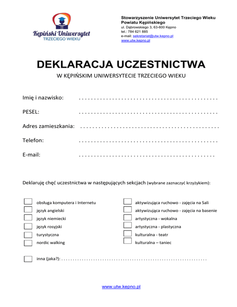 Stowarzyszenie Uniwersytet Trzeciego Wieku Powiatu Kępińskiego ul. Dąbrowskiego 3, 63-600 Kępno tel.: 784 621 885 e-mail: [email protected] www.utw.kepno.pl DEKLARACJA UCZESTNICTWA W KĘPIOSKIM UNIWERSYTECIE TRZECIEGO WIEKU Imię i nazwisko: .............................................. PESEL: .............................................. Adres zamieszkania: . . . . . . . . . . . . . . . . . . . . . . . . . . . . . . . . . . . . . . . . . . . . . . Telefon: .............................................. E-mail: ............................................. Deklaruję chęd uczestnictwa w następujących sekcjach (wybrane zaznaczyd krzyżykiem): obsługa komputera i Internetu aktywizująca ruchowo - zajęcia na Sali język angielski aktywizująca ruchowo - zajęcia na basenie język niemiecki artystyczna - wokalna język rosyjski artystyczna - plastyczna turystyczna kulturalna - teatr nordic walking kulturalna – taniec inna (jaka?): . . . . . . . . . . . . . . . . . . . . . . . . . . . . . . . . . . . . . . . . . . . . . . . . . . . . . . . . . . . . . . . . www.utw.kepno.pl Stowarzyszenie Uniwersytet Trzeciego Wieku Powiatu Kępińskiego ul. Dąbrowskiego 3, 63-600 Kępno tel.: 784 621 885 e-mail: [email protected] www.utw.kepno.pl Po zapoznaniu się z Regulaminem Kępioskiego Uniwersytetu Trzeciego Wieku przyjętego Uchwałą nr 10/2012 Walnego Zebrania Członków UTWPK z 19 czerwca 2012 r. oraz zgodnie z Uchwałą nr 1/2012 Zarządu Stowarzyszenia: Uniwersytet Trzeciego Wieku Powiatu Kępioskiego z 21 czerwca 2012 r. proszę o przyjęcie mnie w poczet słuchaczy KUTW w roku akademickim 2015/2016. Jednocześnie zobowiązuję się do uiszczenia „wpisowego” w wysokości 30,00 zł na rachunek bankowy (SBL w Kępnie) numer: 71 8413 0000 0021 3530 2000 0001 i przedłożę potwierdzenie wpłaty wraz z deklaracją. Zostałam(em) poinformowana(y), że jestem zobowiązana(y) do uiszczenia czesnego w łącznej wysokości 100,00 zł za dwa semestry, w terminie: a) I rata: 50,00 zł - do 10 października 2015 roku, b) II rata: 50,00 zł - do 10 lutego 2016 roku. Zobowiązuję się do terminowego wnoszenia opłat za wybrany pakiet zajęd w sekcjach zainteresowao w danym semestrze do 10 każdego miesiąca, w biurze KUTW. ................................ ................................... data czytelny podpis Oświadczam, że zgodnie z art. 23 ust 1 pkt 1 ustawy z 29 sierpnia 1997 roku o ochronie danych osobowych (tekst jednolity: Dz. U. z 2002 r. Nr 101, poz. 926 ze zm.) wyrażam zgodę na przetwarzanie moich danych przez Kępioski Uniwersytet Trzeciego Wieku. ................................ ................................... data czytelny podpis www.utw.kepno.pl