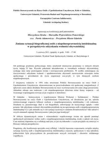 Polskie Stowarzyszenie na Rzecz Osób z Upośledzeniem Umysłowym, Koło w Gdańsku, Uniwersytet Gdański, Pracownia Badań nad Niepełnosprawnością w Dorosłości, Europejskie Centrum Solidarności, Gdański Archipelag Kultury zapraszają na konferencję pod patronatem: Mieczysława Struka – Marszałka Województwa Pomorskiego oraz Pawła Adamowicza – Prezydenta Miasta Gdańska Zmiana sytuacji biograficznej osób z niepełnosprawnością intelektualną w perspektywie odzyskania wolności obywatelskiej 3 czerwca 2011, (piątek), w godz. 9.00 – 17.00 Uniwersytet Gdański, Wydział Nauk Społecznych, Gdańsk, ul. Bażyńskiego 4 Od polskiego przełomu politycznego, który uruchomił intensywne przemiany w różnych sferach życia, mijają 22 lata. Wyrosło pokolenie ukształtowane w warunkach wolności obywatelskiej, zyskując inne ramy postrzegania świata i rozwiązywania problemów. W szybko zmieniającej się rzeczywistości odzyskana wolność i upodmiotowienie obywateli zaowocowało rozwojem ruchu społecznego i powołaniem do życia organizacji non-profit, w tym służących osobom niepełnosprawnym. Z inicjatywy rodziców w 1991 roku utworzono Polskie Stowarzyszenie na rzecz Osób z Upośledzeniem Umysłowym, skoncentrowane na przeciwdziałaniu ich społecznej marginalizacji. Z upływem czasu zakres działania Stowarzyszenia na rzecz wyrównywania ich szans ulega poszerzeniu. Aktualnie oferuje ono rodzicom i ich niepełnosprawnym dzieciom różne formy wsparcia – od wczesnego wspomagania rozwoju aż po wsparcie w dorosłości. W Gdańsku – historycznym i współczesnym Mieście Wolności i Solidarności – Polskie Stowarzyszenie na rzecz Osób z Upośledzeniem Umysłowym, od dwudziestu już lat, udziela zróżnicowanego wsparcia kilkuset osobom z niepełnosprawnością intelektualną i ich rodzinom. Działanie to, pozostawiając ślad w ich biografiach, zobowiązuje do krytycznego oglądu i rodzi pytania: Jak odzyskana wolność obywatelska przekłada się na egzystencję osób z niepełnosprawnością intelektualną? Co i jak zmieniło się w ich sytuacji życiowej w ostatnim dwudziestoleciu? Jaki udział w owych zmianach zajmuje Stowarzyszenie i jaka jest jego kondycja? W obliczu dynamicznych zmian i różnorodności współczesnego świata nie sposób pominąć społecznych powinności wobec osób z niepełnosprawnością intelektualną, troski o jakość ich życia. Czas miniony dopomina się o refleksję nad tym, co już się dokonało i z czym przyjdzie się zmierzyć w bliższej i dalszej perspektywie. Pragniemy, aby konferencja sprzyjała owej refleksji i służyła lepszemu rozpoznaniu związku między sytuacją życiową osób z niepełnosprawnością intelektualną a naszym, społecznym w niej udziałem; jednocześnie była przyczynkiem do poszukiwania nowych rozwiązań i obszarów solidarnego współbycia. Zapraszamy do wysłuchania wystąpień w sesji plenarnej, a w drugiej części konferencji do rozmów, czyli spotkania w konwencji Otwartej Przestrzeni, pozwalającej stawiać pytania i wspólnie poszukiwać na nie odpowiedzi. Komitet organizacyjny: Joanna Cwojdzińska – Przewodnicząca Koła PSOUU w Gdańsku Dorota Krzemińska – Uniwersytet Gdański Iwona Lindyberg – Uniwersytet Gdański Patrycja Medowska - Europejskie Centrum Solidarności Ryszard Popowski – PSOUU Jarosław Rebeliński – Gdański Archipelag Kultury Krystyna Rzedzicka – Uniwersytet Gdański Magdalena Skiba – Urząd Miejski Gdańsk PROGRAM Zmiana sytuacji biograficznej osób z niepełnosprawnością intelektualną w perspektywie odzyskania wolności obywatelskiej 3 czerwca 2011, (piątek), w godz. 9.00 – 17.00 Uniwersytet Gdański, Wydział Nauk Społecznych, Gdańsk, ul. Bażyńskiego 4 9.00 – 9.30 Rejestracja 9.30 Otwarcie konferencji 10.00 – 13.15 Sesja Plenarna – sala S 205 10.00 Wykład wprowadzający Michał Boni – Zespół Doradców Strategicznych Premiera 10.35 Niepełnosprawni intelektualnie czy upośledzeni umysłowo – różne terminologie, różne filozofie życiowe Prof. Elżbieta Zakrzewska–Manterys – Instytut Stosowanych Nauk Społecznych UW 11.10 Paradoks upełnomocnienia niepełnosprawnych intelektualnie Dr Krystyna Rzedzicka – Instytut Pedagogiki UG 11.40 Starość osób z upośledzeniem umysłowym w różnych kontekstach społecznych Dr Agnieszka Kumaniecka-Wiśniewska Instytut Stosowanych Nauk Społecznych UW 12.10 Przerwa na kawę 12.25 Rozwój rzecznictwa interesów osób z niepełnosprawnością intelektualną po transformacji ustrojowej - wyzwania jakie dziś stają przed organizacjami rzeczniczymi. Magdalena Skiba – Caravan 2000 – International Federation, Europejski Ruch na Rzecz Różnorodności i Zrozumienia „Karawana 2000”, Urząd Miejski w Gdańsku 12.50 Amatorska kultura muzyczna osób z niepełnosprawnością intelektualną –spełnienie życia publicznego Dr Ryszard Popowski – Instytut Muzyki Wydziału Sztuki UWM 13.25 Rodzic z dzieckiem niepełnosprawnym w dobie Internetu 13.45 Przerwa – lunch Joanna Jaworska-Kotarska – „Ja też” –sekcja rodziców dzieci z zespołem Downa PSOUU, koło Gdańsk 14.30 – 17.00 Granice samostanowienia – na czym polega dobre wspieranie osób z niepełnosprawnością intelektualną - otwarta debata prowadzona metodą „przestrzeni otwartej” (Open Space) – sala A209-210, A201, A202 14.30 Wprowadzenie do metody „przestrzeni otwartej” 14.45 Teatr obrazu – sceny z życia osoby z niepełnosprawnością intelektualną 15.00 Dyskusja w grupach 16.30 Podsumowanie dyskusji 17.00 Zakończenie konferencji Ewelina Wilk, Jarosław Rebeliński – Gdański Archipelag Kultury Teatr „RAZEM” – reż. Jarosław Rebeliński Technologia Otwartej Przestrzeni Teatr Obrazu w wykonaniu Teatru Razem. Dlaczego Otwarta Przestrzeń? Otwarta Przestrzeń znajduje zastosowanie wszędzie tam, gdzie temat spotkania stanowi istotną kwestię dla wszystkich osób biorących w nim udział. Kw
